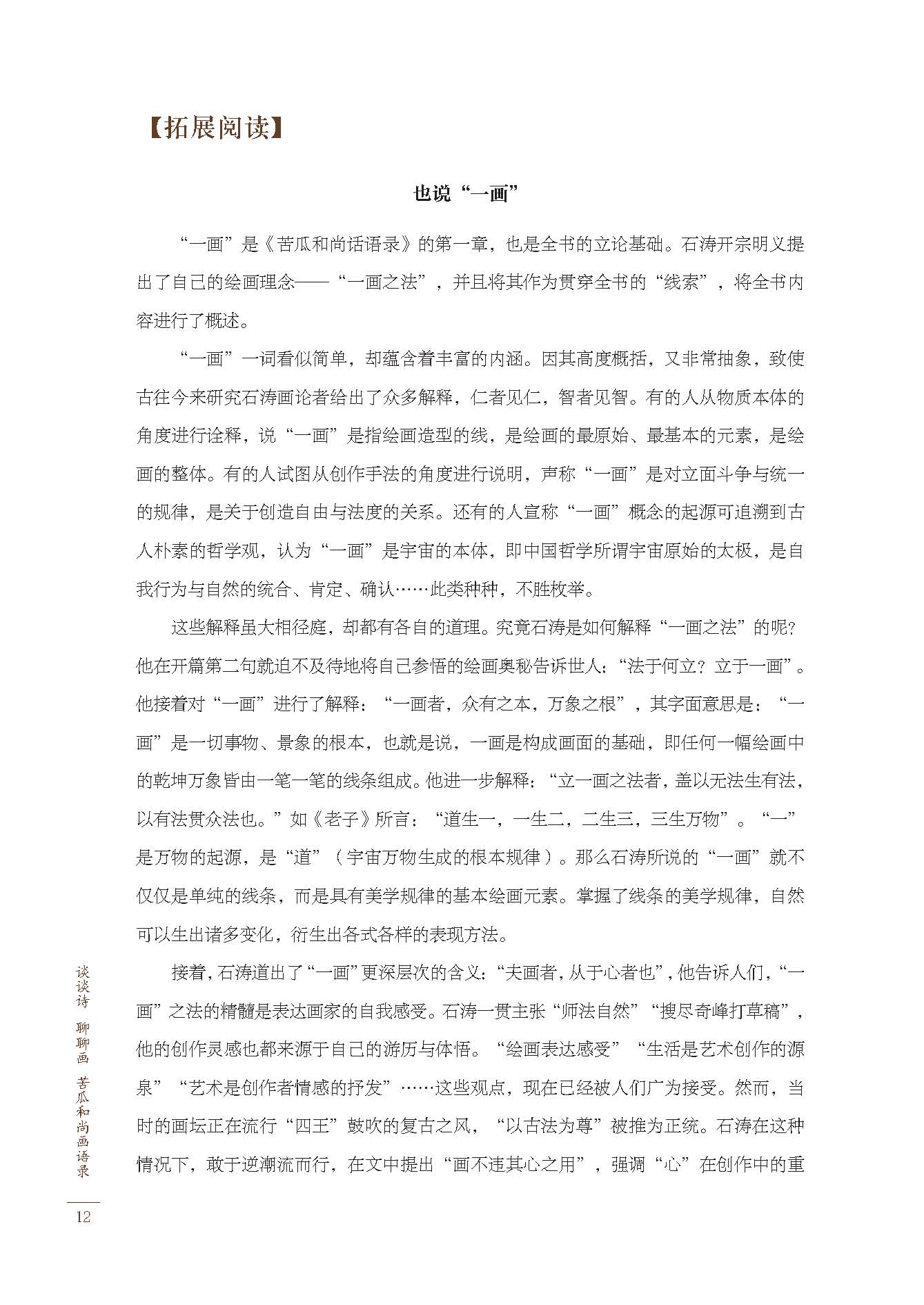 為了使讀者更全面地了解石濤的繪畫理論,本書在每個(gè)篇章之后附短文一篇作為拓展閱讀,內(nèi)容涉及石濤的人生經(jīng)歷、藝術(shù)生涯、生平趣事及其畫論、畫作,以及他在其他藝術(shù)領(lǐng)域取得的成就等,全方位地為讀者介紹了這位畫壇巨匠。
