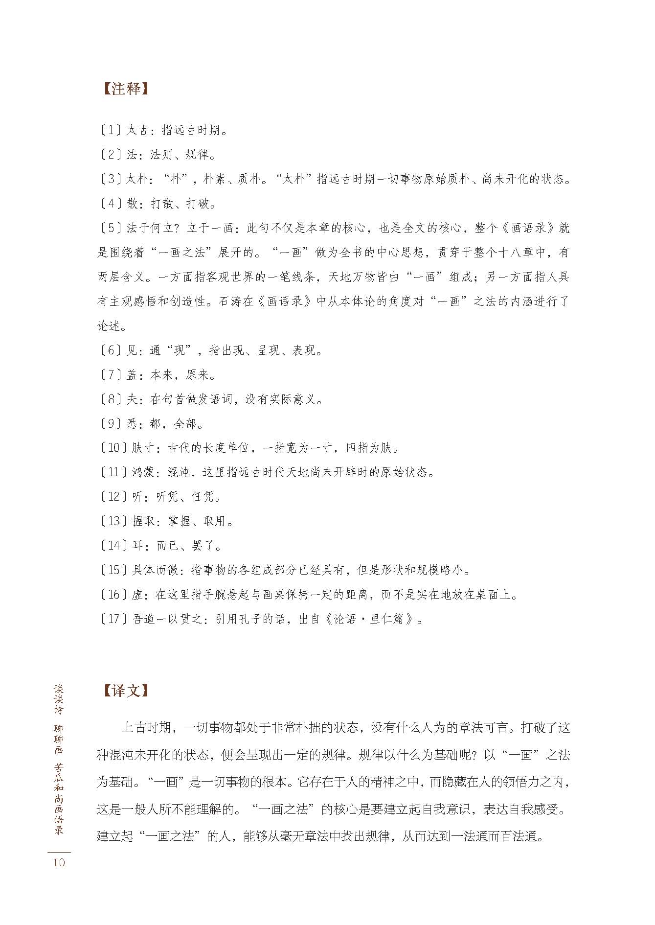 在保證原典準(zhǔn)確的基礎(chǔ)上,我們重新加入譯文,力追古文意境。同時(shí)在每一章之后加入拓展閱讀,陪你一起走過石濤生活年代的點(diǎn)點(diǎn)滴滴。