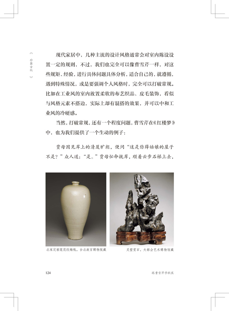 本書將陳設(shè)藝術(shù)和經(jīng)典文學(xué)作品相結(jié)合,通過提煉《紅樓夢》中榮寧兩府和大觀園的室內(nèi)陳設(shè)藝術(shù),結(jié)合我國傳統(tǒng)文化,給讀者呈現(xiàn)出別樣的中式裝飾氛圍,并引申到現(xiàn)代的居住環(huán)境中,將中式生活藝術(shù)更加自然地融入到尋常百姓家。其中較為全面地介紹了《紅樓夢》中的室內(nèi)裝飾,幾乎囊括所有主要人物的居住空間,結(jié)合不同的人物性格,將靜止的裝飾物賦予了情感和個性,角度新穎,深入淺出,對軟裝設(shè)計師來說不失為一本鑒賞與學(xué)習(xí)并重的書。