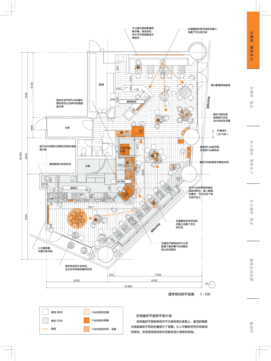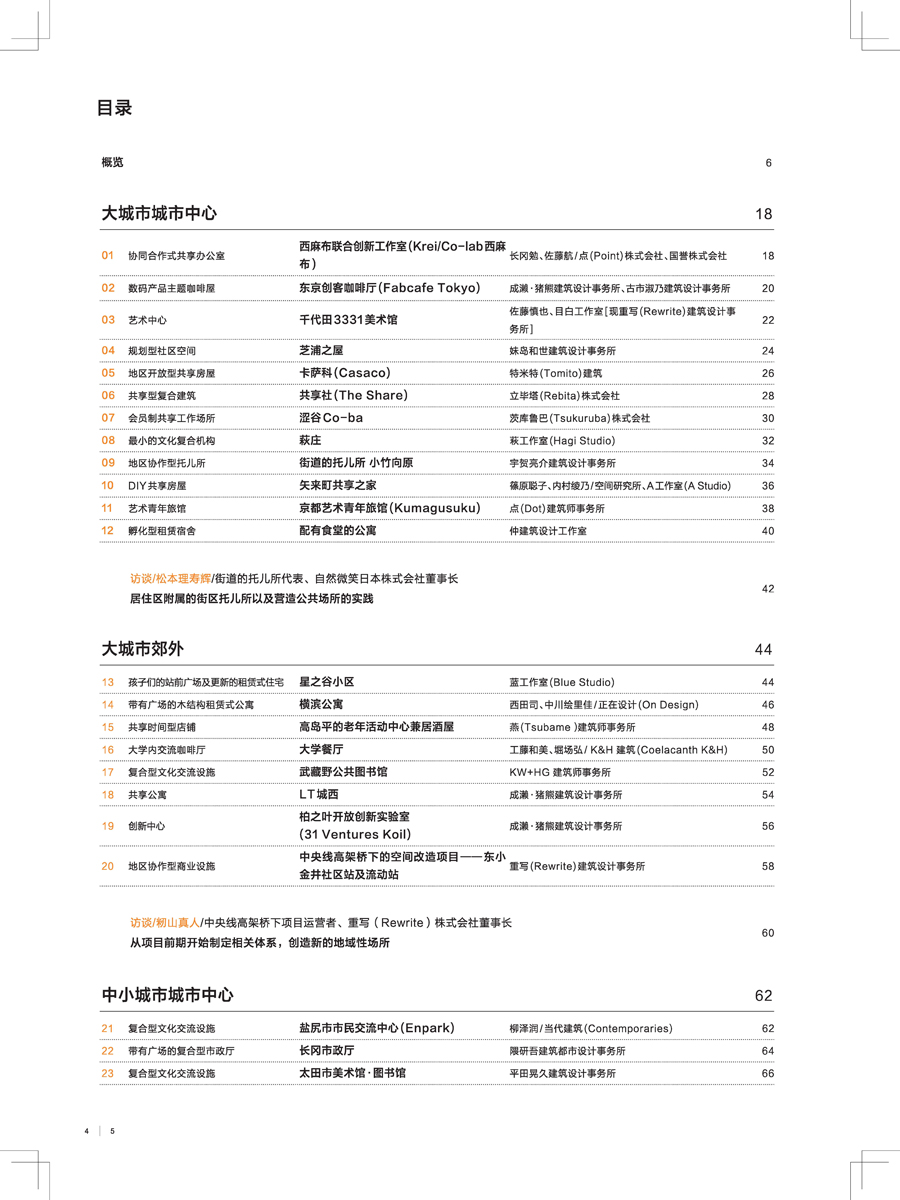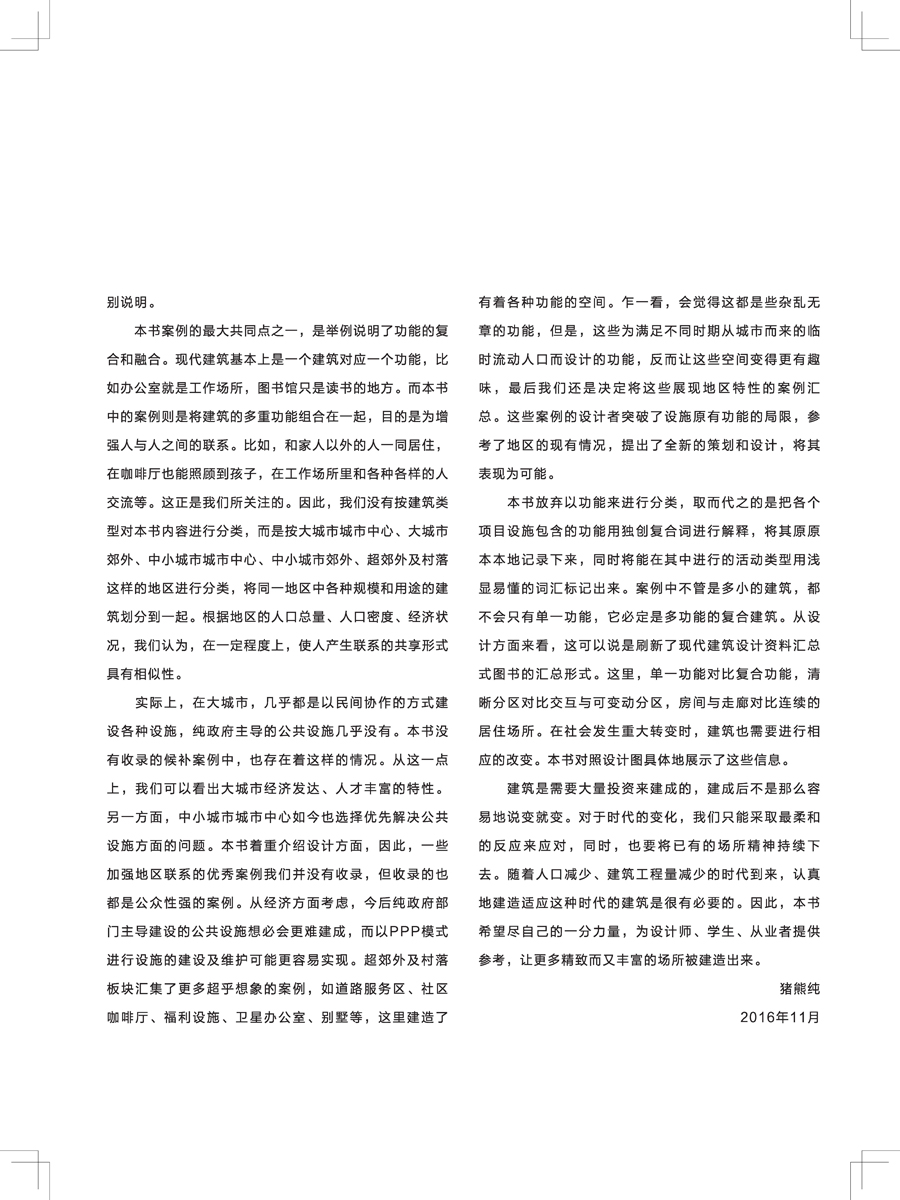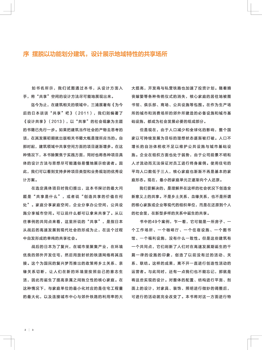 本書從設(shè)計(jì)方面入手,將“共享”空間的設(shè)計(jì)方法盡可能地展現(xiàn)出來,除聚焦于實(shí)踐方面,同時(shí)也將各種項(xiàng)目具體的設(shè)計(jì)思想盡可能通俗易懂地展示給讀者。近代建筑基本上是一個(gè)建筑對(duì)應(yīng)一個(gè)功能,如辦公室就是工作場(chǎng)所,圖書館只是讀書的地方,而本書精選的49個(gè)案例則是將建筑的多重功能組合在一起形成的共享式空間,目的是為增強(qiáng)人與人之間的聯(lián)系,如和家人以外的人一同居住,在咖啡廳也能照顧到孩子,在工作場(chǎng)所和工作人員以外的人交流等。全書分為五部分,按大城市·城市中心、大城市·郊外、中小城市·城市中心、中小城市·郊外、超郊外·村落這樣的地區(qū)進(jìn)行分類,將同一地區(qū)中各種規(guī)模和用途的建筑劃分到一起,為讀者提煉出各種地區(qū)不同的人口總量、人口密度、經(jīng)濟(jì)狀況下的共享相似性。