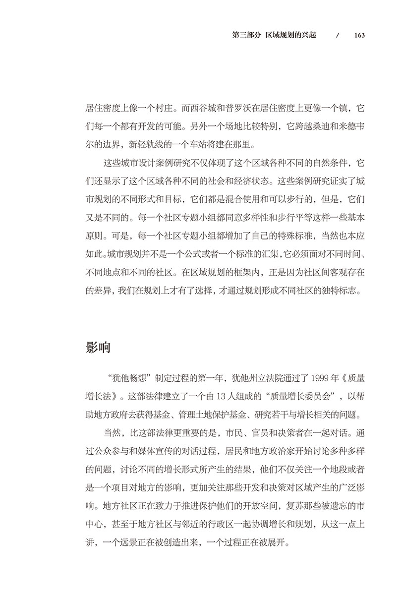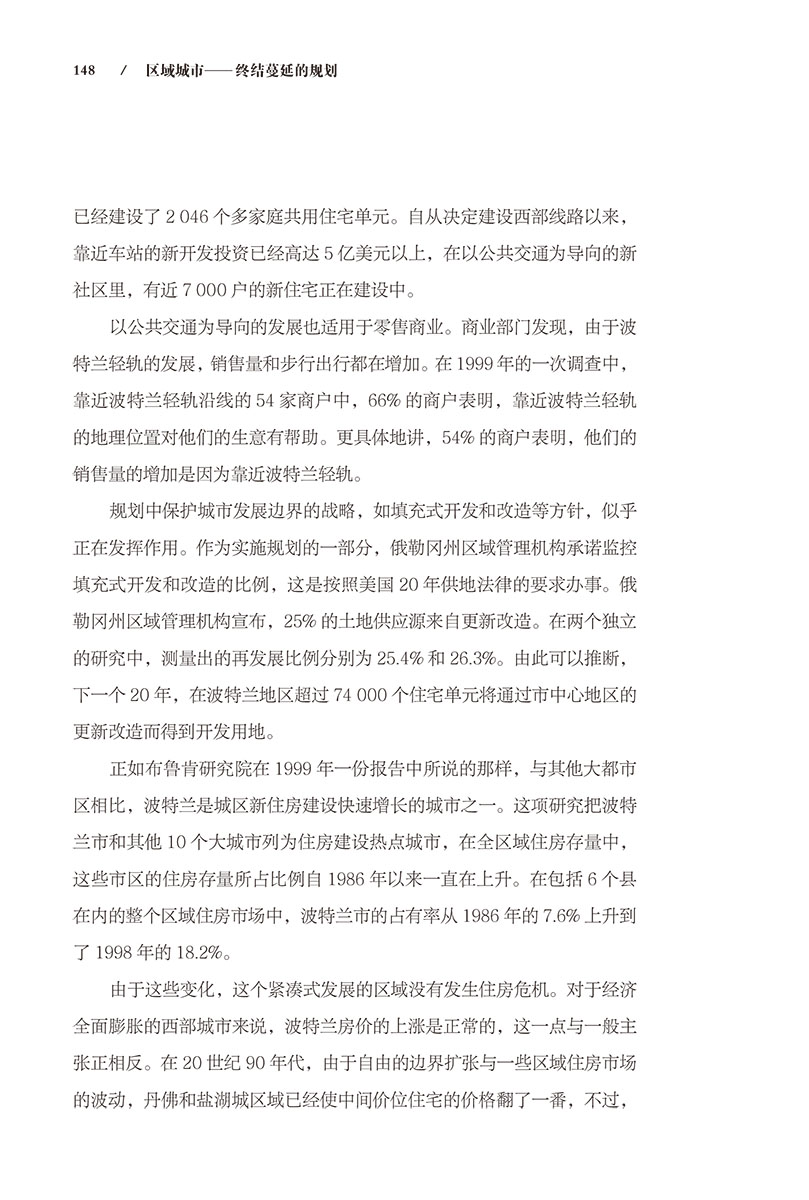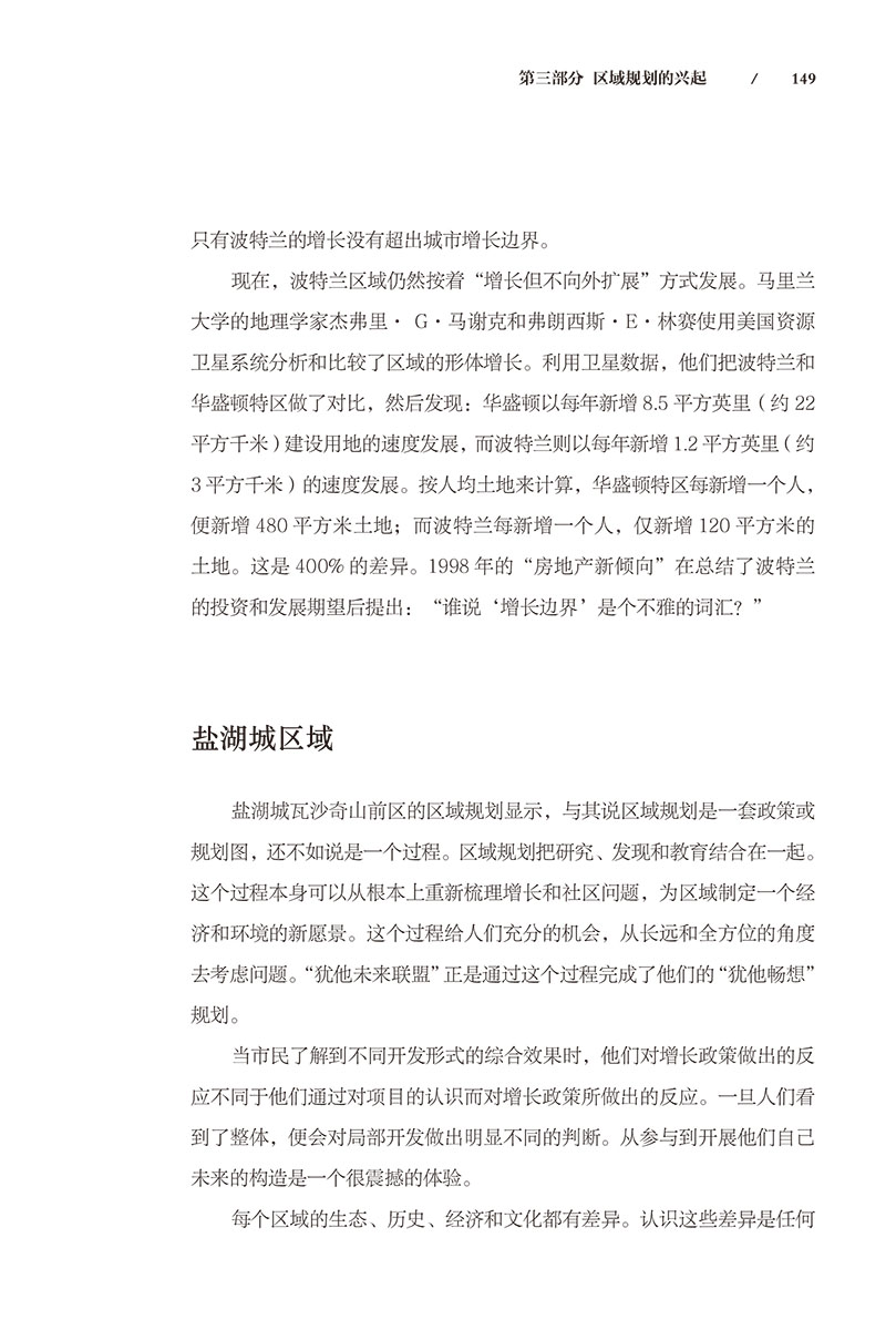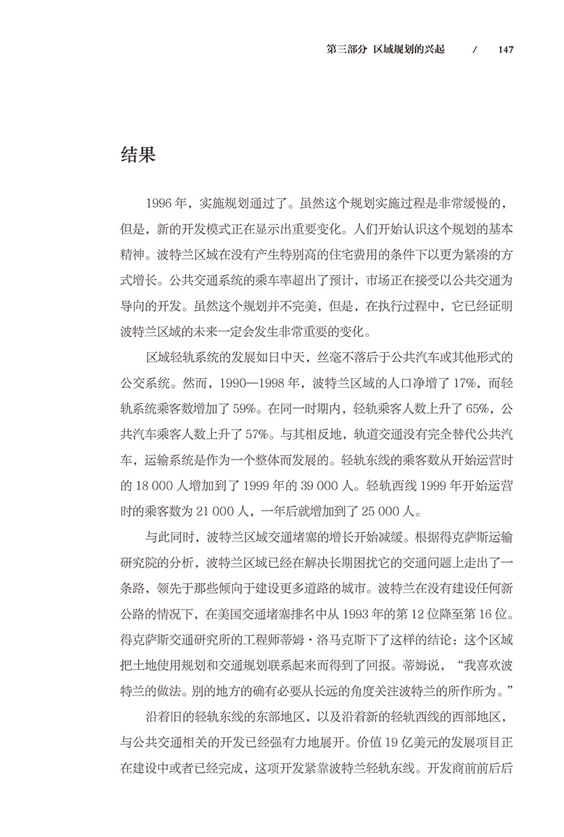 第三部分“區(qū)域規(guī)劃的興起”,記述了整個美國究竟有多少大都市正在通過形體設計、社會和經(jīng)濟政策向區(qū)域城市轉(zhuǎn)變。我們集中研究了三個走在最前列的區(qū)域城市:波特蘭、西雅圖和鹽湖城。我們也考慮到了在特大都市區(qū)域執(zhí)行區(qū)域尺度上的政策的困難,特別注意到美國州政府所扮演的潛在的角色,如佛羅里達、馬里蘭和明尼蘇達。