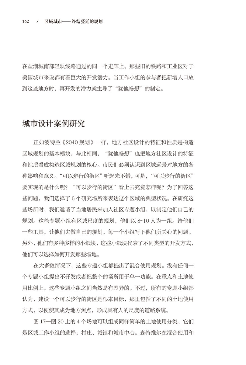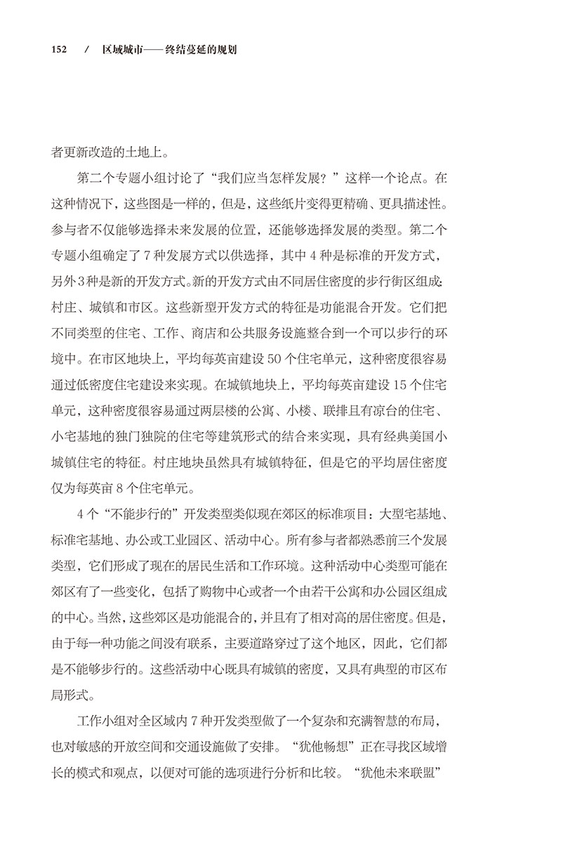 本書試圖提出區(qū)域城市的框架,考察正在興起的區(qū)域、正在展開的郊區(qū)以及得到更新改造的城區(qū)之間的關系。本書的第一部分“蔓延的終結(jié)”,提出了這種新都市形式的性質(zhì)和原則。我們認為,不能用傳統(tǒng)的城市和郊區(qū)的理論來解釋“區(qū)域城市”, 甚至也不能把新都市形式的原則解釋為政治司法的匯編。必須從經(jīng)濟、生態(tài)和社會的角度把“區(qū)域城市”看成一個單元,它由街坊和社區(qū)綜合而成,這些街坊和社區(qū)把大都市聯(lián)合成一個整體。