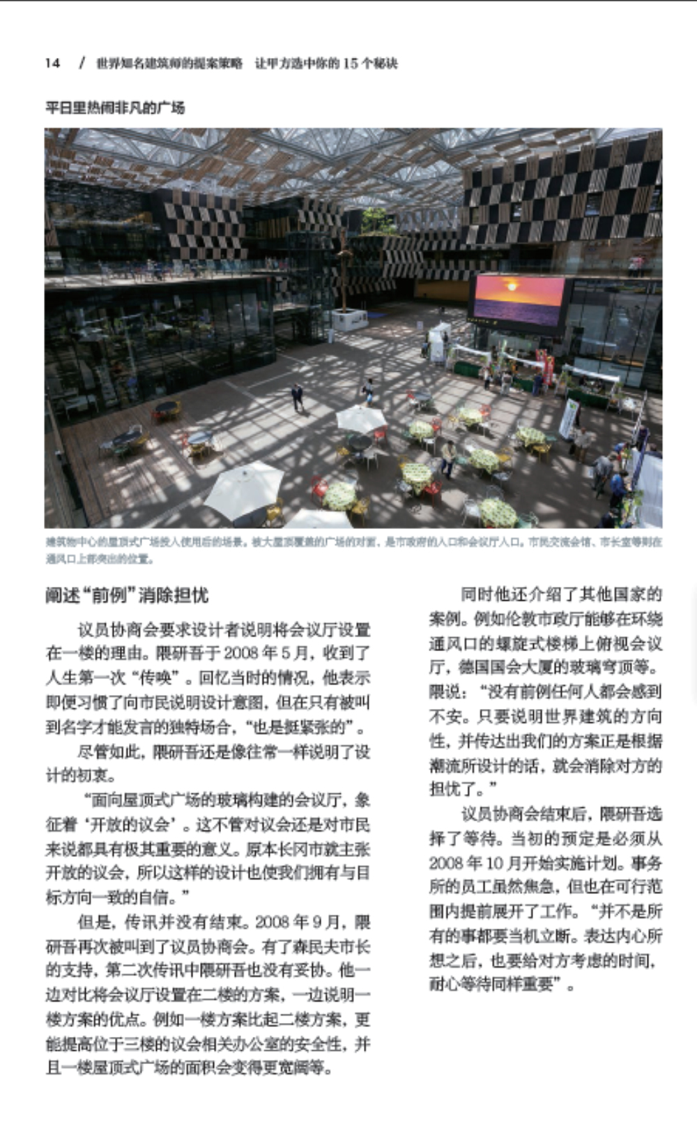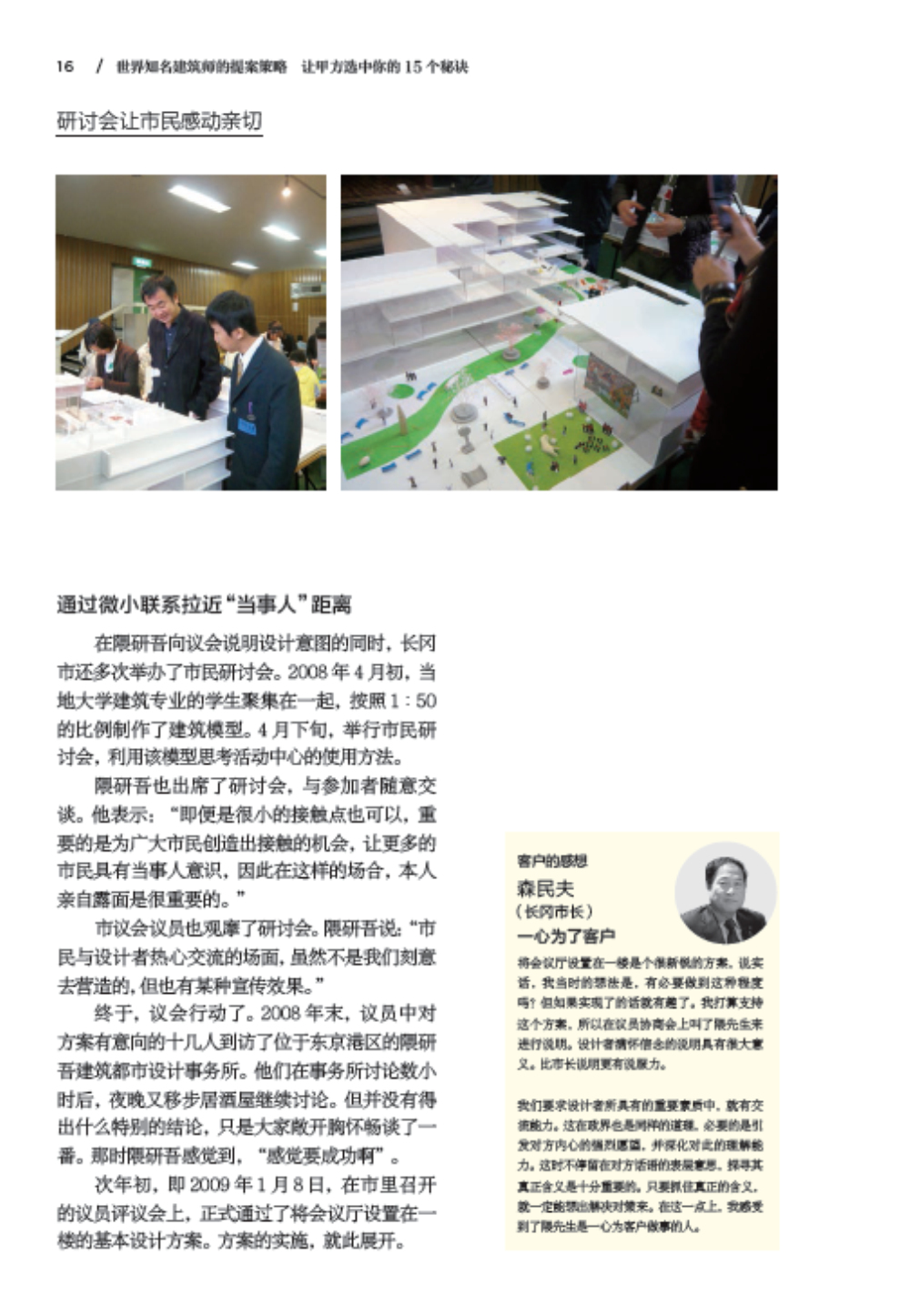 本書按照 “建筑師與客戶達(dá)成一致的過程”“獲得客戶認(rèn)可的方法”“獲得客戶信賴的訣竅”三個方面進(jìn)行取材,選取了隈研吾、原田哲夫、內(nèi)藤廣、伊東豐雄、東利惠、西田司、青木茂、大谷弘明、中村拓志、山梨和彥等知名建筑師,以及Coelacanth K&H、奧雅納公司、SALHAUS、克萊因?戴瑟姆建筑事務(wù)所等15組活躍在建筑界第一線的建筑師和建筑設(shè)計事務(wù)所的經(jīng)典中標(biāo)案例,進(jìn)行詳細(xì)剖析和解讀,并分享建筑大師們在創(chuàng)作作品時的秘訣以及他們向客戶推銷建筑策劃方案時的秘訣和要點(diǎn)。