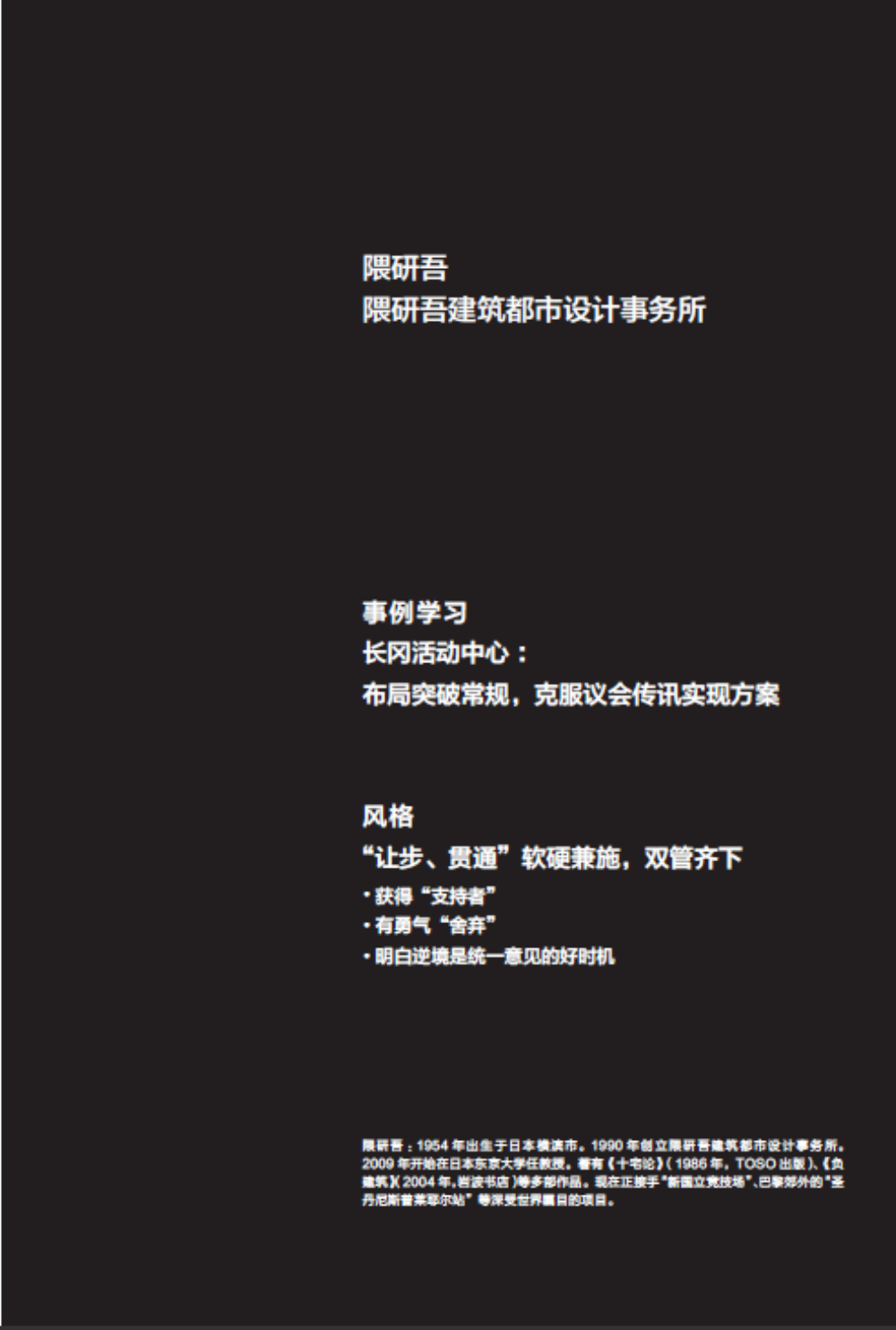 對建筑師和建筑系學(xué)生而言,不僅要掌握建筑設(shè)計相關(guān)的知識,更需要將知識和理論轉(zhuǎn)化為生產(chǎn)力,而這本書告訴建筑師如何將知識和理論運(yùn)用在建筑方案之中,如何獲得客戶的信任,從而中標(biāo),相信隈研吾、青木茂等頗負(fù)盛名的日本第一線建筑師分享的秘訣對國內(nèi)建筑師和學(xué)習(xí)建筑專業(yè)的學(xué)生也會有借鑒作用。