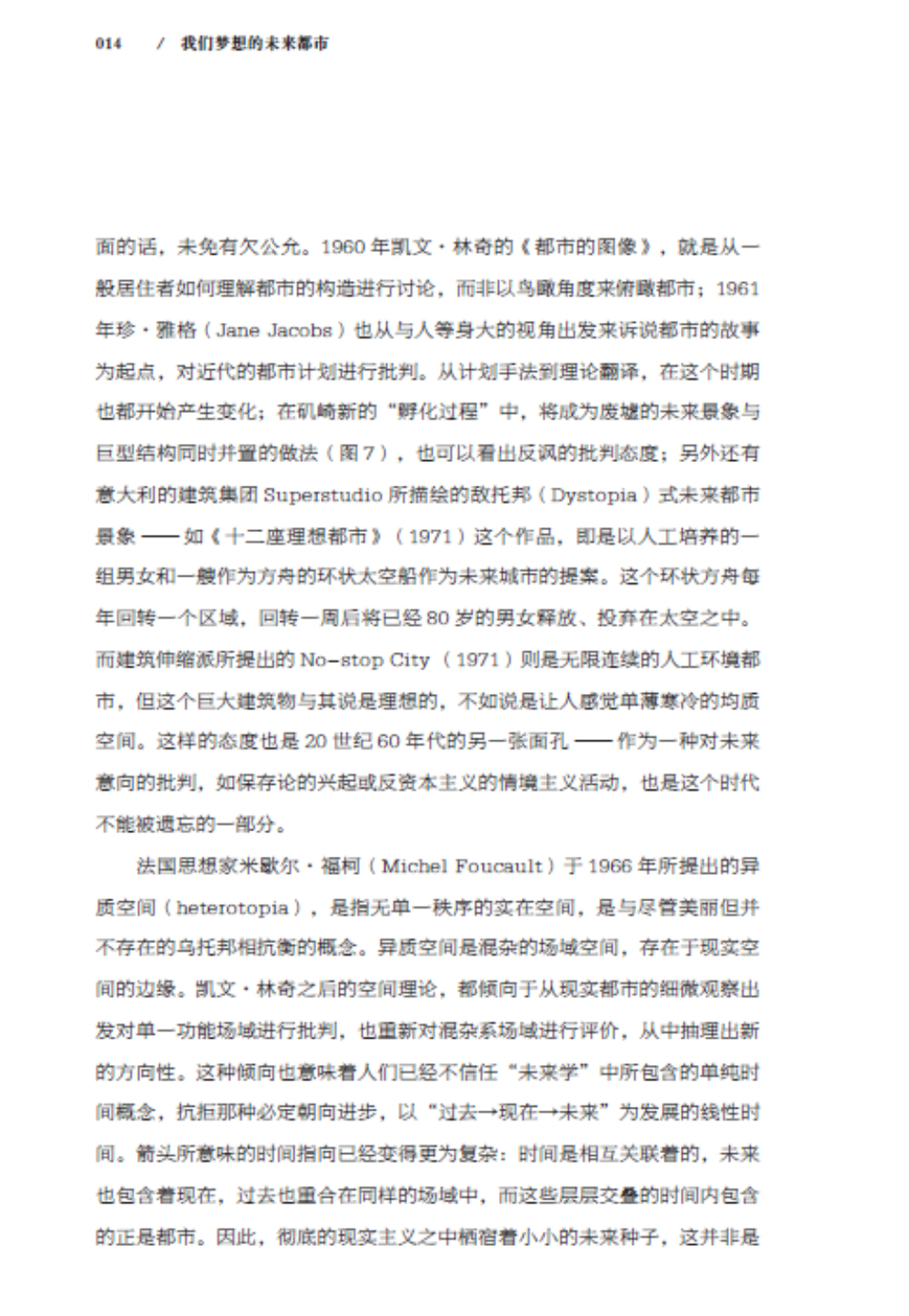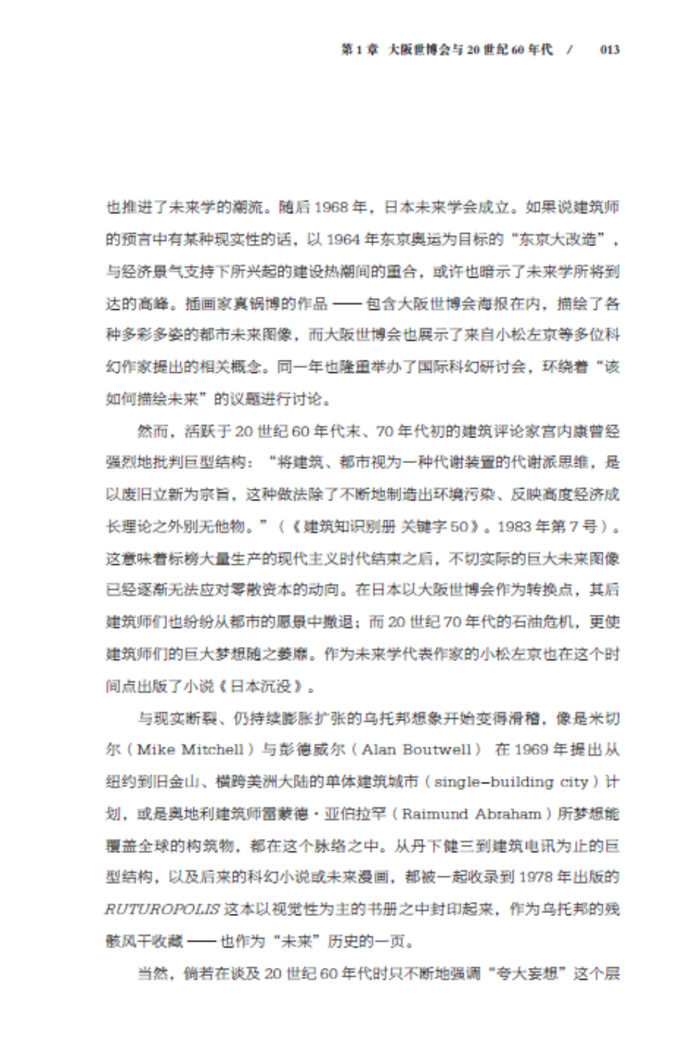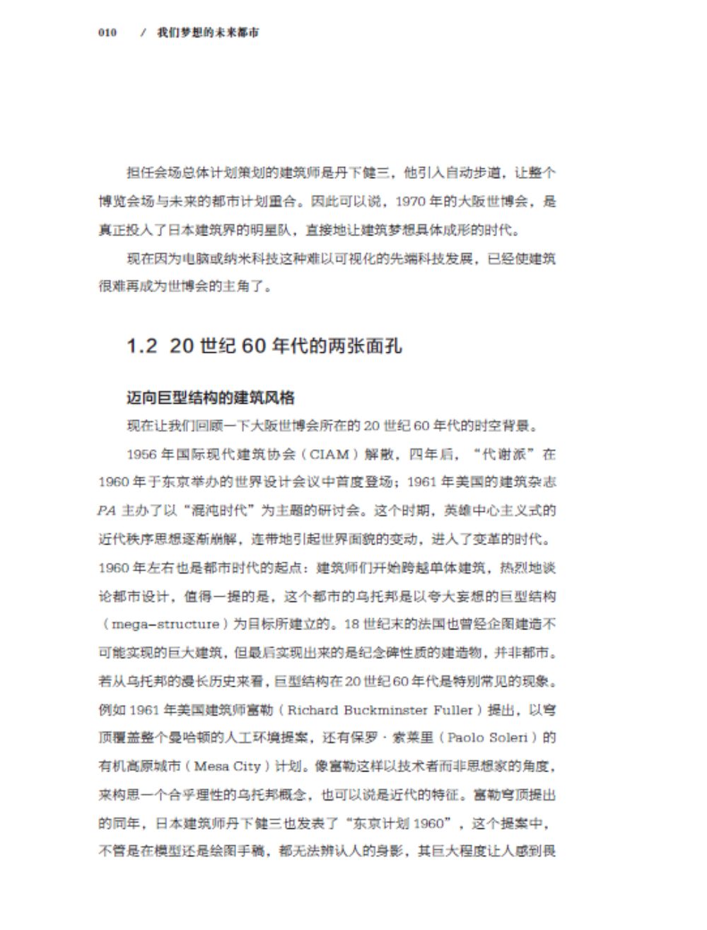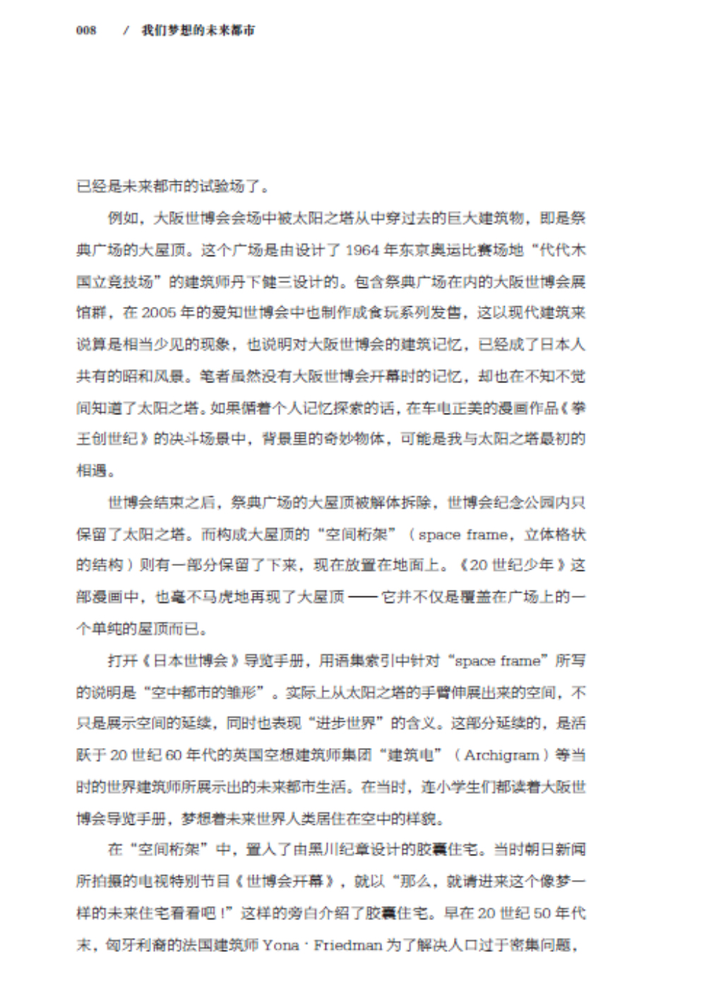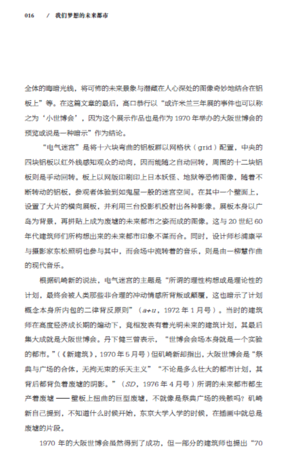本書共分為“大阪世博會與20 世紀60 年代”“未來的兩張面孔”“對于東京的想象力”“作為未來都市的東京”“近代烏托邦的系譜”“從烏托邦到科學”“亞洲與電腦”“虛擬空間的另一端”“21世紀視角與愛知縣世博會”九個章節(jié),詳細闡述了日本兩位建筑師五十嵐太郎和磯達雄結合1970年的大阪世博會和2010年的上海世博會對“未來都市”的思考和對城市未來的構想。