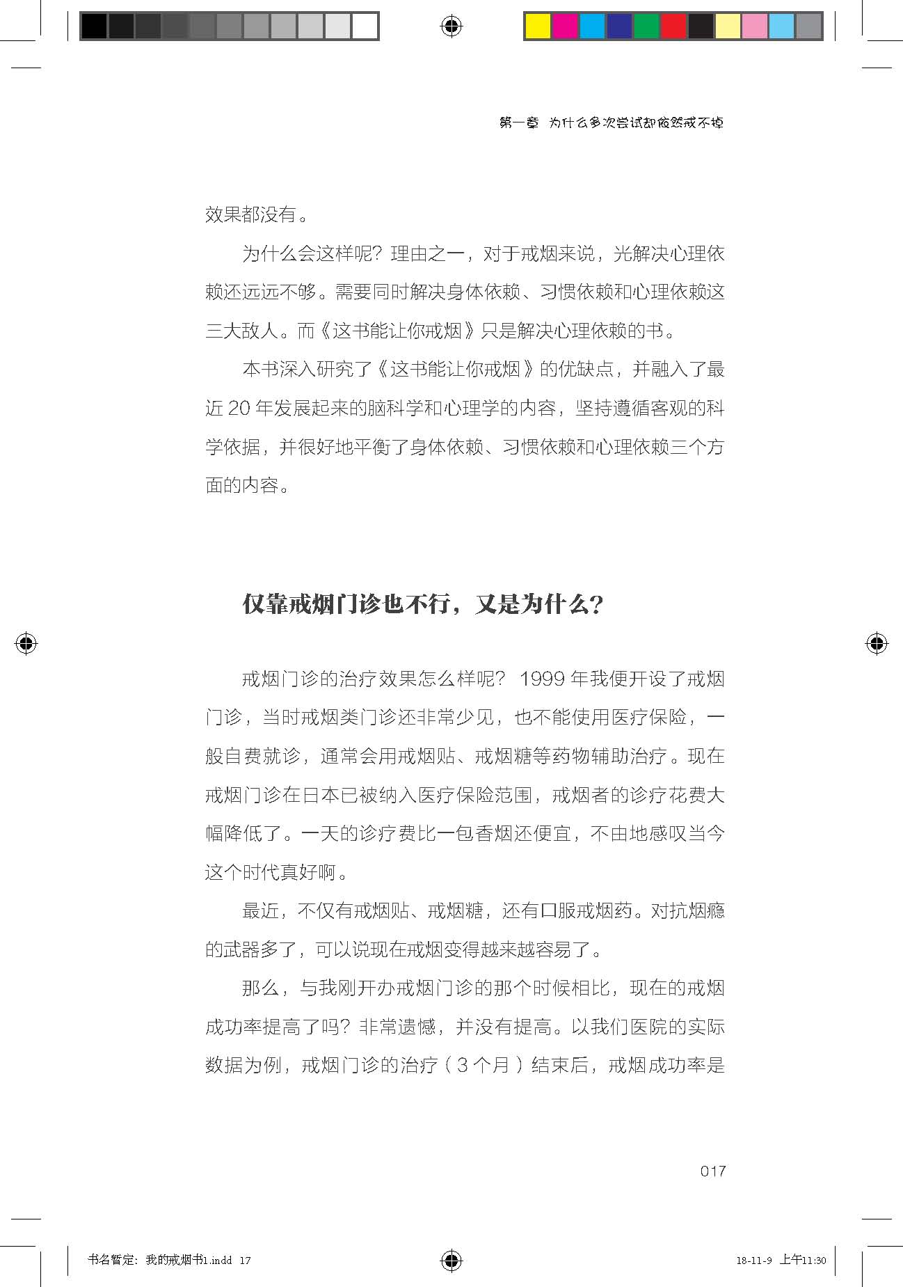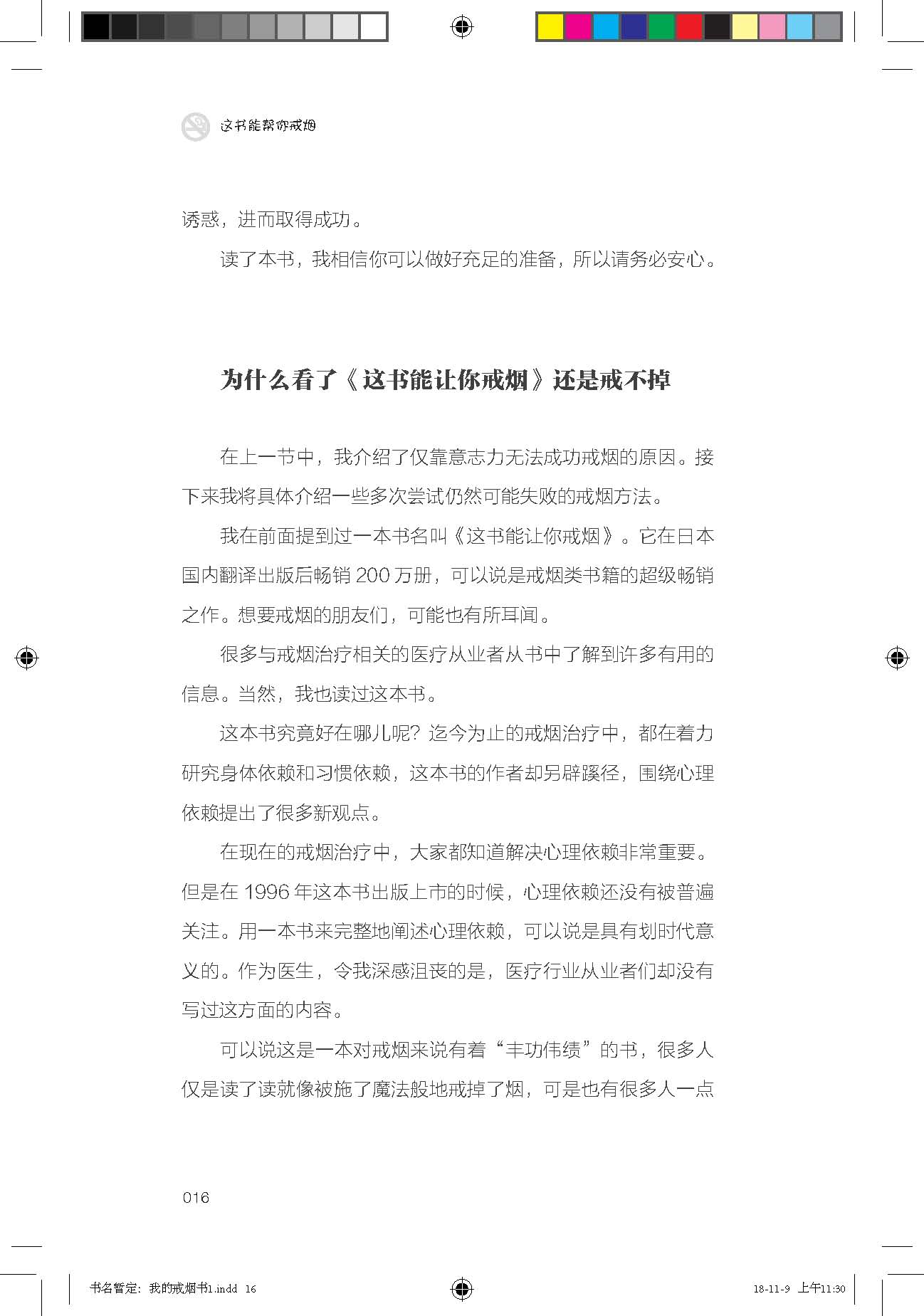 剛拿到這本書版權(quán)的時(shí)候,我有點(diǎn)猶豫,畢竟國(guó)內(nèi)《這書能讓你戒煙》已經(jīng)風(fēng)靡很多年了,珠玉在前,還有必要再做一本嗎?直到我看到序言的譯稿,我才堅(jiān)定了做這本書的信心。因?yàn)楸緯淖髡叽ň沃谛蜓岳锝榻B說,他也看過《這書能讓你戒煙》,覺得自己的研究比那本書更深入,增加了近幾年來腦科學(xué)和心理學(xué)的內(nèi)容,更有利于讀者理解吸煙成癮的原因,并借助心理學(xué)的知識(shí)和方法把煙戒掉。