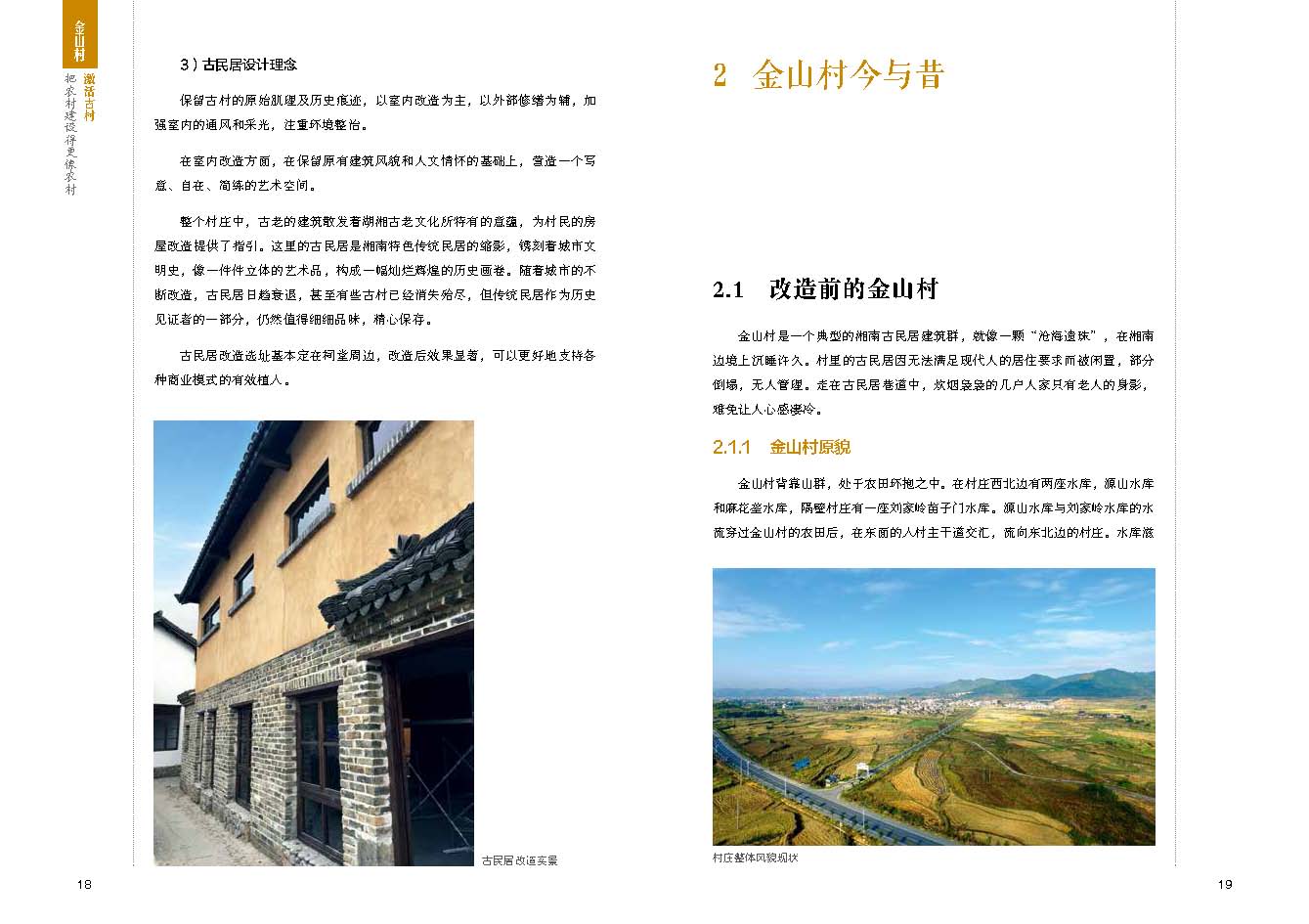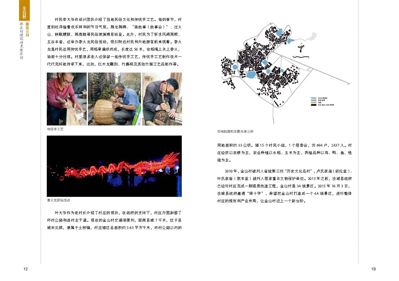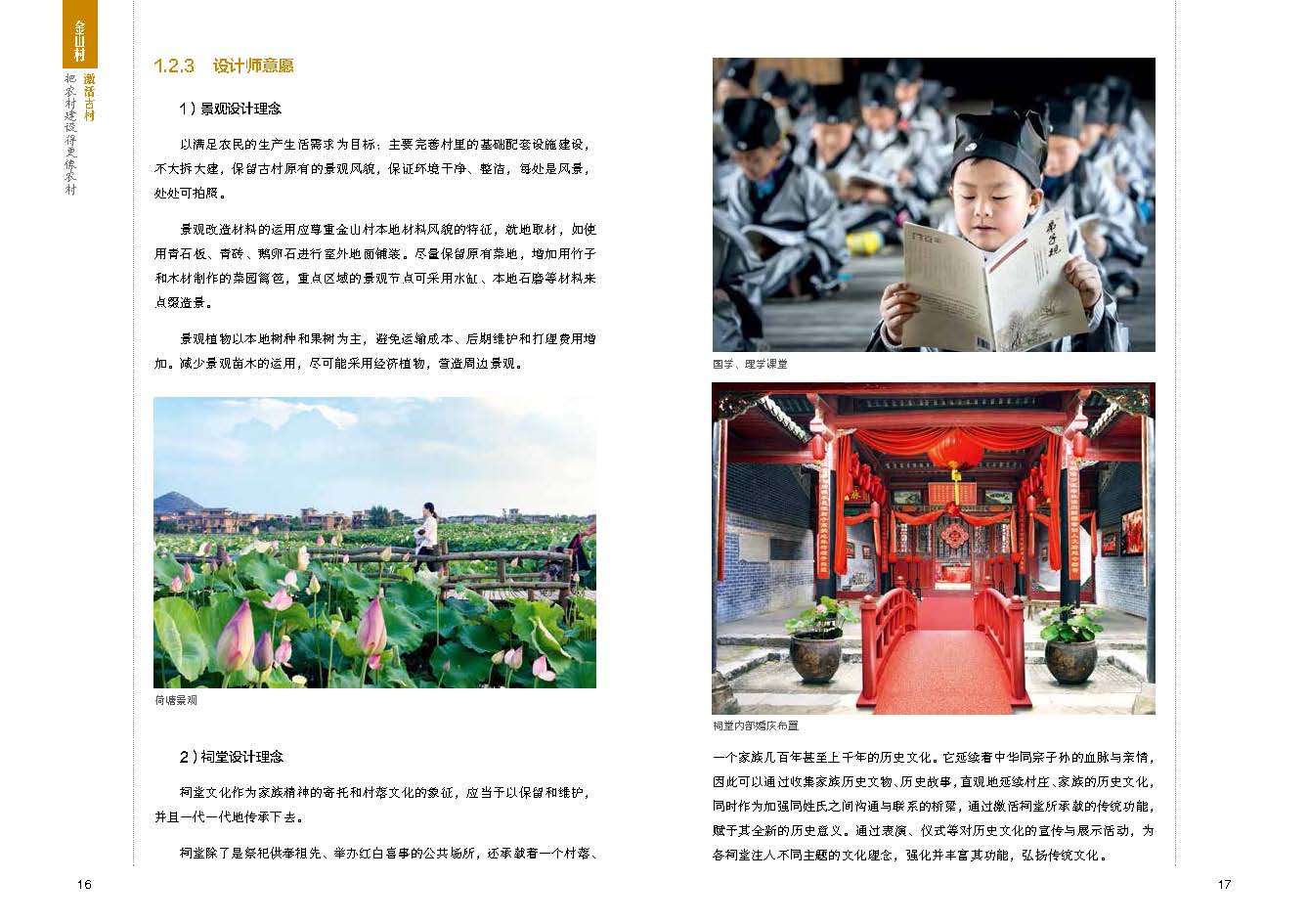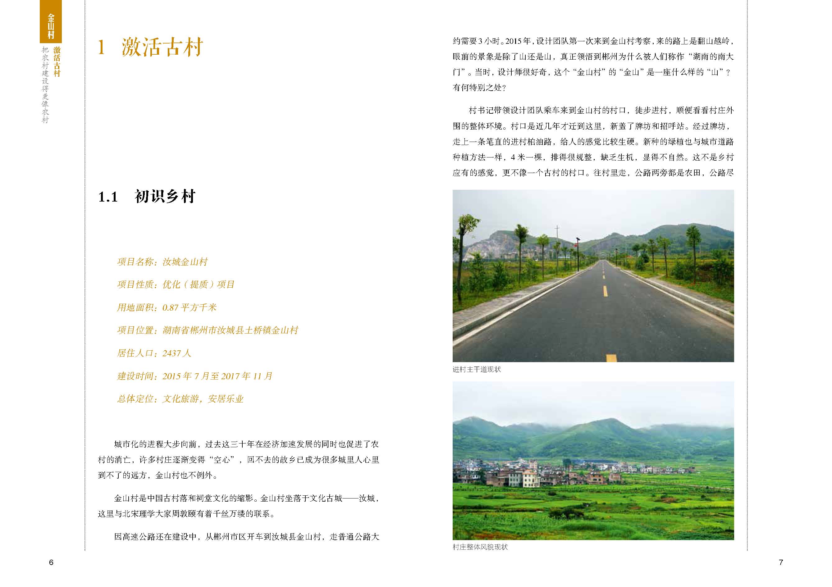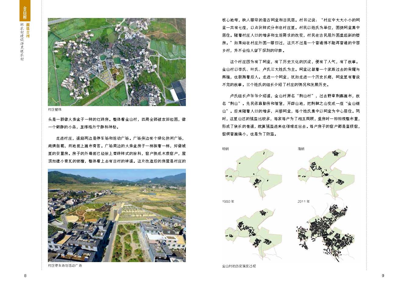 金山村位于湖南省汝城縣,是擁有幾處國家級(jí)和省級(jí)祠堂的古村落,有著典型的農(nóng)村村落特征和祠堂保護(hù)的特殊性。設(shè)計(jì)師從祠堂的修復(fù)與保護(hù)作為切入點(diǎn),設(shè)計(jì)蓮花草堂、荷塘景觀、村頭招呼站、戲臺(tái)等標(biāo)志性景觀。書中通過實(shí)景前后對(duì)比圖片、設(shè)計(jì)圖紙、模型方案、燈光效果圖、手繪圖等,讓讀者不僅能通過文字,還可通過圖片來深入了解金山村建設(shè)前后的巨大變化。