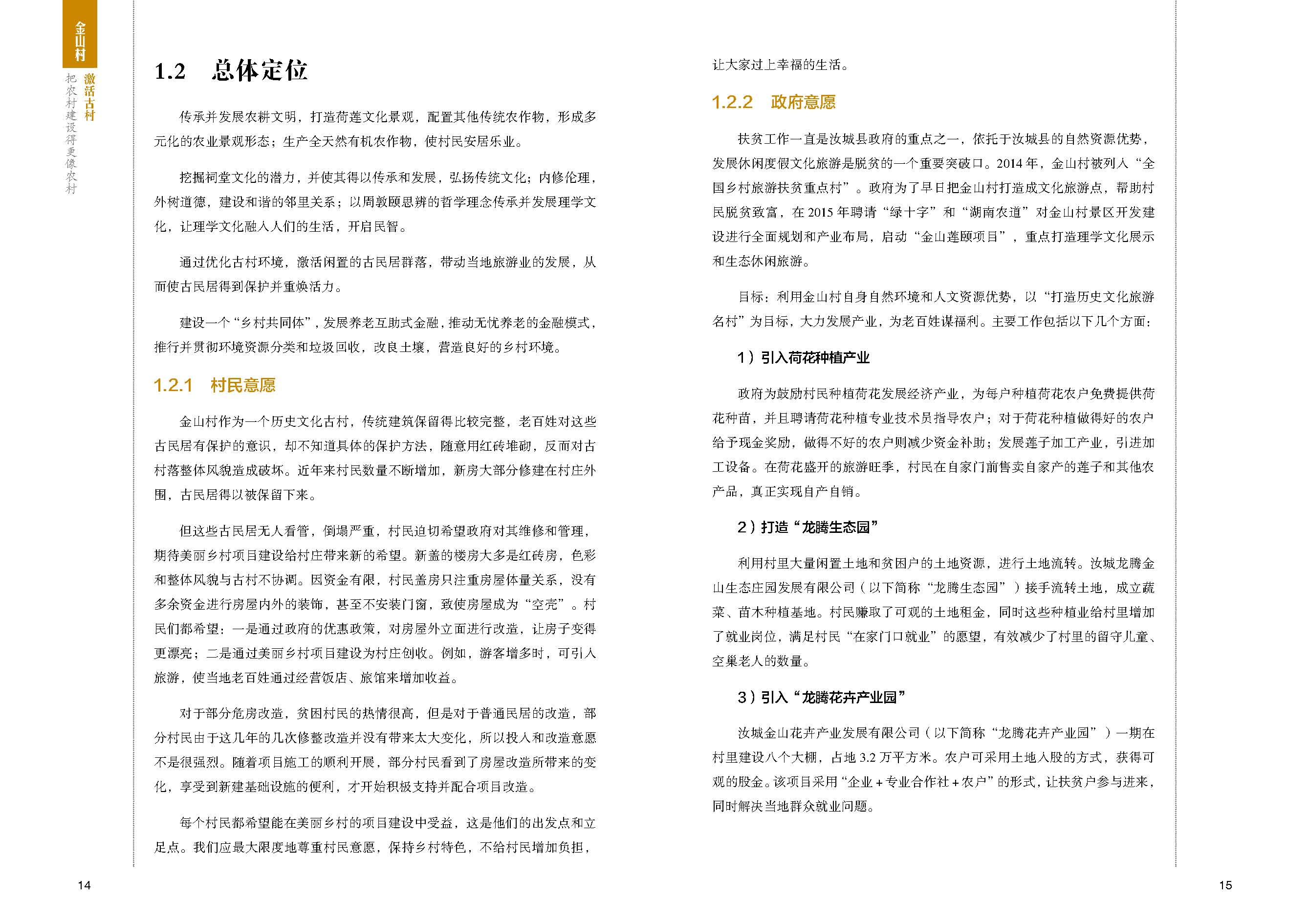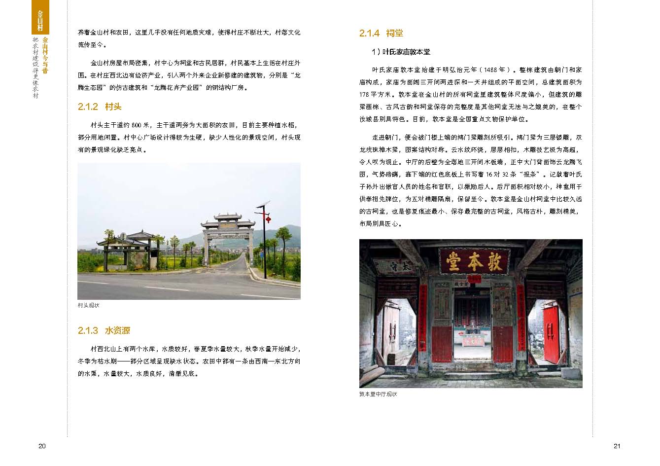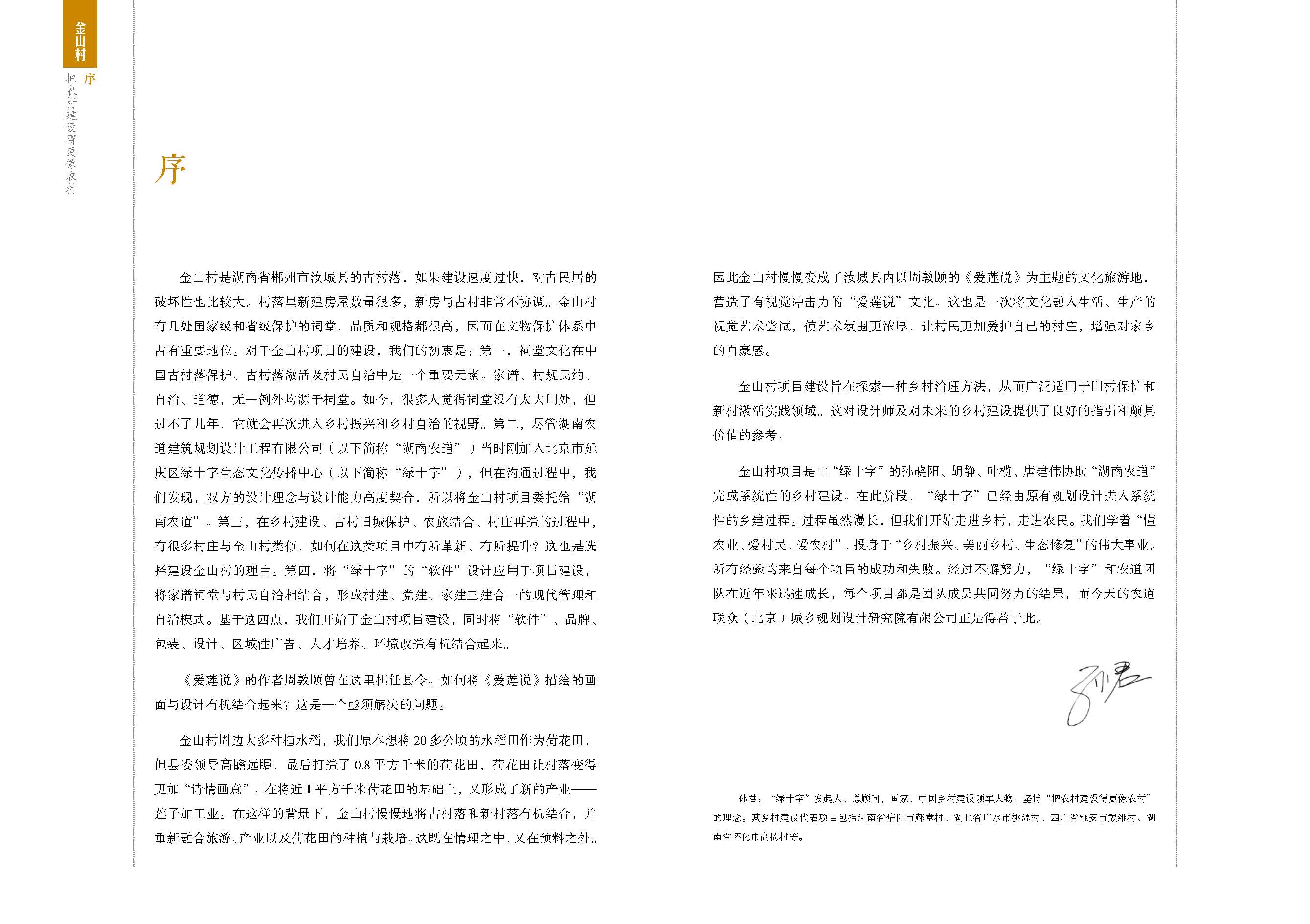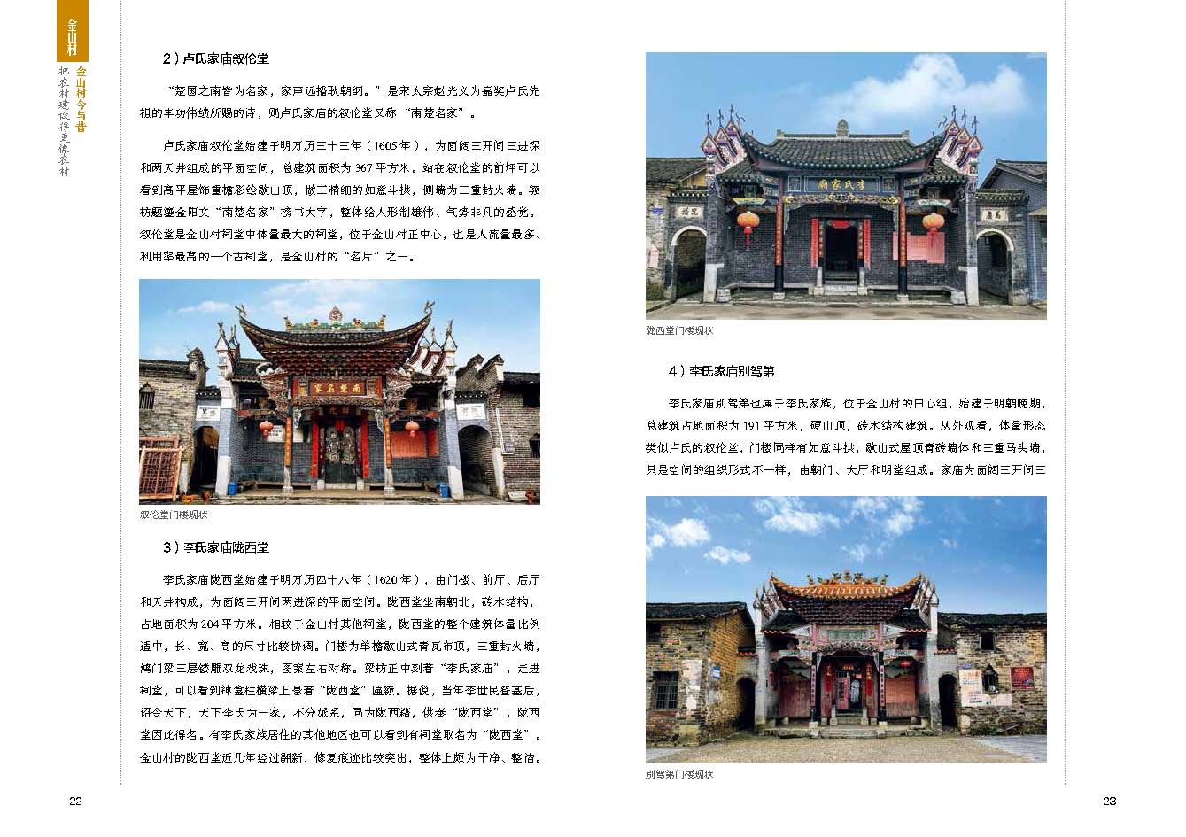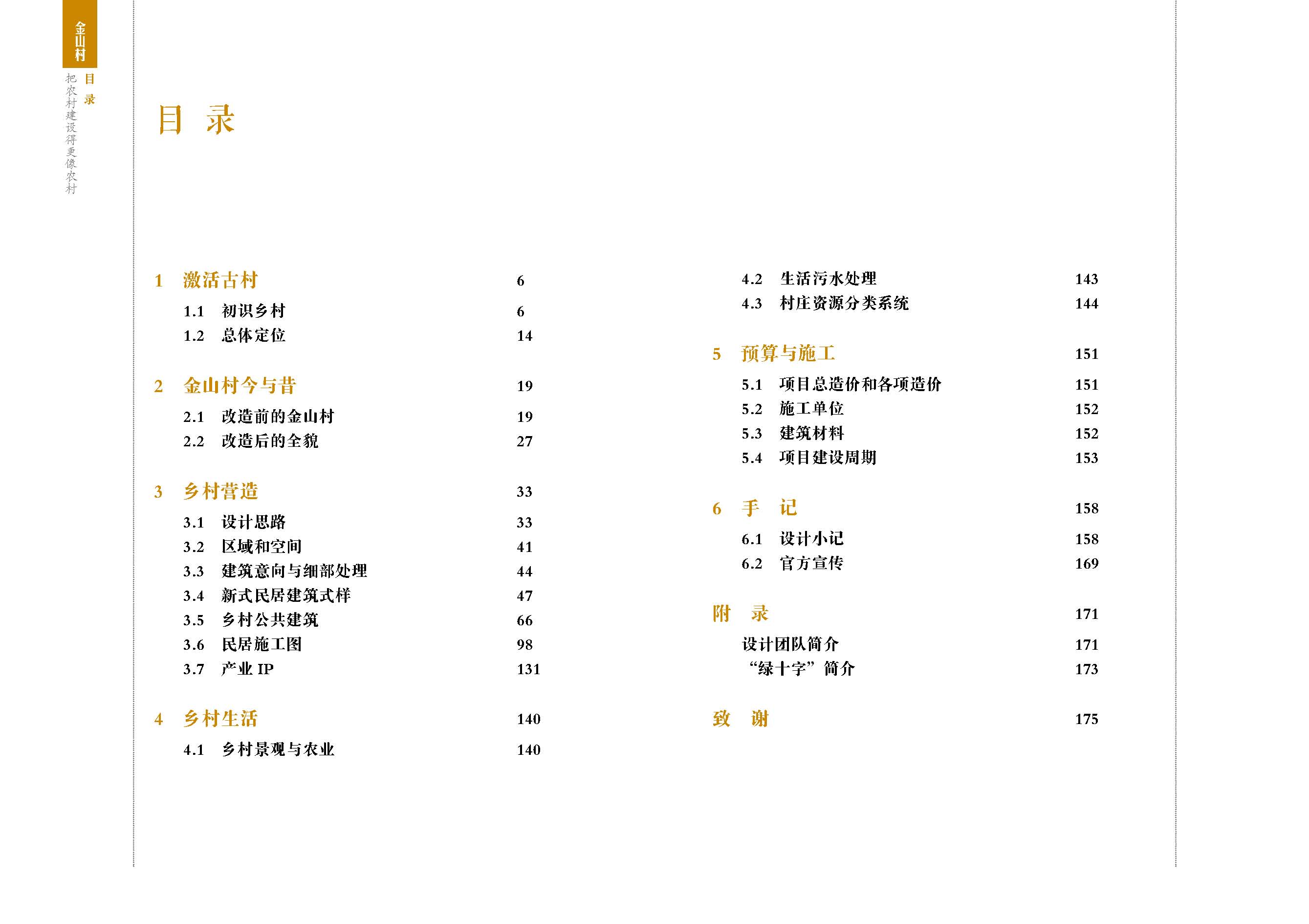 金山村位于湖南省汝城縣,是擁有幾處國家級(jí)和省級(jí)祠堂的古村落,有著典型的農(nóng)村村落特征和祠堂保護(hù)的特殊性。設(shè)計(jì)師從祠堂的修復(fù)與保護(hù)作為切入點(diǎn),設(shè)計(jì)蓮花草堂、荷塘景觀、村頭招呼站、戲臺(tái)等標(biāo)志性景觀。書中通過實(shí)景前后對(duì)比圖片、設(shè)計(jì)圖紙、模型方案、燈光效果圖、手繪圖等,讓讀者不僅能通過文字,還可通過圖片來深入了解金山村建設(shè)前后的巨大變化。