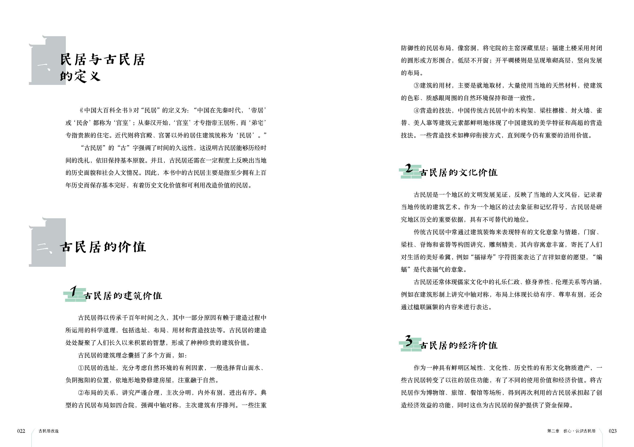 全書共三章,主要從兩大部分來闡釋古民居改造,一是關于古民居的基本知識,包括古民居的相關概念、保護思想和改造原則等,還簡要記錄了國內(nèi)不同地區(qū)的古民居之特征,讓讀者對古民居有大致系統(tǒng)性的認識;二是關于古民居改造實例的解析,選擇了七大古老民宅的改造故事,講述了它們的前世今生,致力于挖掘建筑本身的歷史淵源和舊記憶,并結合實際可行的圖紙,通過各種保護修復與改造的措施,把它們轉變成酒店、會所、民宿等有價值的再利用空間,將舊時光復刻在人們眼前。改造實例中還附有大量的精美實景圖,也有各種施工細部的詳細講解,能給予讀者帶來啟發(fā)性的思考。