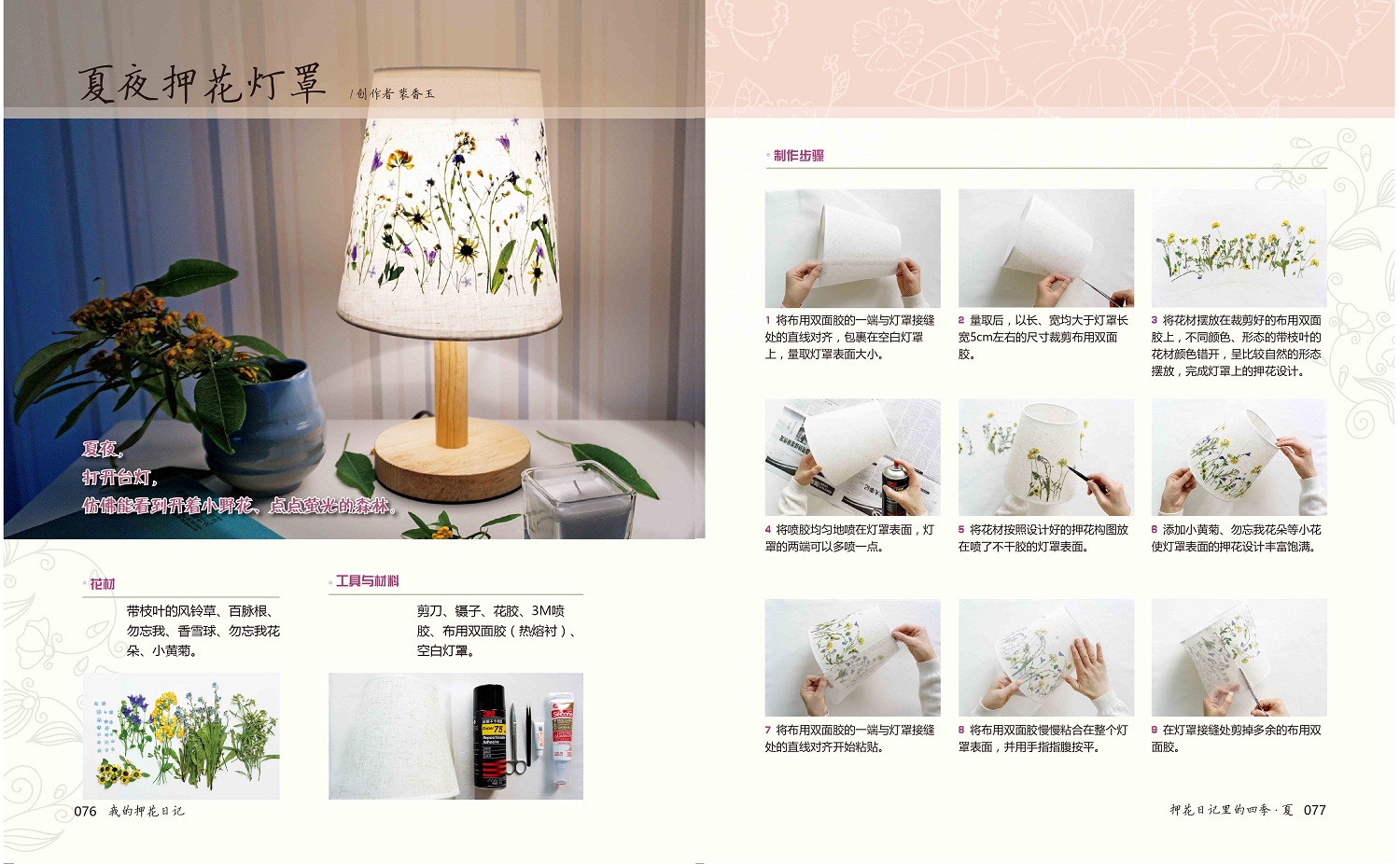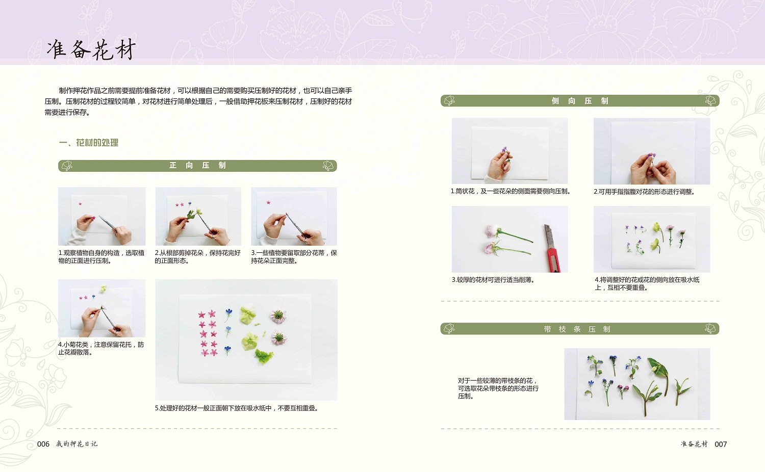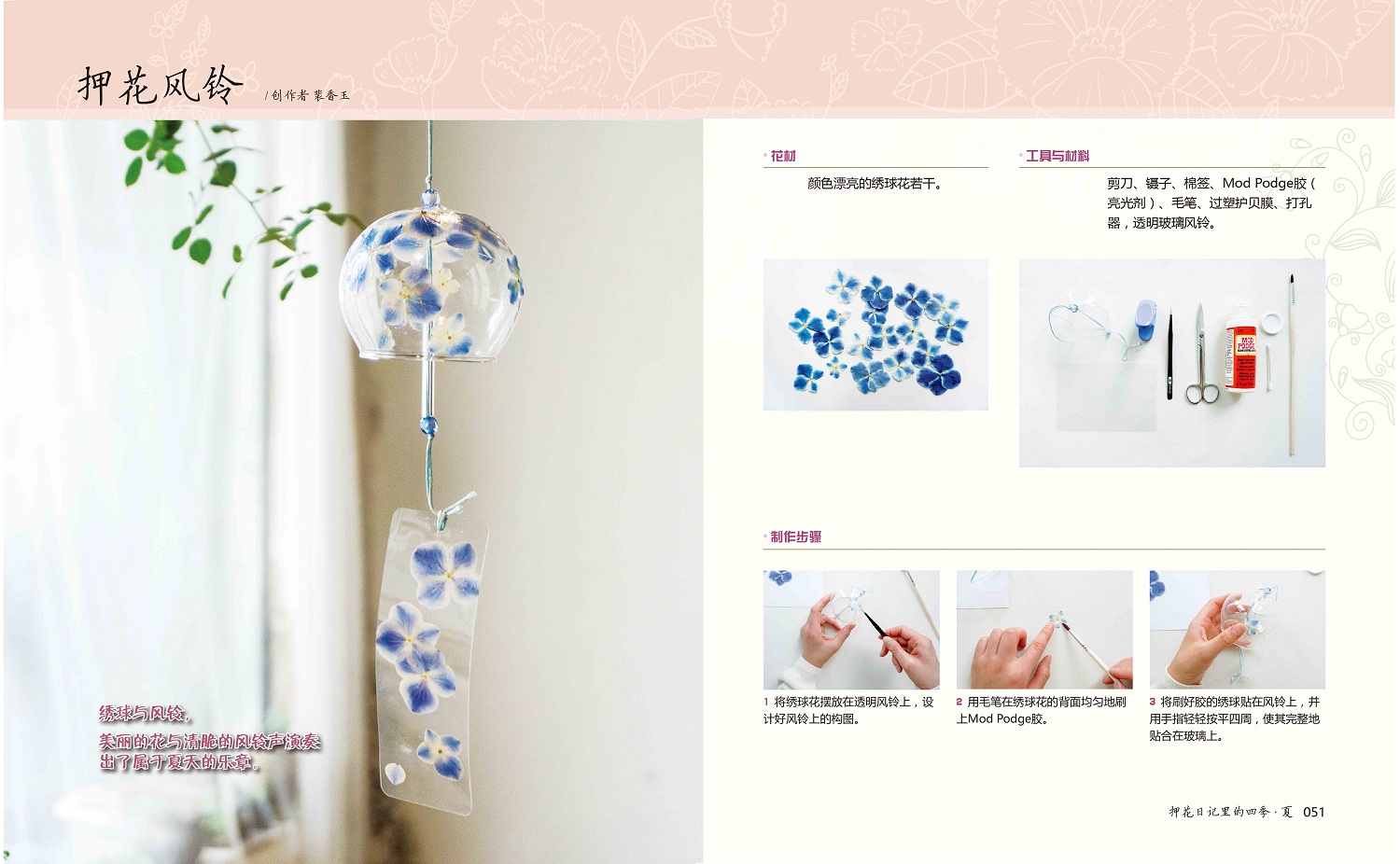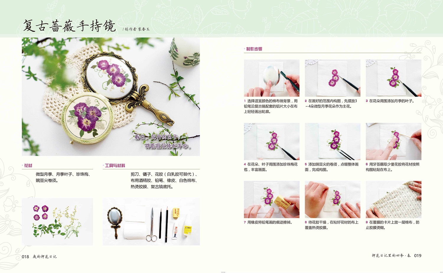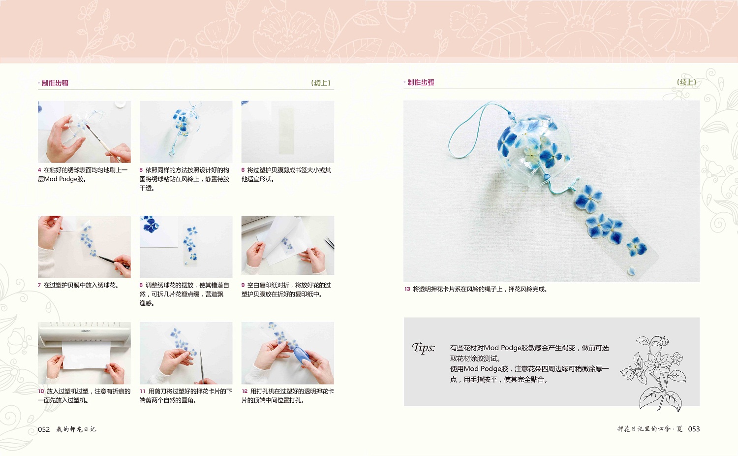 本書的兩位作者有著多年的押花制作經(jīng)驗,書中的作品案例是作者結(jié)合日常生活,精選出的具有實用價值和生活美學(xué)的押花范例。書中的作品案例形式新穎且多樣,36個押花作品中使用了多種不同的形式,如胸針、筆記本、風(fēng)鈴、團(tuán)扇、手機殼、手鏡、項鏈、手鐲和蠟燭等。這些精美的押花作品不僅是用來觀賞,許多還能運用到實際生活中,如將春天盛放的櫻花做成胸針,便能讓春天的美好伴你四季。
