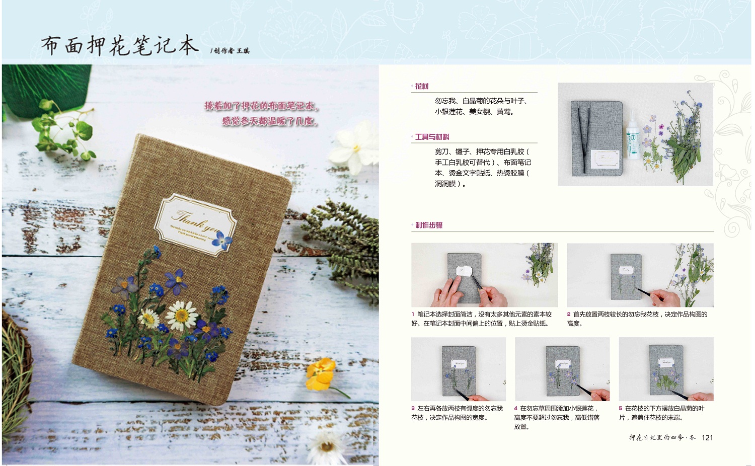 近幾年,新的押花制作方法與生活應(yīng)用越來越多,人們對押花有了進(jìn)一步的認(rèn)識。本書共分享了36個簡單而新穎的押花作品,以春夏秋冬四個季節(jié)為線索,介紹其制作步驟和成品展示。作品均為作者精選的運用當(dāng)季花材或適用于當(dāng)季的精美押花小物,包括胸針、筆記本、風(fēng)鈴、團(tuán)扇、手機殼、手鏡、項鏈、手鐲和蠟燭等多種不同形式的押花作品。