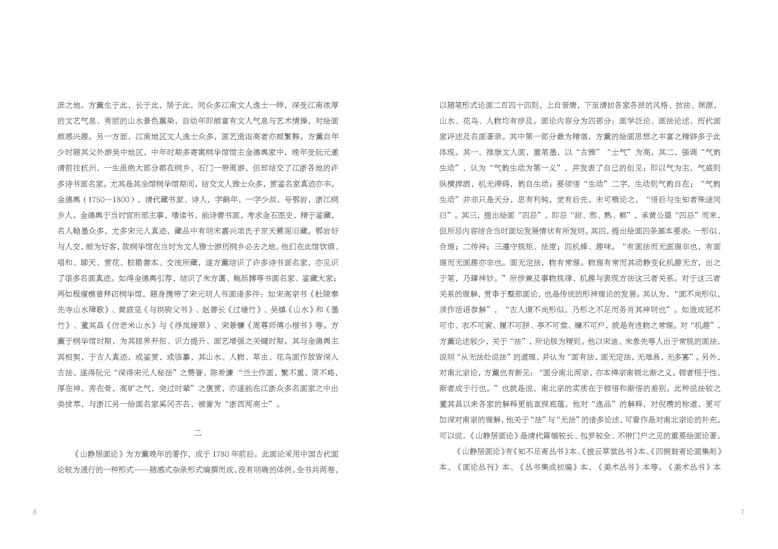 《山靜居畫論》為方薰晚年的著作,成于1780年前后。此畫論采用中國古代畫論較為通行的一種形式——隨感式雜錄形式編撰而成,沒有明確的體例。全書共兩卷,以隨筆形式論畫二百四十四則,上自晉唐,下至清初各家各派的風(fēng)格、技法、淵源,山水、花鳥、人物均有涉及。