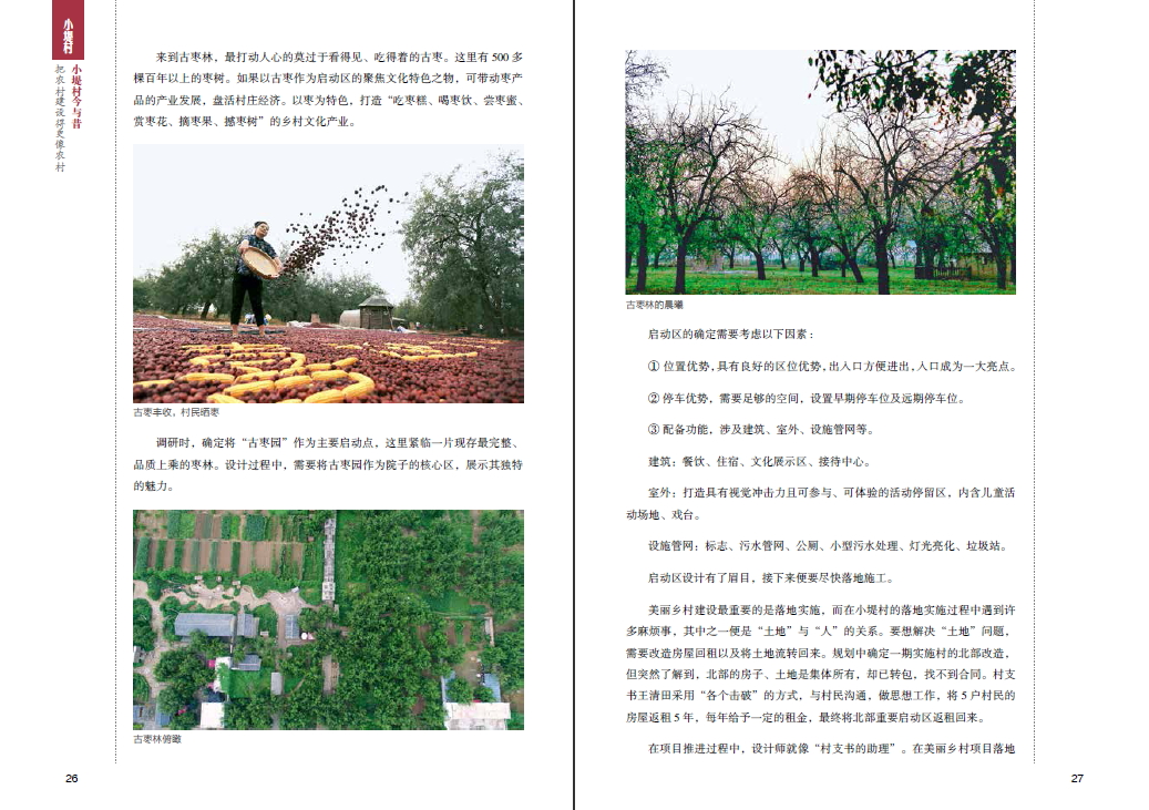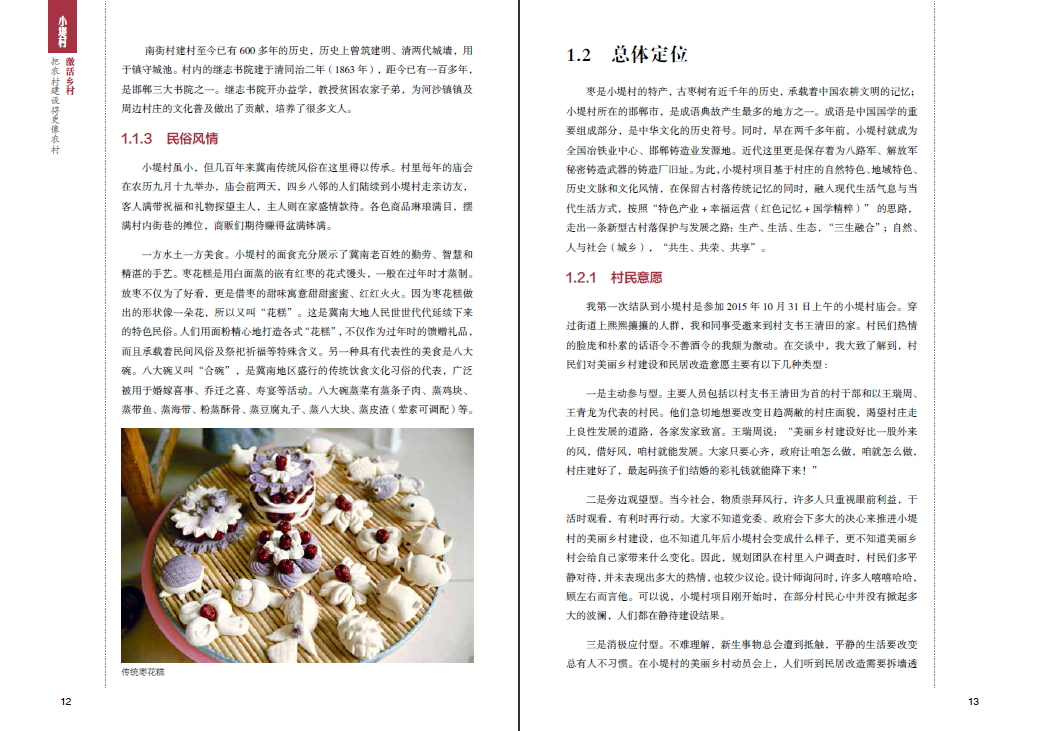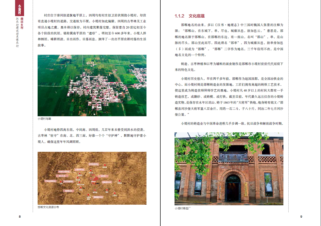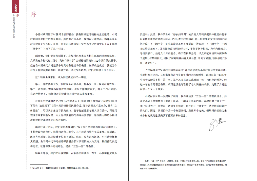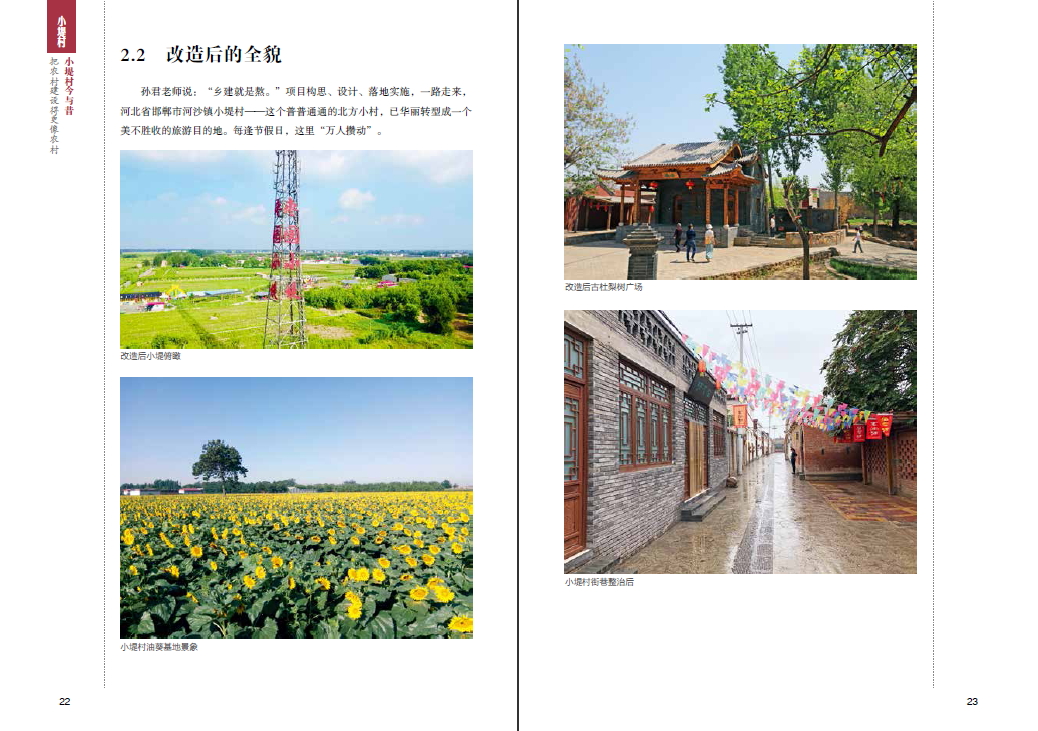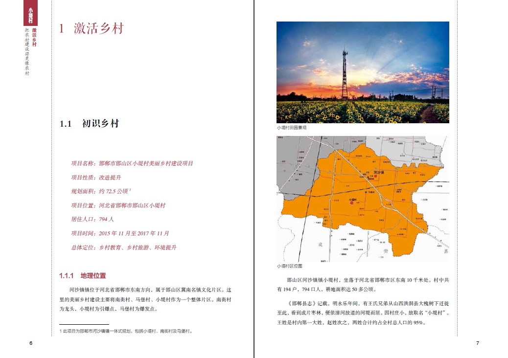 本書選取河北省邯鄲縣小堤村項(xiàng)目為代表,小堤村為2016年中國(guó)十大最美鄉(xiāng)村之一,書中集中展示了小堤村從調(diào)研、策劃到與各級(jí)政府、無數(shù)村民溝通交流,再到意向達(dá)成、方案確定、逐項(xiàng)實(shí)施、完整落地的全過程。重點(diǎn)突出了小堤村項(xiàng)目建設(shè)周期短、見效快、示范性強(qiáng)的特點(diǎn)。除了硬件設(shè)施,“綠十字”在小堤村項(xiàng)目中提出運(yùn)營(yíng)、軟件、硬件有機(jī)結(jié)合,即“三位一體”的做法,增加了對(duì)村民的微商培訓(xùn)、垃圾分類管理等,為鄉(xiāng)建設(shè)計(jì)師提供了重要參考與借鑒。