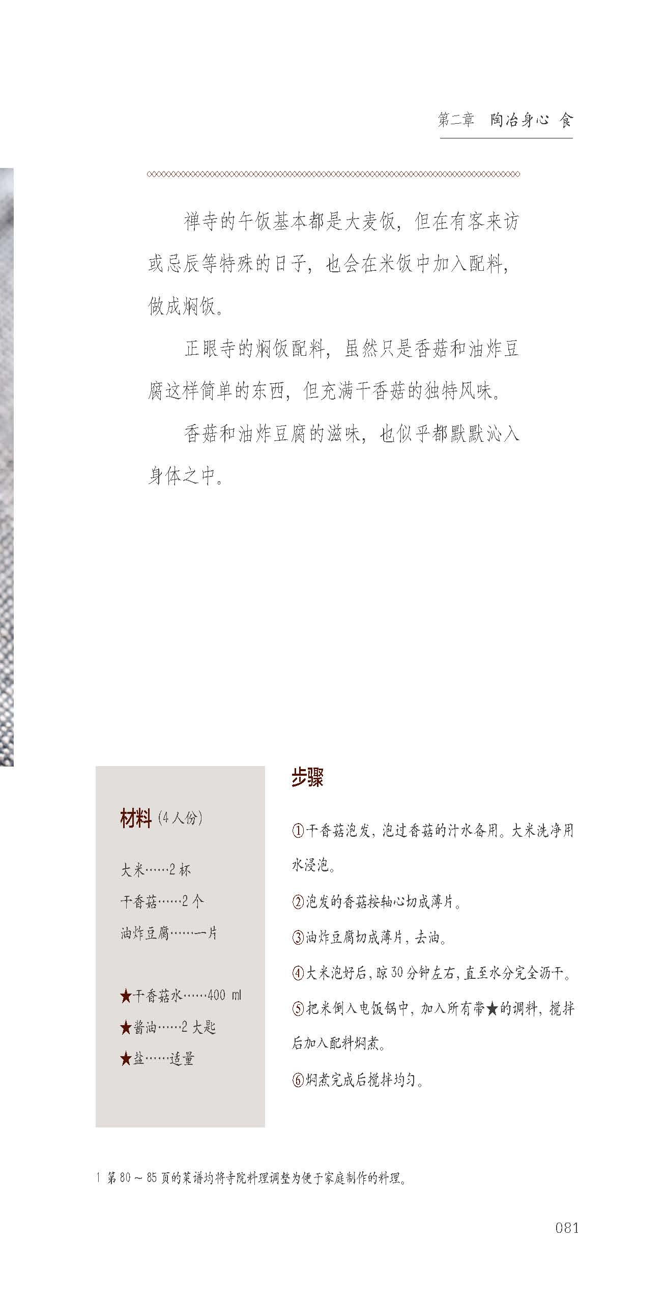 作者將禪有關(guān)“食”和“掃除”的智慧在融入家事技巧之中,對(duì)廚房工作、日常料理、掃除等家務(wù)的方方面面進(jìn)行細(xì)心的指導(dǎo),使每天平凡的家務(wù)事恬靜而美好。本書共四章。第一章主要講述廚房家務(wù)技巧,比如不容易遺忘物品的冰箱收納方法、家庭菜單制定規(guī)則、廚具購買原則、廚余垃圾處置技巧等。第二章主要探討食材烹飪方法和對(duì)待食材的態(tài)度,向讀者傳達(dá)感恩食材、用心烹飪、物盡其用的思想。第三章從簡(jiǎn)化清掃用具、減少物品、制定清掃計(jì)劃等方面講述浴室、廁所、玄關(guān)等處的打掃技巧,著重強(qiáng)調(diào)打掃房間與清潔內(nèi)心的關(guān)聯(lián)。第四章,與讀者分享“照顧腳下”“一掃除二信心”“時(shí)時(shí)勤拂拭”“日日是好日”等有關(guān)生活的禪語。