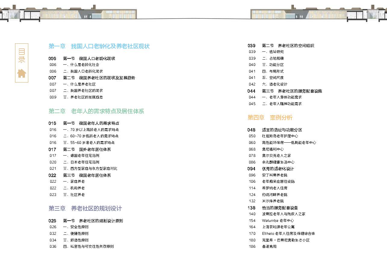 本書作為一本養(yǎng)老社區(qū)的設計指南,從多個不同的方面對養(yǎng)老社區(qū)進行介紹。根據(jù)我國老齡化現(xiàn)象、經(jīng)濟情況及養(yǎng)老社區(qū)的現(xiàn)狀進行具體分析,針對老年人的需求對養(yǎng)老社區(qū)的規(guī)劃設計進行了詳細的講解,包括養(yǎng)老社區(qū)的規(guī)劃設計原則、空間組織模式、建筑布局及服務配套設施。書中收錄了多個精心篩選的不同類型的國內(nèi)外的養(yǎng)老社區(qū)案例,圖文結(jié)合,參考價值高。