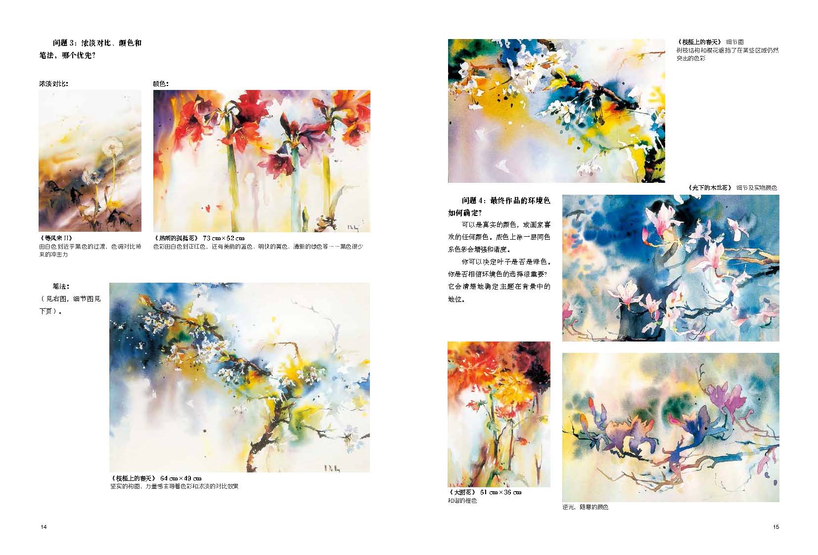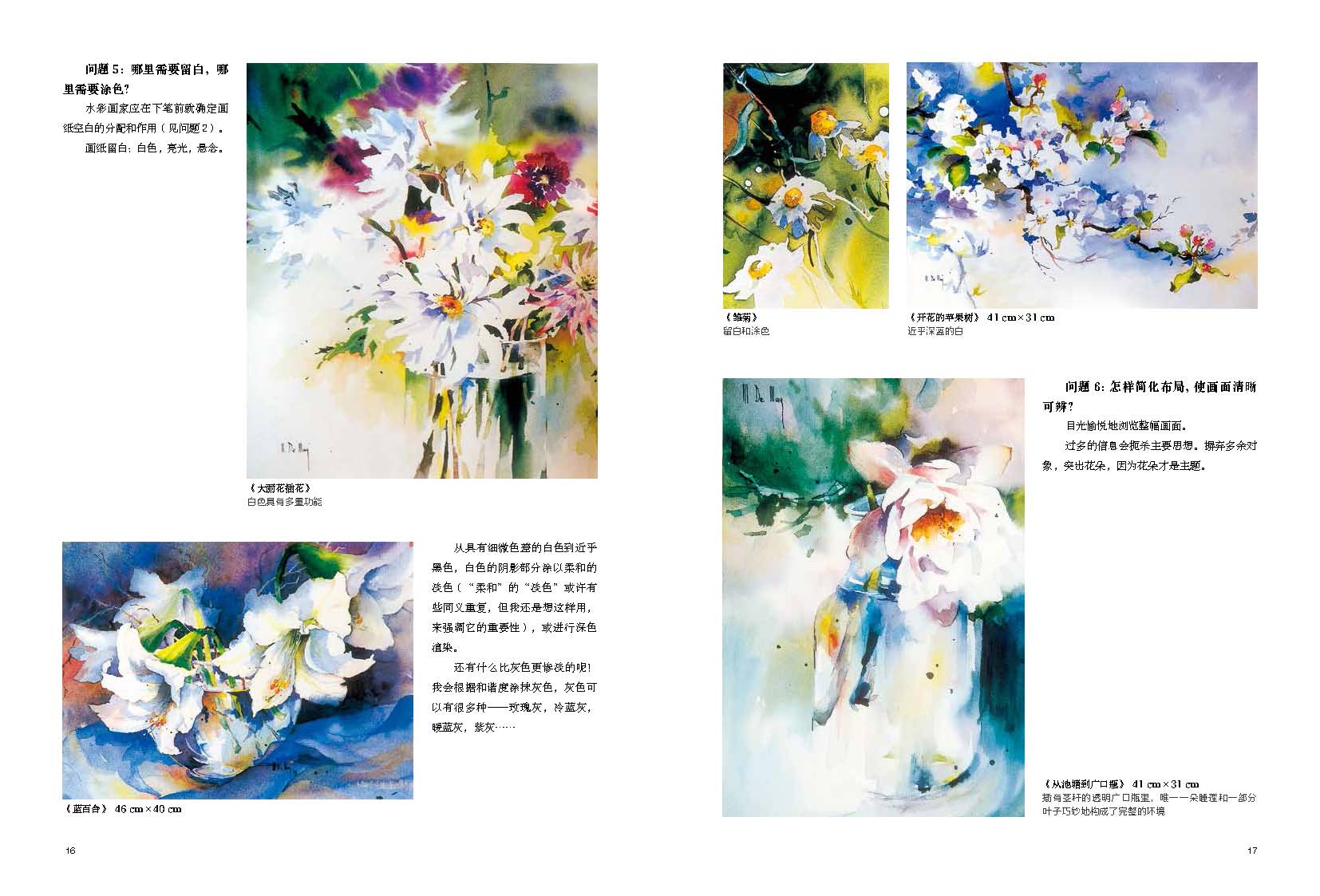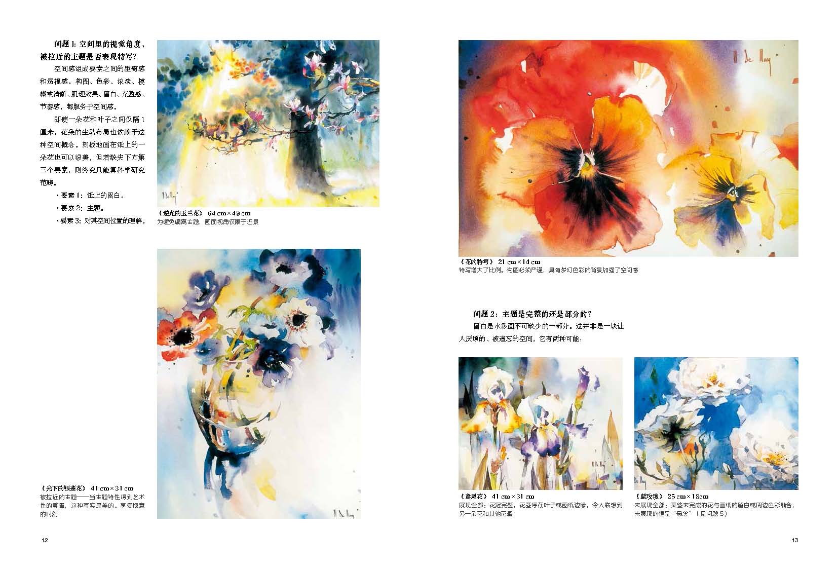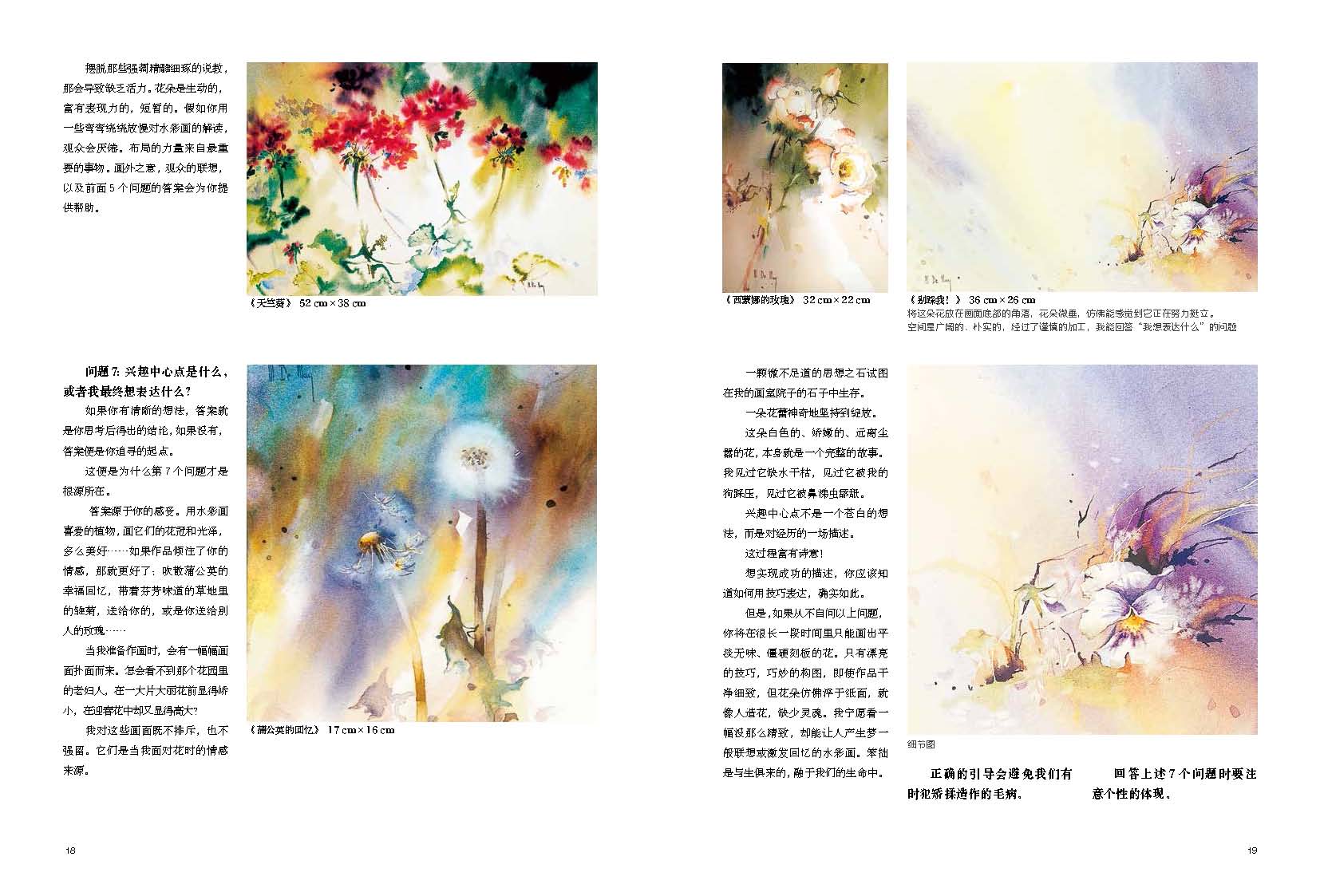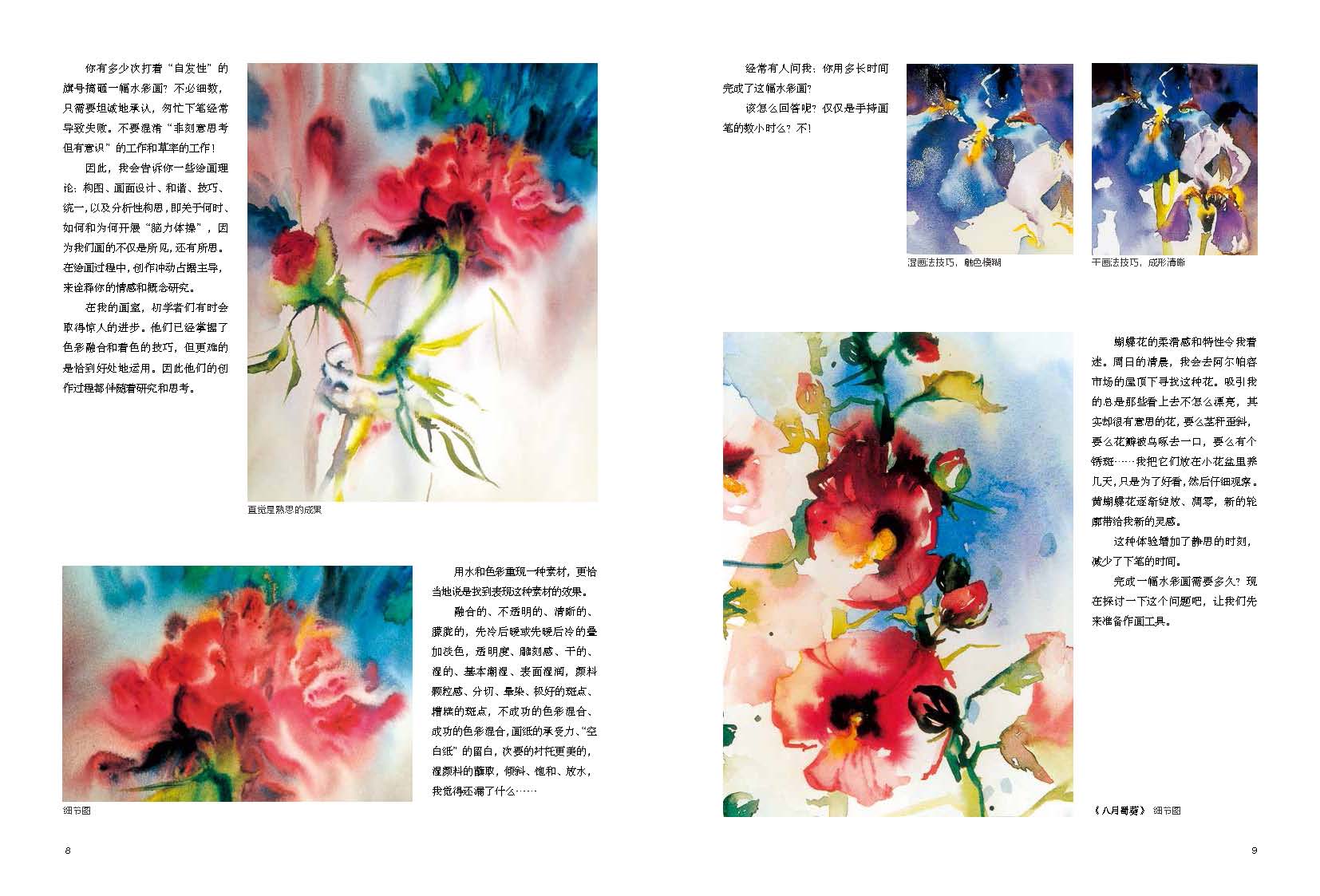 藝術(shù)家打破了藝術(shù)創(chuàng)作的神秘,一步一步教你,從構(gòu)思直到“成畫”,水彩畫的學(xué)習(xí)變得有跡可循。值得一提的是,藝術(shù)家著重講解如何進(jìn)行畫前思考,將素材轉(zhuǎn)換成畫面,這需要明了并確定空間視角、主題、顏色筆法的優(yōu)先性、環(huán)境色、留白、畫面布局、興趣中心點(diǎn)……通過細(xì)致的案例講解,藝術(shù)家講透運(yùn)筆、顏料、各種畫法,在極致絢爛之美中發(fā)現(xiàn)花之魂!