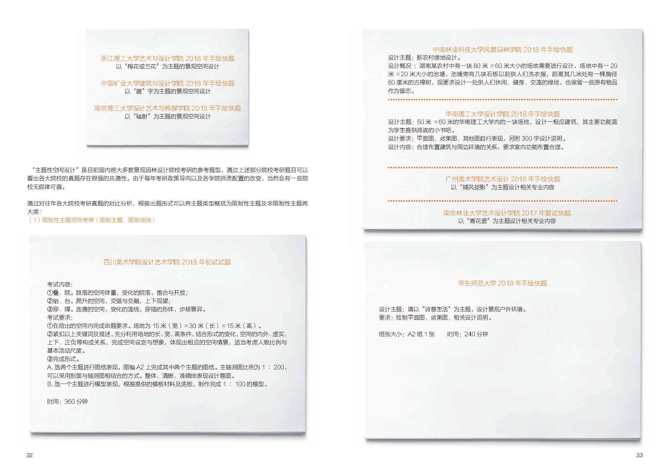 目前我國主要的設(shè)計(jì)院校中,對(duì)于環(huán)境藝術(shù)設(shè)計(jì)或者說景觀園林設(shè)計(jì)方向的設(shè)計(jì)考研考題類型基本一致,除了個(gè)別院校對(duì)于素描及色彩的考查外,絕大多數(shù)的設(shè)計(jì)院校均以手繪快題和設(shè)計(jì)理論作為自己選拔人才的指導(dǎo)標(biāo)準(zhǔn),只是在考查的形式上有相對(duì)的不同,從而造成相同專業(yè)不同院校之間考試的差別。有些院校主打較大面積的景觀園林設(shè)計(jì),有些院校則主打城市中小地塊的景觀創(chuàng)意,有些院校重視造景表現(xiàn)效果,有些院校以發(fā)散性景觀綠地創(chuàng)作作為自己的考題形式,等等。為了盡可能詳盡地對(duì)景觀園林設(shè)計(jì)考研核心的設(shè)計(jì)思維進(jìn)行總結(jié),保證觀點(diǎn)的共識(shí)度,本書作者除了對(duì)近年來各院校高分快題試卷進(jìn)行總結(jié)之外,同時(shí)搜集了近7 年從“突圍設(shè)計(jì)考研”走出去的各大目標(biāo)院校優(yōu)秀學(xué)員的考試經(jīng)驗(yàn)和復(fù)習(xí)思路,加之走訪了全國各大景觀園林設(shè)計(jì)專業(yè)院校,有針對(duì)性地與我國知名景觀園林設(shè)計(jì)院校的教授、副教授,以及國內(nèi)景觀設(shè)計(jì)知名企業(yè)中一線