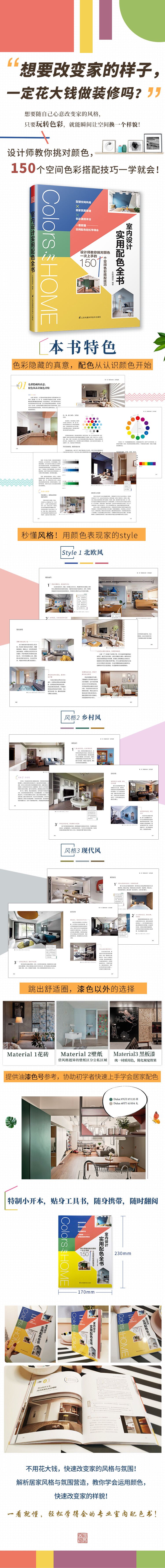 《室內(nèi)設(shè)計(jì)實(shí)用配色全書(shū)》分為兩個(gè)章節(jié),第一章“│ 基礎(chǔ)BASIC│認(rèn)識(shí)色彩”中,深入淺出解說(shuō)基本配色概念,并解析營(yíng)造居家空間氛圍、風(fēng)格配色法則,提供讀者最全面的空間配色知識(shí)。第二章“空間SPACE│色彩應(yīng)用”中,收錄25個(gè)色彩空間實(shí)例,解析混搭色彩技巧,并提供油漆色號(hào)參考,協(xié)助初學(xué)者快速上手學(xué)會(huì)居家配色。
