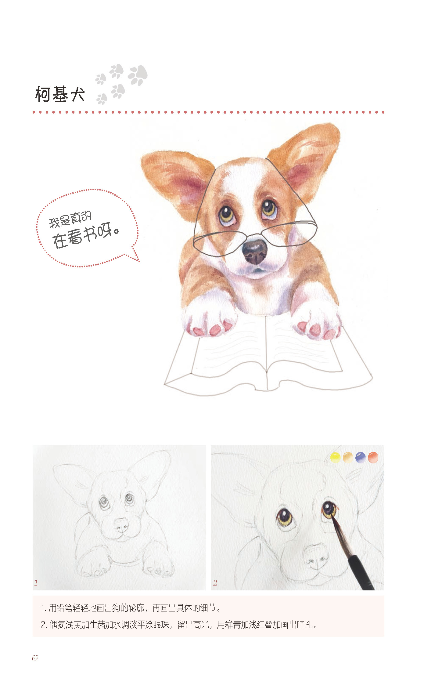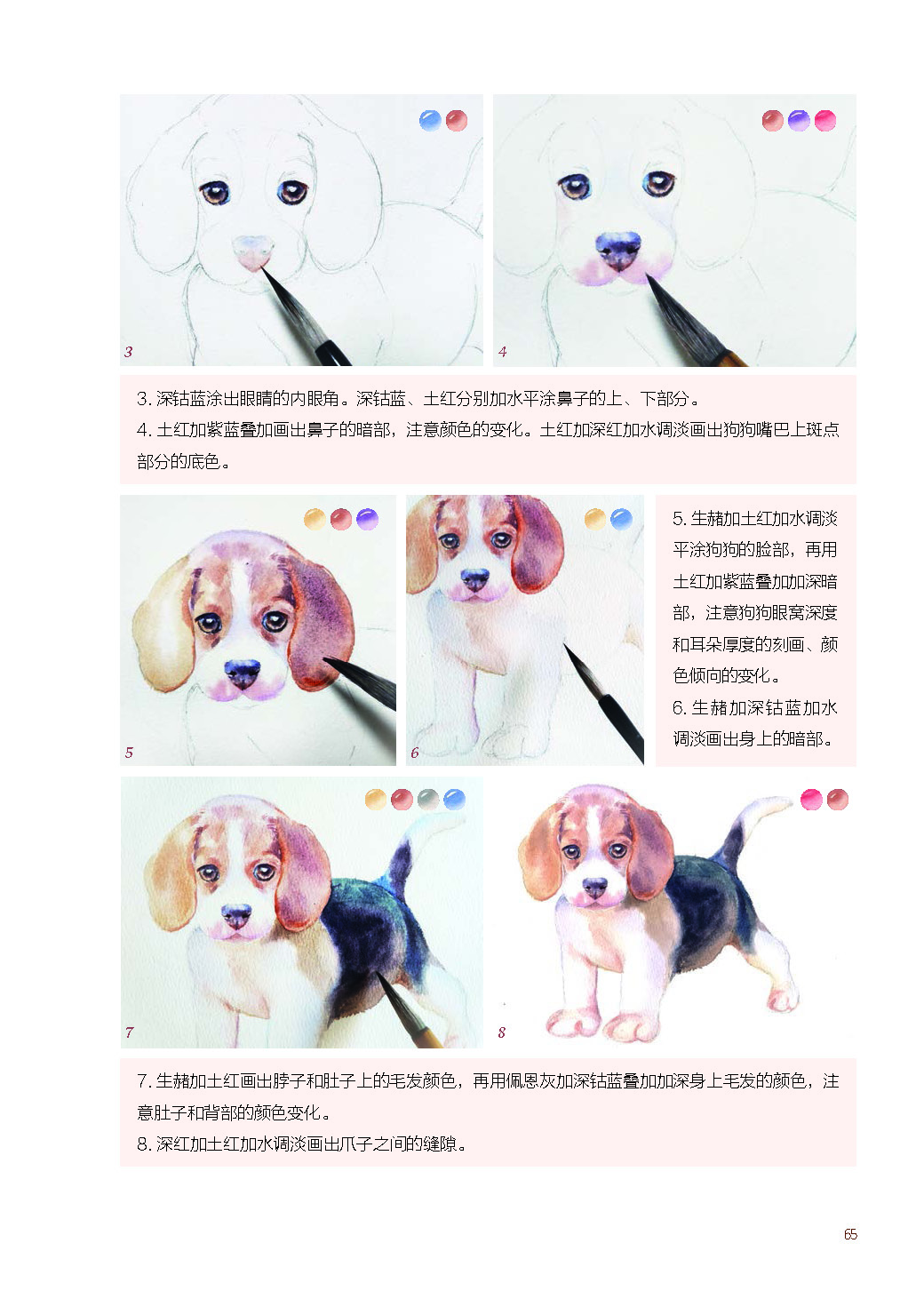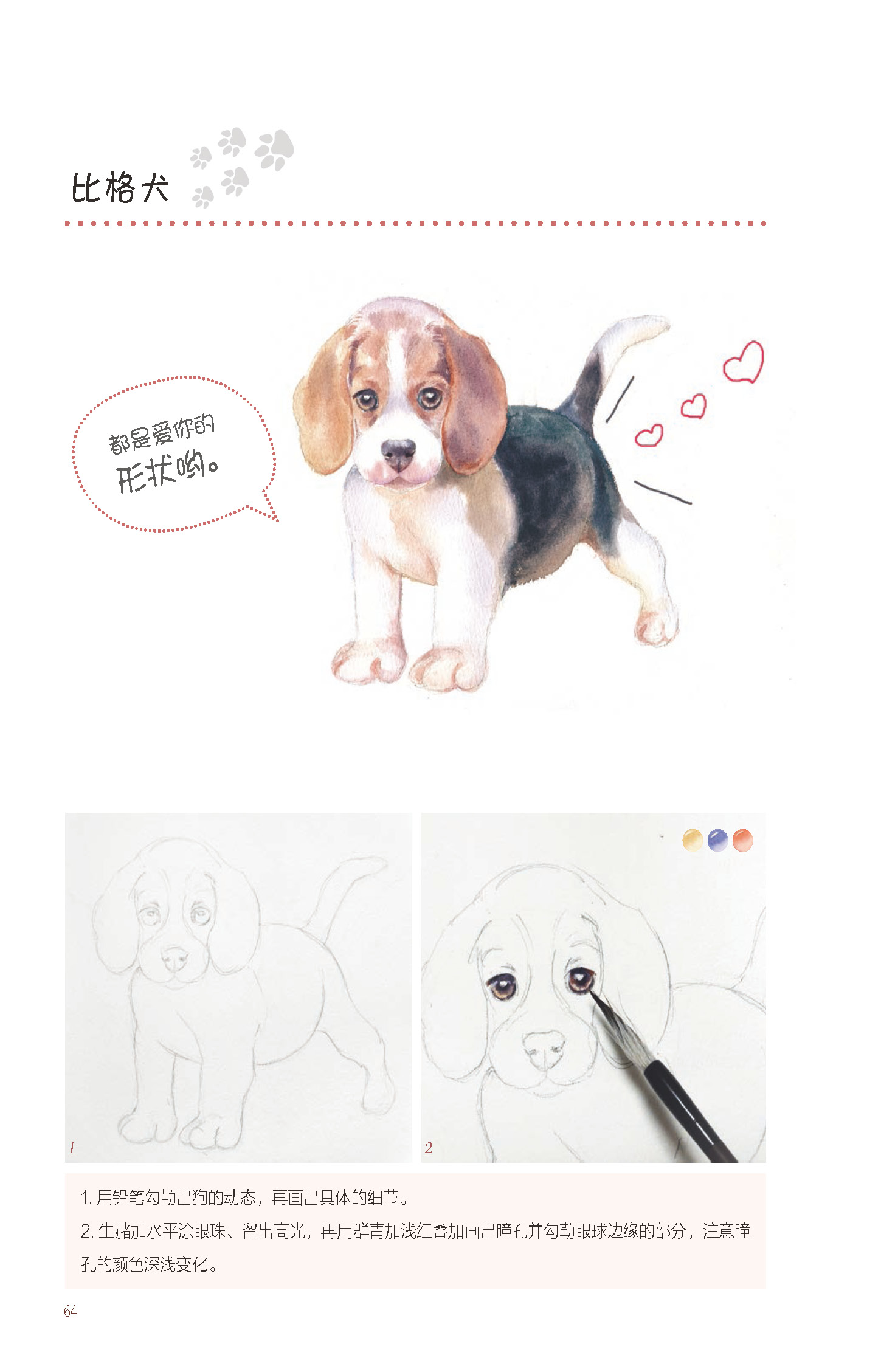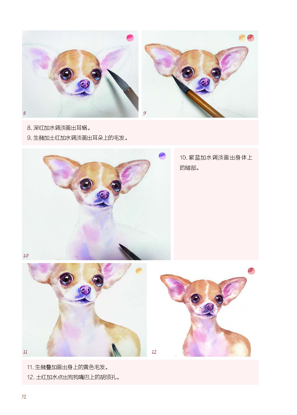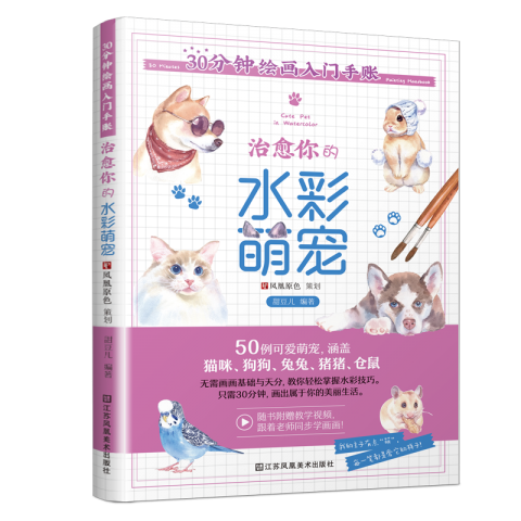 1.以萌寵作為切入點,展現(xiàn)了水彩畫中對萌寵的顏色、布局、質(zhì)感以及工具和基本技法的學習,圖解直觀,簡單易懂。