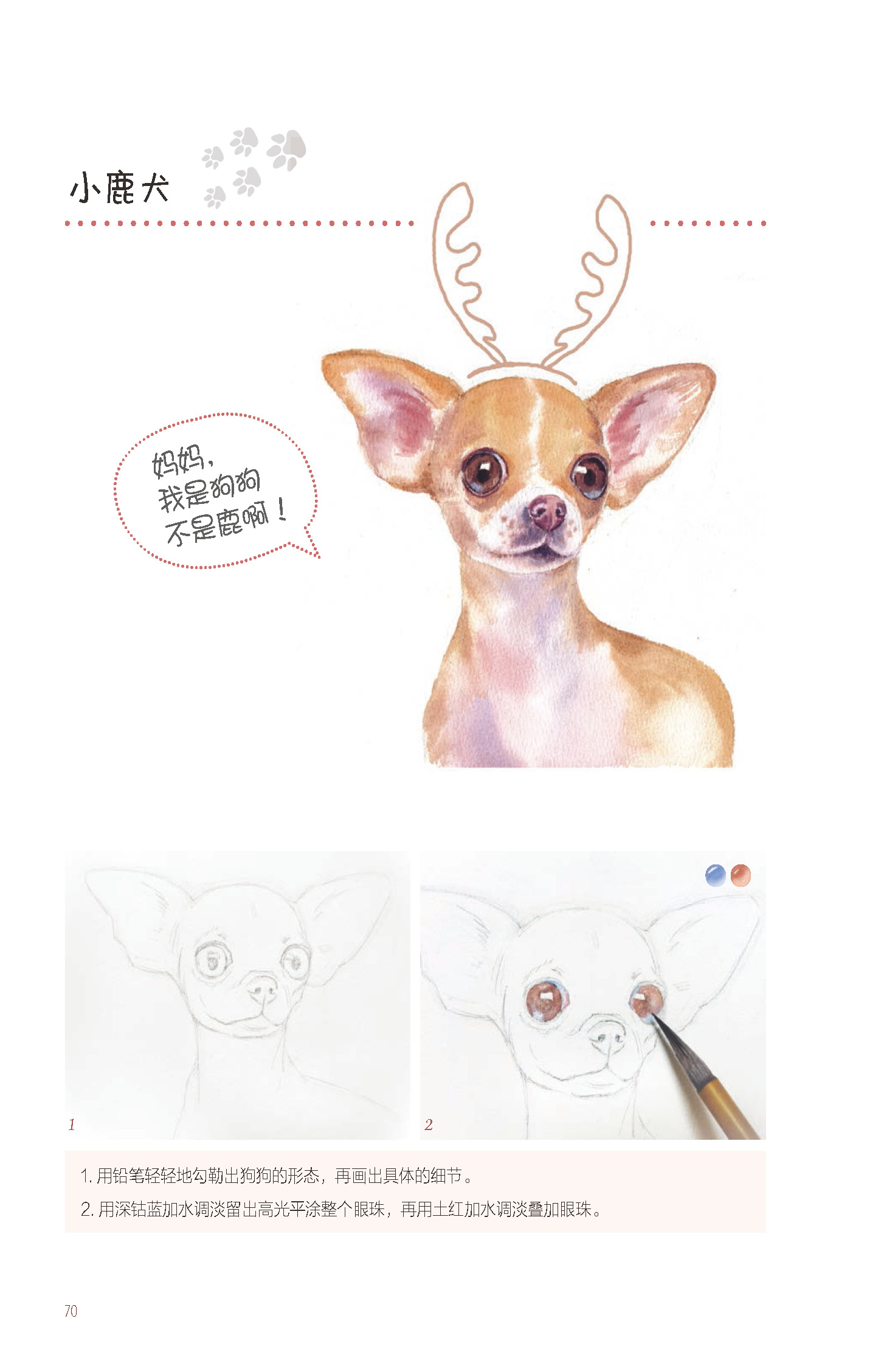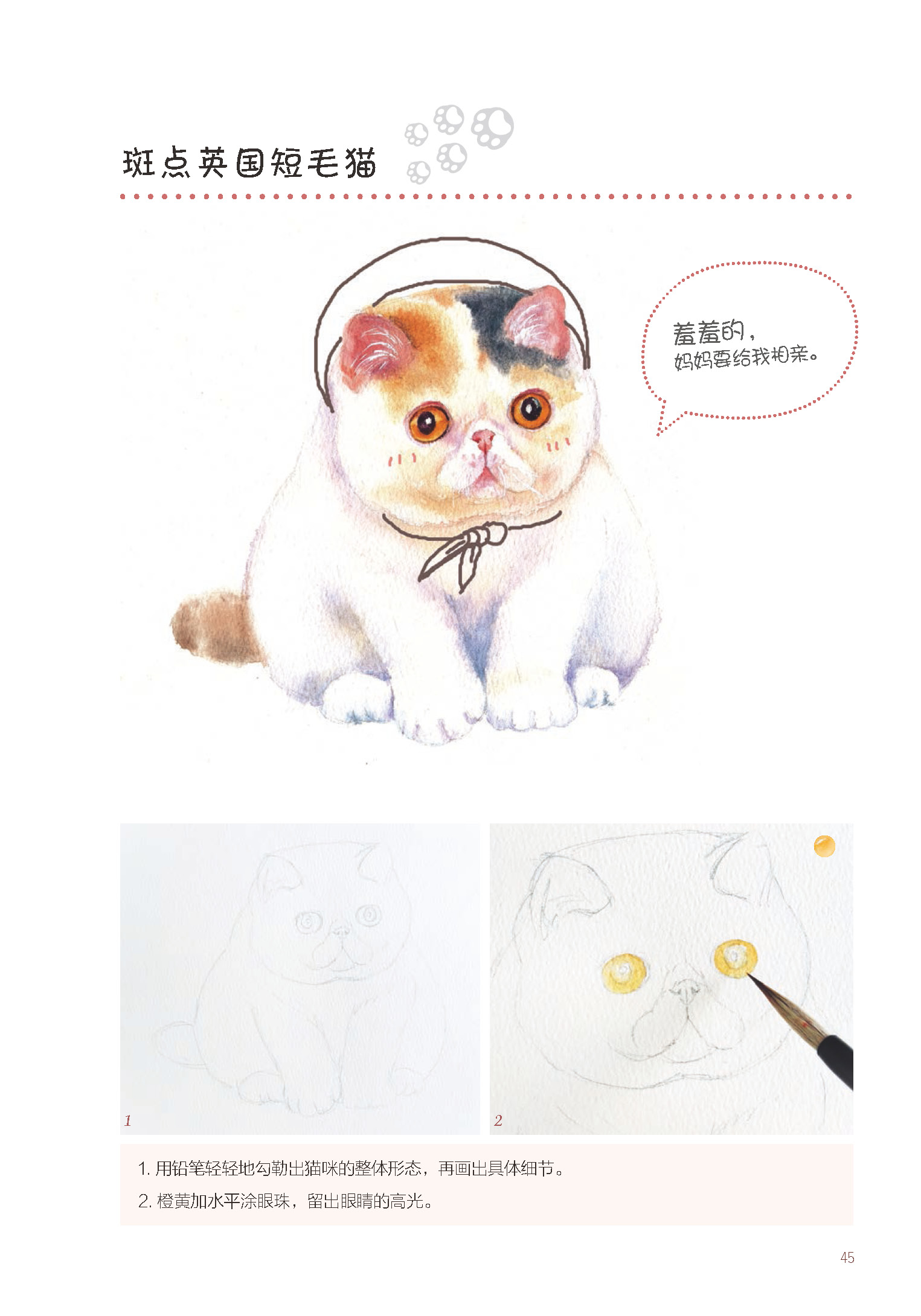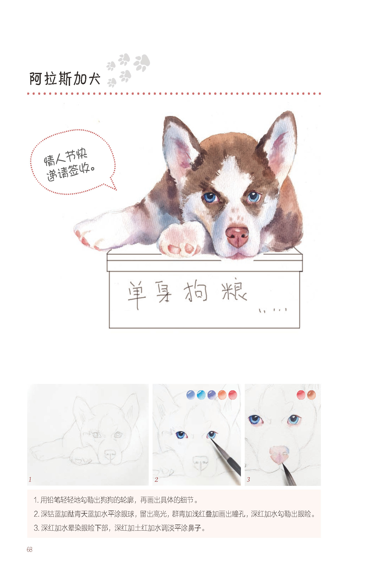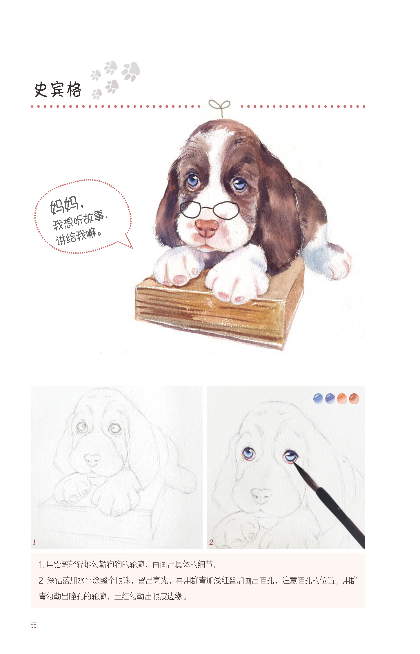 1.以萌寵作為切入點,展現(xiàn)了水彩畫中對萌寵的顏色、布局、質(zhì)感以及工具和基本技法的學習,圖解直觀,簡單易懂。