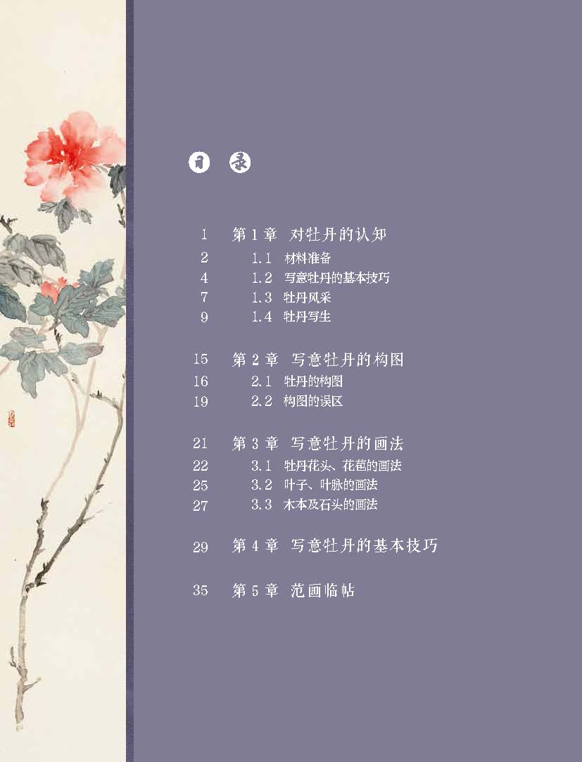 書中選取了有“國色天香”之稱的牡丹,向?qū)W畫者展示牡丹色澤艷麗,玉笑珠香,風(fēng)流瀟灑,富麗堂皇等特點(diǎn)。