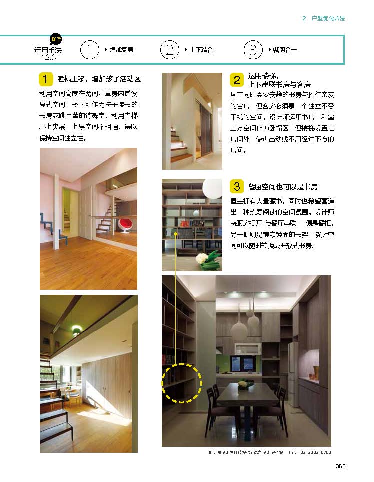 第二章通過8大類戶型優(yōu)化的手法,通過具體實(shí)例講解了諸如暗房問題如何解決;長形房如何有好采光;如何充分利用復(fù)式的樓梯;小面積的電視墻也能兼鞋柜;只是改變門的位置,竟然多出更衣間;一個(gè)中島,餐桌、工作桌、書桌可三位一體;什么樣的隔斷柜,竟能三間共享;什么樣的動線,能讓孩子享受在家自由奔跑;什么磚隔音效果最好;什么磚最防水;規(guī)劃空間時(shí),該從何下手等。
