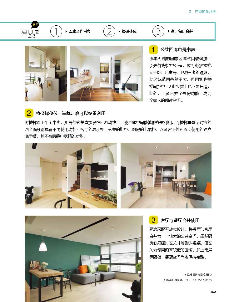 有了初步概念后,再分門別類講解,從空間、家人愉快相處、生活動線、特殊功能、通風(fēng)采光、收納計(jì)劃、家庭娛樂休閑及空間心理學(xué),8大不可不知的戶型優(yōu)化手法。