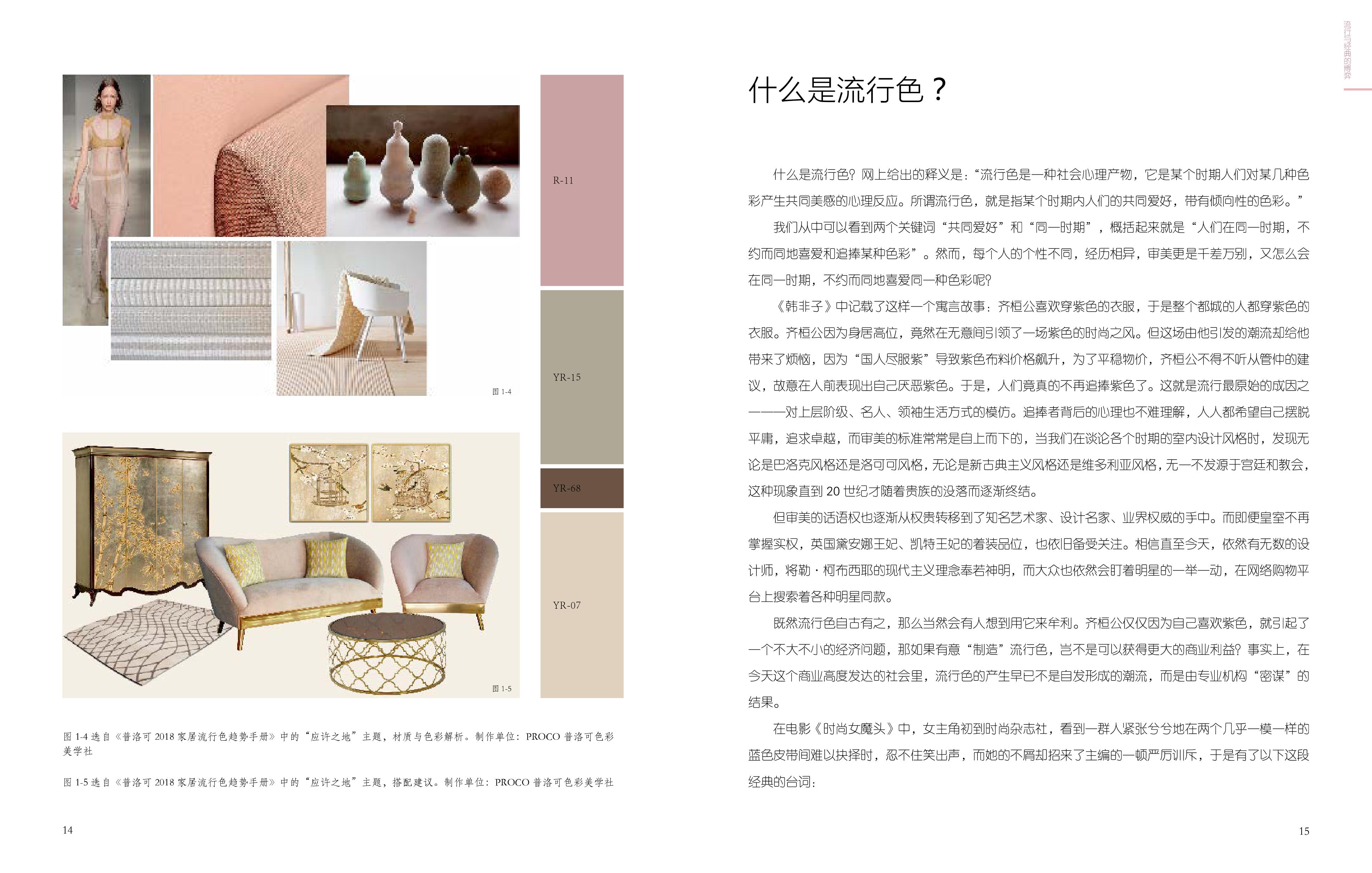 全書共分四章:第一章介紹了流行色的概念及流行色的趨勢(shì)是如何預(yù)測(cè)出來(lái)的;第二章從色彩屬性、色彩情感、色彩風(fēng)格等方面為讀者講解如何將流行色運(yùn)用在實(shí)際的設(shè)計(jì)中;第三章為百年時(shí)尚——20 世紀(jì)流行色演變,梳理了19世紀(jì)90年代至21世紀(jì)初,一百多年間的流行色演變與室內(nèi)裝潢中的色彩運(yùn)用,從歷史的角度看流行色未來(lái)的發(fā)展;第四章為家居軟裝流行色趨勢(shì)獲取渠道,讀者可以從這些渠道中獲取流行色的信息。