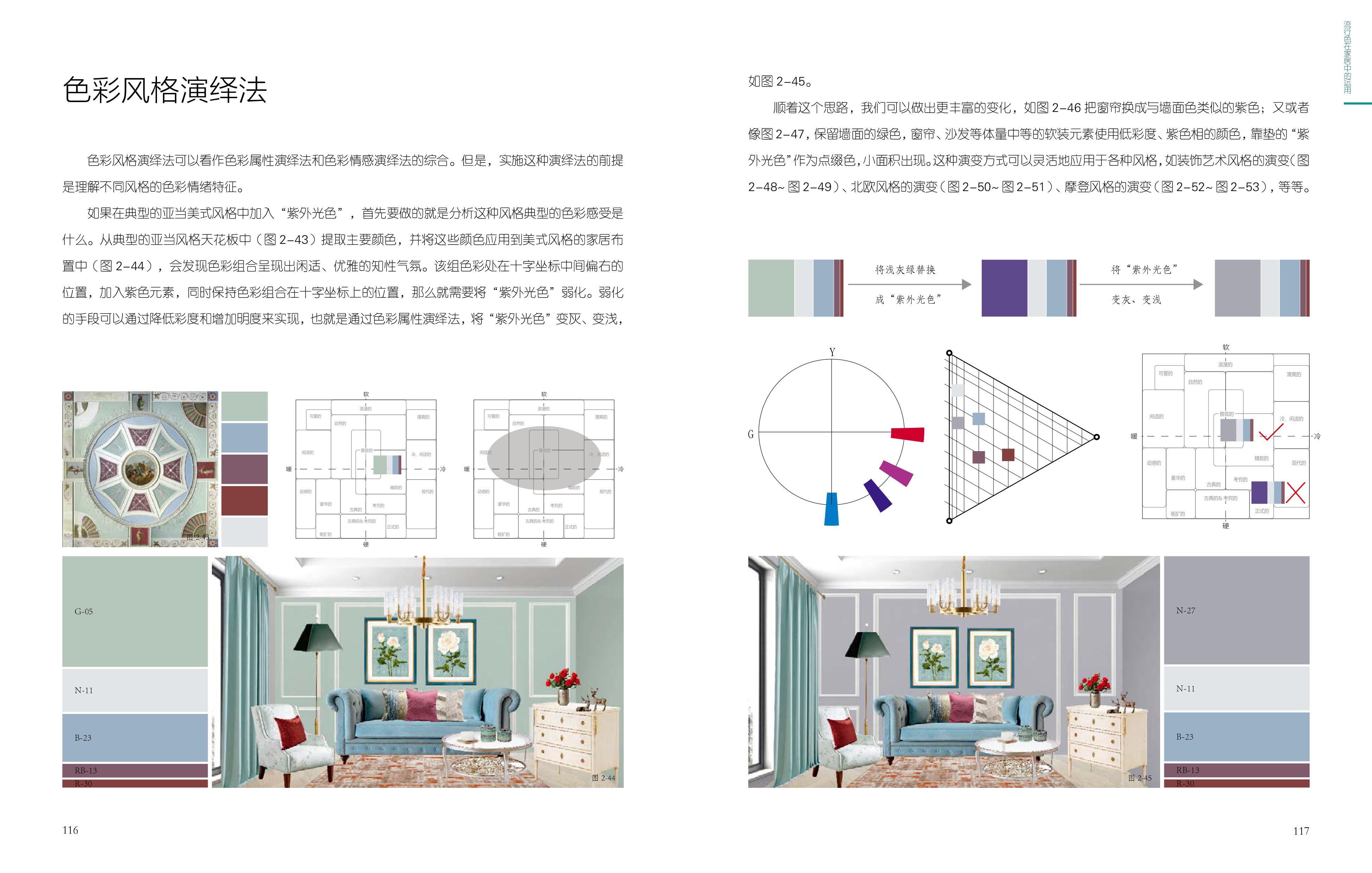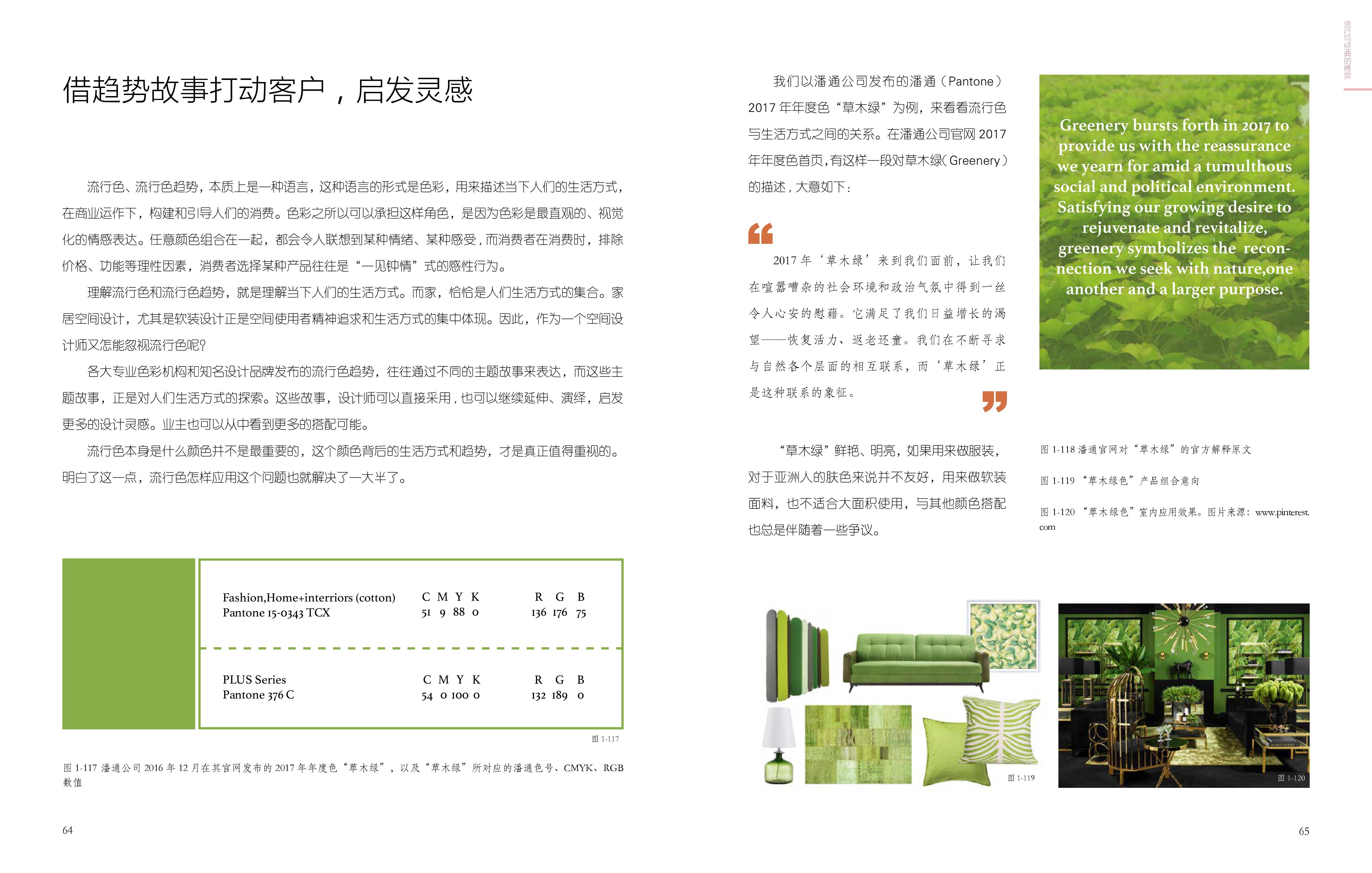 《家居流行色配色指南》不僅對(duì)流行色和已經(jīng)由流行化為經(jīng)典的風(fēng)格配色進(jìn)行了系統(tǒng)的梳理,而且給出了大量的室內(nèi)配色方案,并標(biāo)注了國(guó)際通用的潘通色號(hào)和RGB色號(hào),直接提供給設(shè)計(jì)師做配色參考。