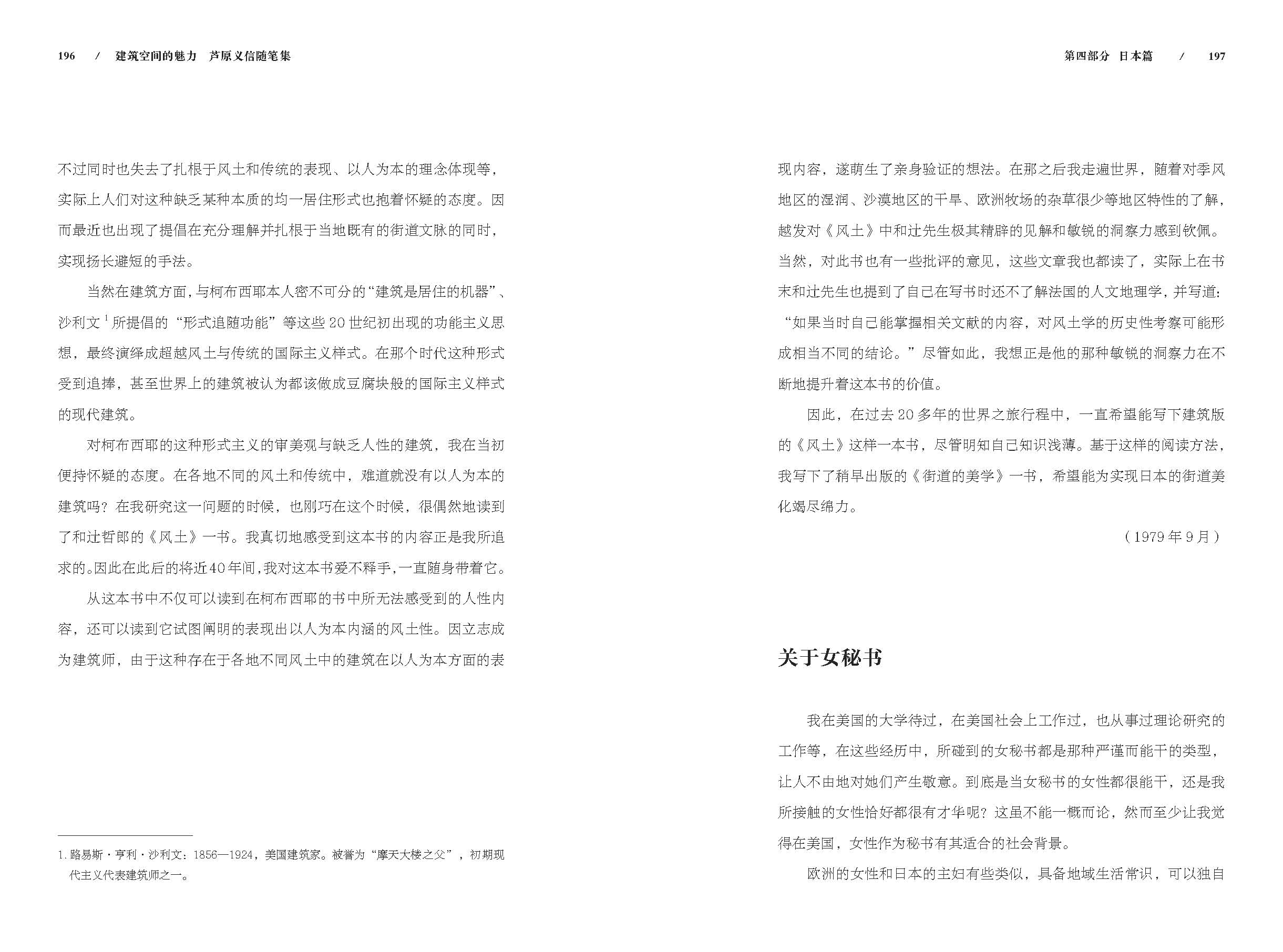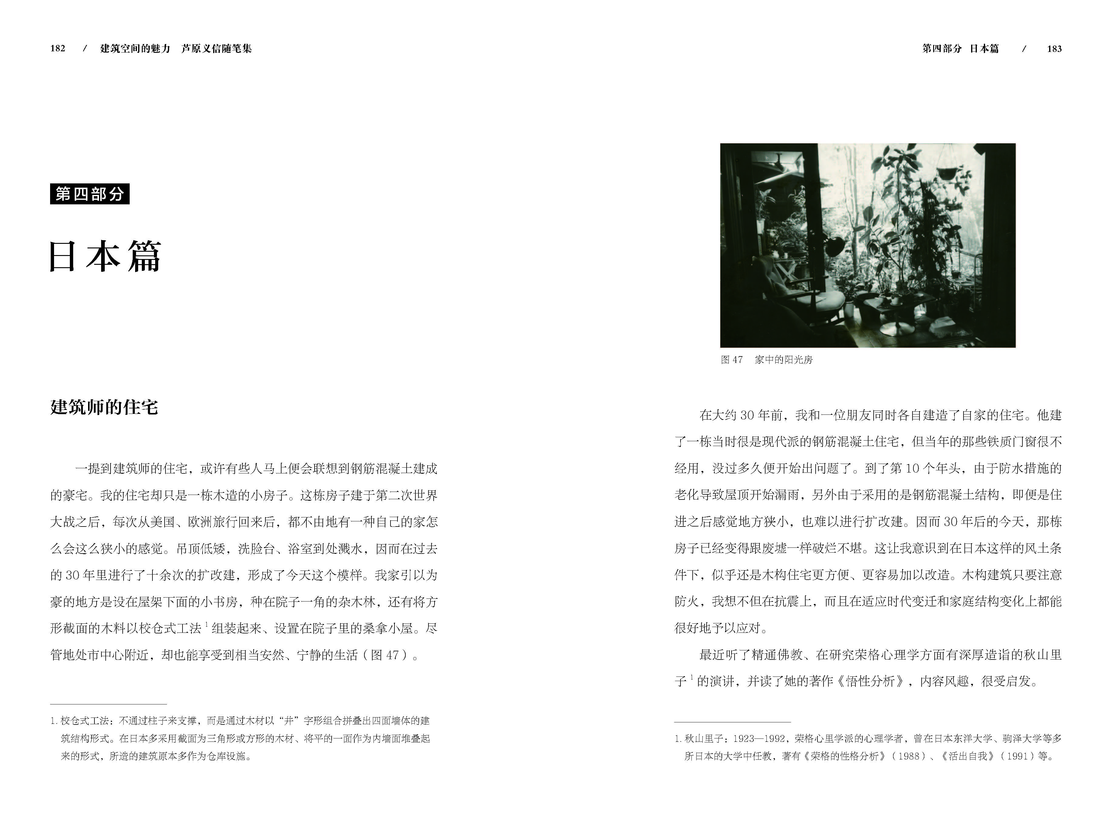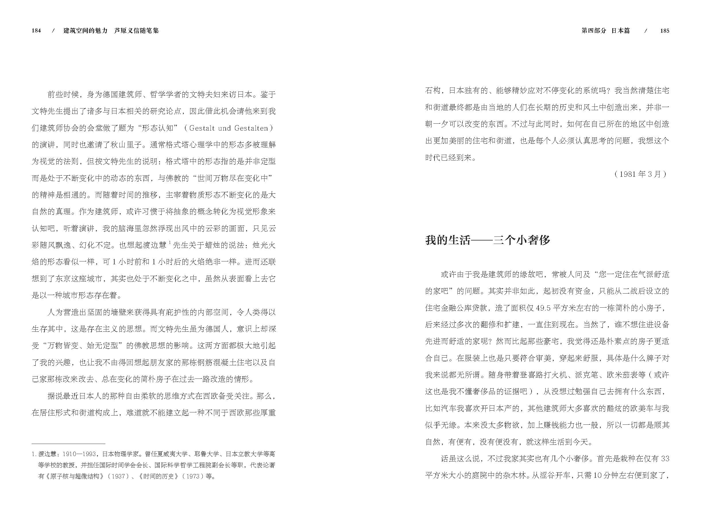 同時(shí),為讓讀者更加清晰地把握蘆原義信先生的建筑理論觀點(diǎn)全貌和增強(qiáng)本書對(duì)當(dāng)今中國讀者的意義,有幸邀請(qǐng)到清華大學(xué)建筑學(xué)院莊惟敏教授為本書加以概要點(diǎn)評(píng)。本書的編譯和出版亦得到了蘆原義信先生的建筑傳人蘆原太郎先生的大力支持,并多次提及父親在20 世紀(jì)七八十年代到中國進(jìn)行學(xué)術(shù)交流的軼事。