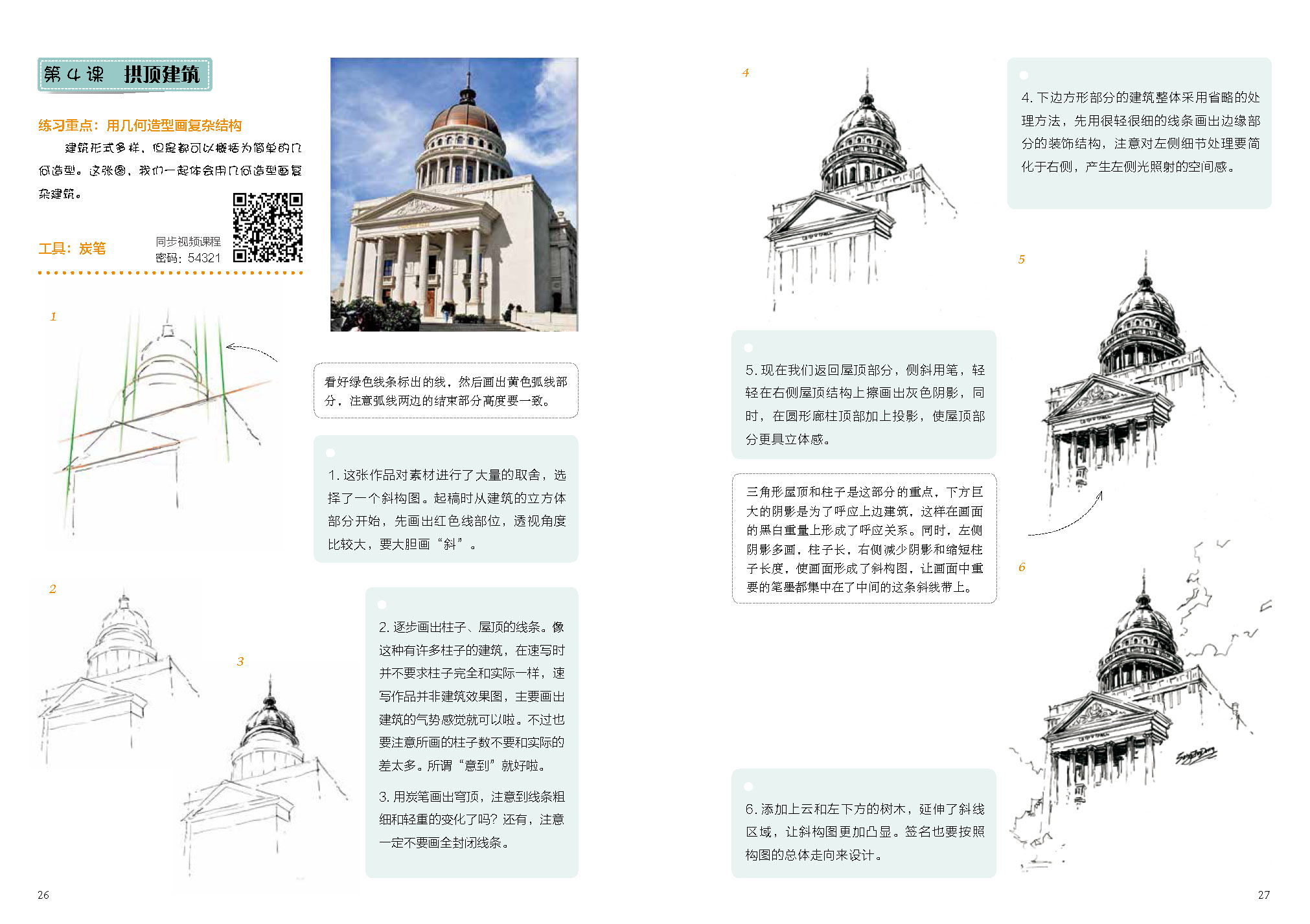 包含動物、人物、景物、交通運輸工具、建筑等內容,循序漸進,步驟清晰,講解細致。每堂課提煉速寫基礎知識重難點,一看就懂,一學就會。