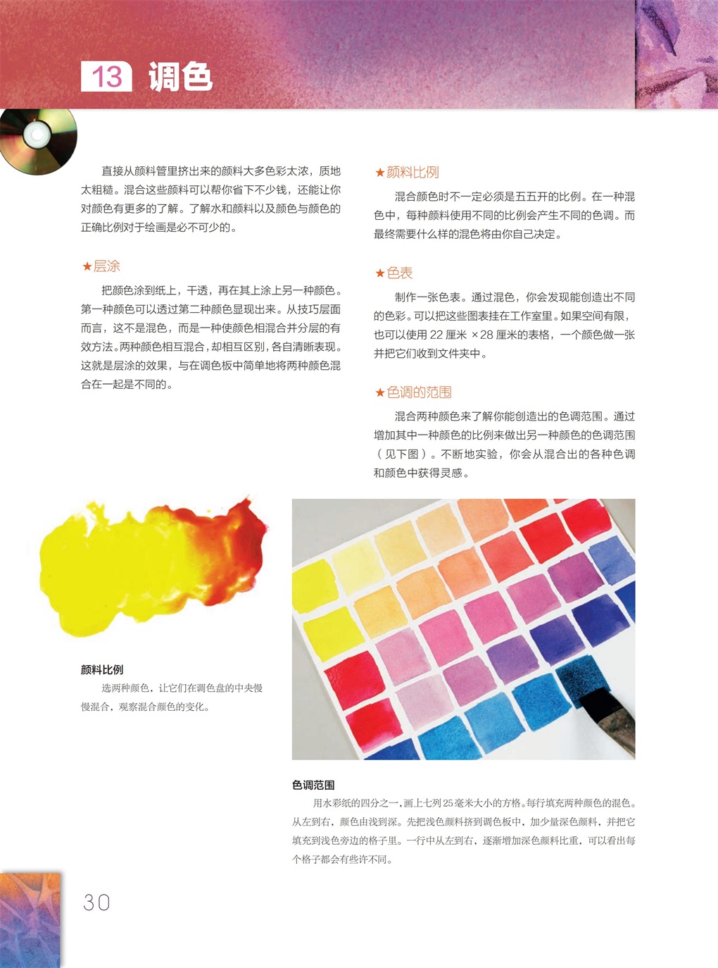 本書是零基礎(chǔ)水彩技巧說明書。同時也是能夠教你隨性畫、快樂學(xué)的水彩教程書。本書文風(fēng)嚴(yán)謹(jǐn)細(xì)膩,講解詳細(xì),是初學(xué)者入門級的必備書。36堂課程示范手把手教你畫水彩;33個練習(xí)實踐,從基礎(chǔ)技巧到高超技法的快速掌握;7種詳細(xì)示范,帶你領(lǐng)略多彩風(fēng)景,創(chuàng)作出水景、花朵等自然風(fēng)景。多種材料的運(yùn)用,教你利用生活小物與自然花草“變”出云朵、巖石紋理和鏡花水月……將生活與自然的素材完美融合到水彩作品之中,最終將自然界美好多彩的景觀展現(xiàn)在畫紙上。是人與自然有機(jī)結(jié)合的完美實例。