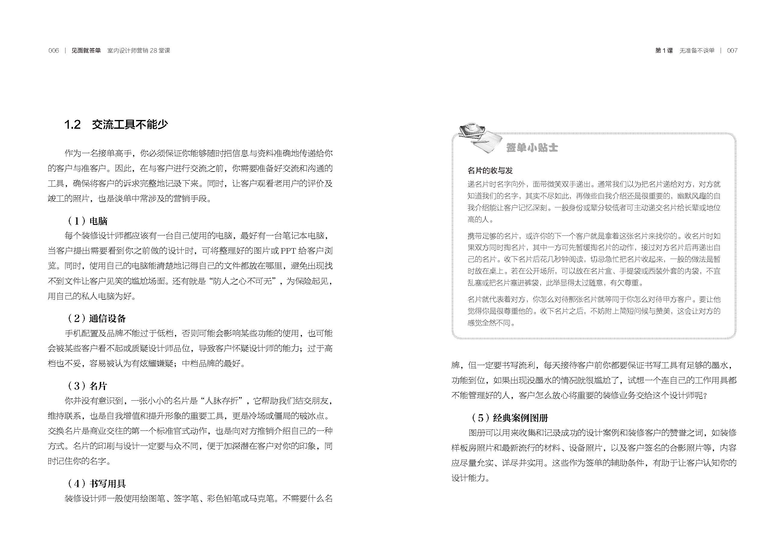 本書從設(shè)計(jì)師談單的準(zhǔn)備工作、談單中會(huì)出現(xiàn)的問題,以及簽單后如何維護(hù)客戶等方面做了十分細(xì)致的講解,幫助設(shè)計(jì)師完成從小白到簽單大神的過渡。