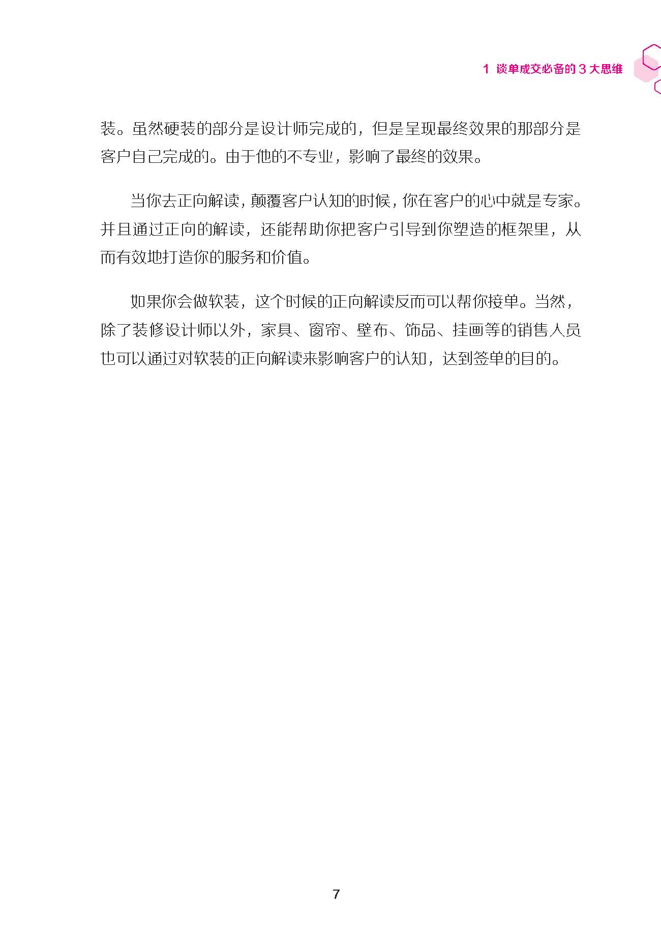 書(shū)中運(yùn)用通俗的語(yǔ)言和一個(gè)個(gè)真實(shí)的簽單故事,總結(jié)出3套簽單布局策略,如何更生動(dòng)形象的講解自己設(shè)計(jì)的故事吸引法,并給出講故事的模板,使設(shè)計(jì)師根據(jù)不同的情形靈活運(yùn)用。對(duì)客戶的心理做了詳細(xì)的分析,教你如何快速準(zhǔn)確的抓住客戶的痛點(diǎn),直擊客戶內(nèi)心,讓客戶對(duì)你產(chǎn)生信任和崇拜。并歸納出不同情況下的簽單流程,一步步照著做,牢牢抓住客戶順利簽單。