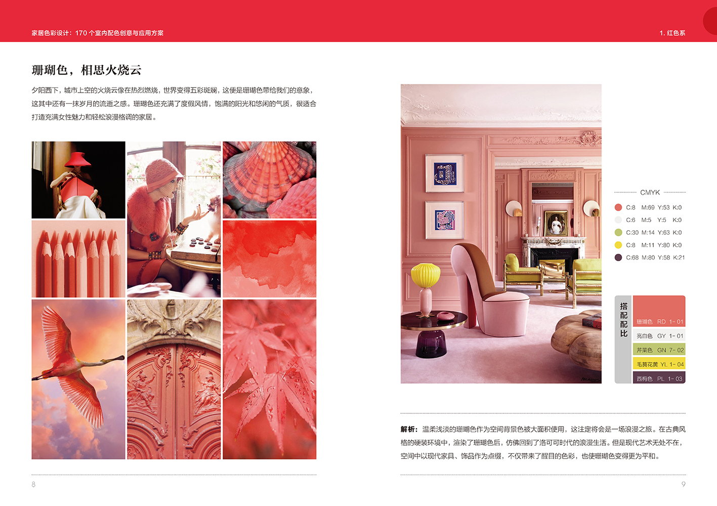 本書作者根據(jù)多年從事家居配色相關(guān)工作的經(jīng)驗(yàn),梳理出了家居中最常用到的170種色彩,并把它們按照色相分為九大色系,即紅、粉、橙、黃、棕、綠、藍(lán)、紫、灰。每一種色彩對(duì)應(yīng)一種色號(hào),方便設(shè)計(jì)師和家裝愛好者按照色號(hào)及CMYK色值找到自己需要的顏色。本書對(duì)每種色彩都進(jìn)行了解析,用詩意的語言描述了色彩帶給人的感覺以及用于家居中的效果,配合意向圖,讓讀者體會(huì)到這種色彩的魅力;并且每種色彩都提供了一套對(duì)應(yīng)的家居案例,展現(xiàn)此色彩在家居中的應(yīng)用創(chuàng)意,作者對(duì)此家居案例也進(jìn)行了解析,說明案例的家居風(fēng)格、配色方案及家具使用等,方便讀者深入了解案例的精彩之處,并能夠運(yùn)用到自己的設(shè)計(jì)中。