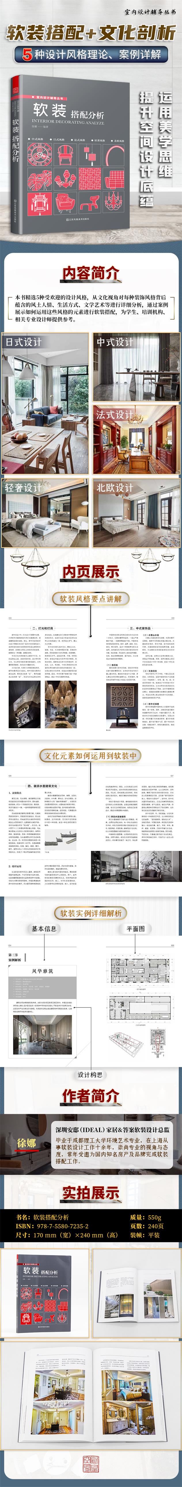 內(nèi)容方面,主要從提升設(shè)計師底蘊的初衷出發(fā),從文化的視角對每一種裝飾風格背后涵蓋的國家或民族的風土人情、生活方式、文學藝術(shù)、行業(yè)規(guī)范和價值觀念等進行了詳細分析,并通過案例展示如何進行軟裝搭配,去偽存真,具有較強的指導意義,適合學生、培訓機構(gòu)的學員以及相關(guān)專業(yè)設(shè)計師進行參考。