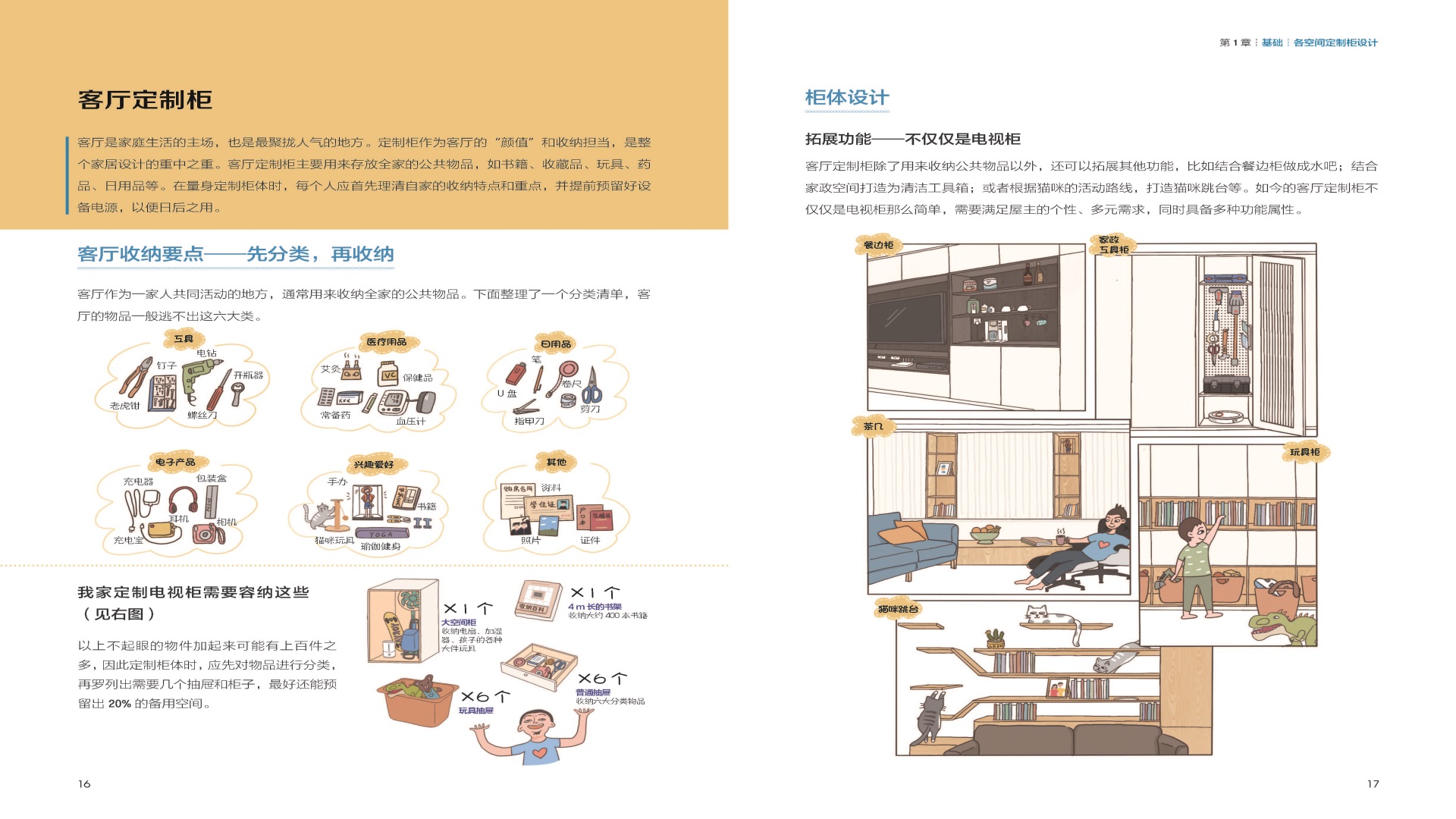 200+手繪插圖,輕松活潑,降低理解門檻,玄關、客廳、廚房、餐廳和臥室定制柜設計詳解,將定制柜設計與空間屬性緊密結合;精心繪制26幅定制柜詳解圖,拿來就能用。
