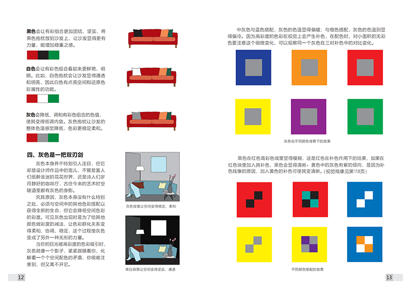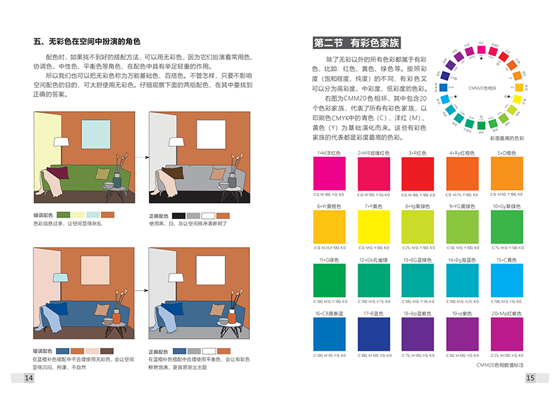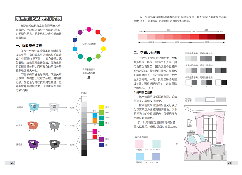 本書是針對新人室內(nèi)設計師學習軟裝配色的一本通,全書分為四章,第一章主要介紹色彩的基礎認知,包含無彩色系配色、有彩色系配色、色彩的空間結(jié)構(gòu)、色彩的情緒、色彩冷暖等,第二章講配色法則的實戰(zhàn)運用,包含配色邏輯法則黃金比例法則、同頻配色法則、呼應配色法則、平衡配色法則、突顯法則。第三章介紹色相型配色的原理和實戰(zhàn)運用,分別從素美配、自家配、 鄰里配、遠親配、撞色配、多色配方面來解講。第四章主要是講如何搭配出打動人心的配色,包含色彩印象與配色的關系、找到你心中的喜好色和喜好色分類及分析、空間色彩定位、如何制作配色情緒板、配色的多種可能、九宮格印象配色及九宮格印象連接形與質(zhì)。最后是配色訓練,結(jié)合每章節(jié)的知識點,為讀者提成課后練手。本書不但標明各種色彩的色值,還在重要的小節(jié)后安排了配色的涂色練習作業(yè),有興趣的更可以把配色作業(yè)上傳到作業(yè)的微信,作者更可進行點評指導,該書立足于理論與實踐相結(jié)合,使讀者獲得立桿見影的效果。