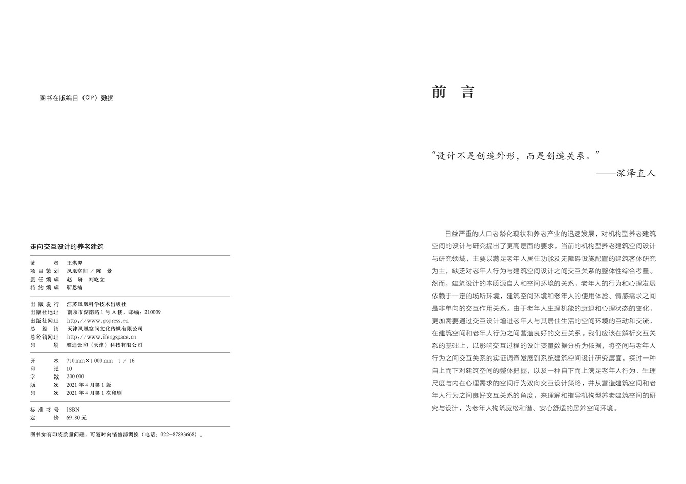 本書共分為六章:第一章,老齡化背景、養(yǎng)老福祉政策與養(yǎng)老建筑類型體系,介紹并比較世界各國養(yǎng)老保障政策與相關(guān)設(shè)施的建設(shè)情況,探討?zhàn)B老建筑交互設(shè)計(jì)的目的和意義;第二章,養(yǎng)老建筑交互設(shè)計(jì)理論,科學(xué)界定交互設(shè)計(jì)概念,分析世界各國交互設(shè)計(jì)現(xiàn)狀;第三章,養(yǎng)老建筑交互設(shè)計(jì)對(duì)象,詳細(xì)分析交互客體對(duì)象(建筑空間);第四章,養(yǎng)老建筑交互設(shè)計(jì)過程,詳細(xì)分析交互過程中老年人與建筑空間的相互影響;第五章,養(yǎng)老建筑空間與老年人行為的交互設(shè)計(jì)模式與策略;結(jié)語。