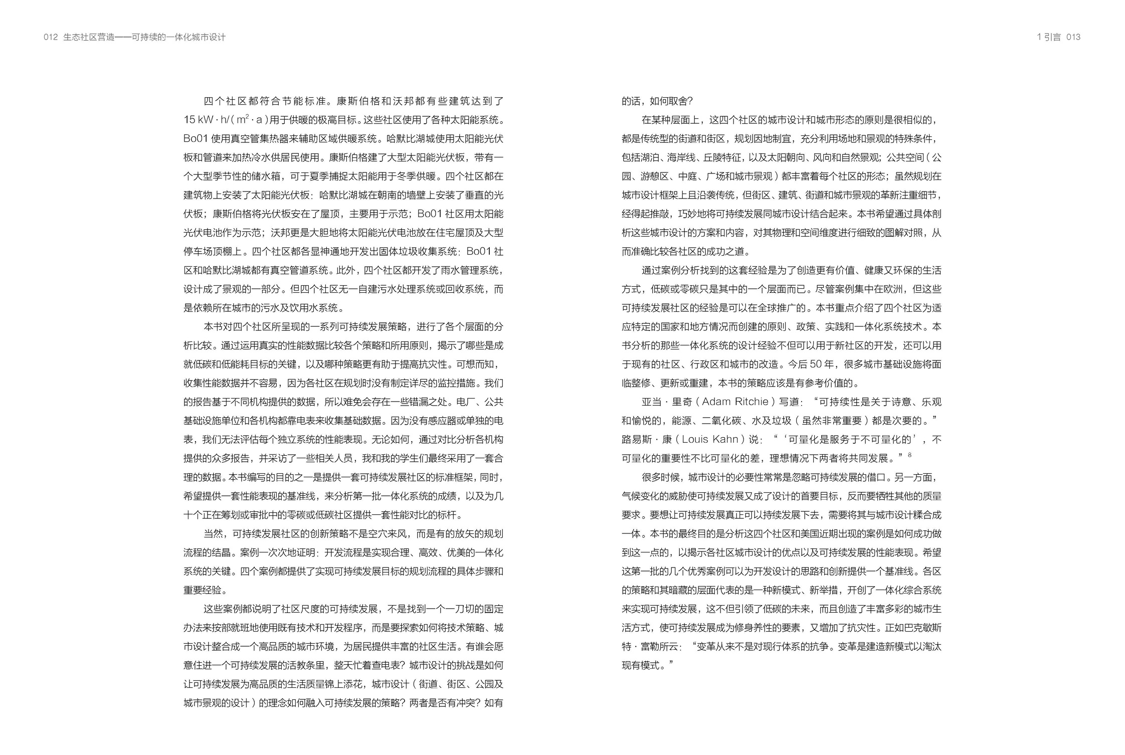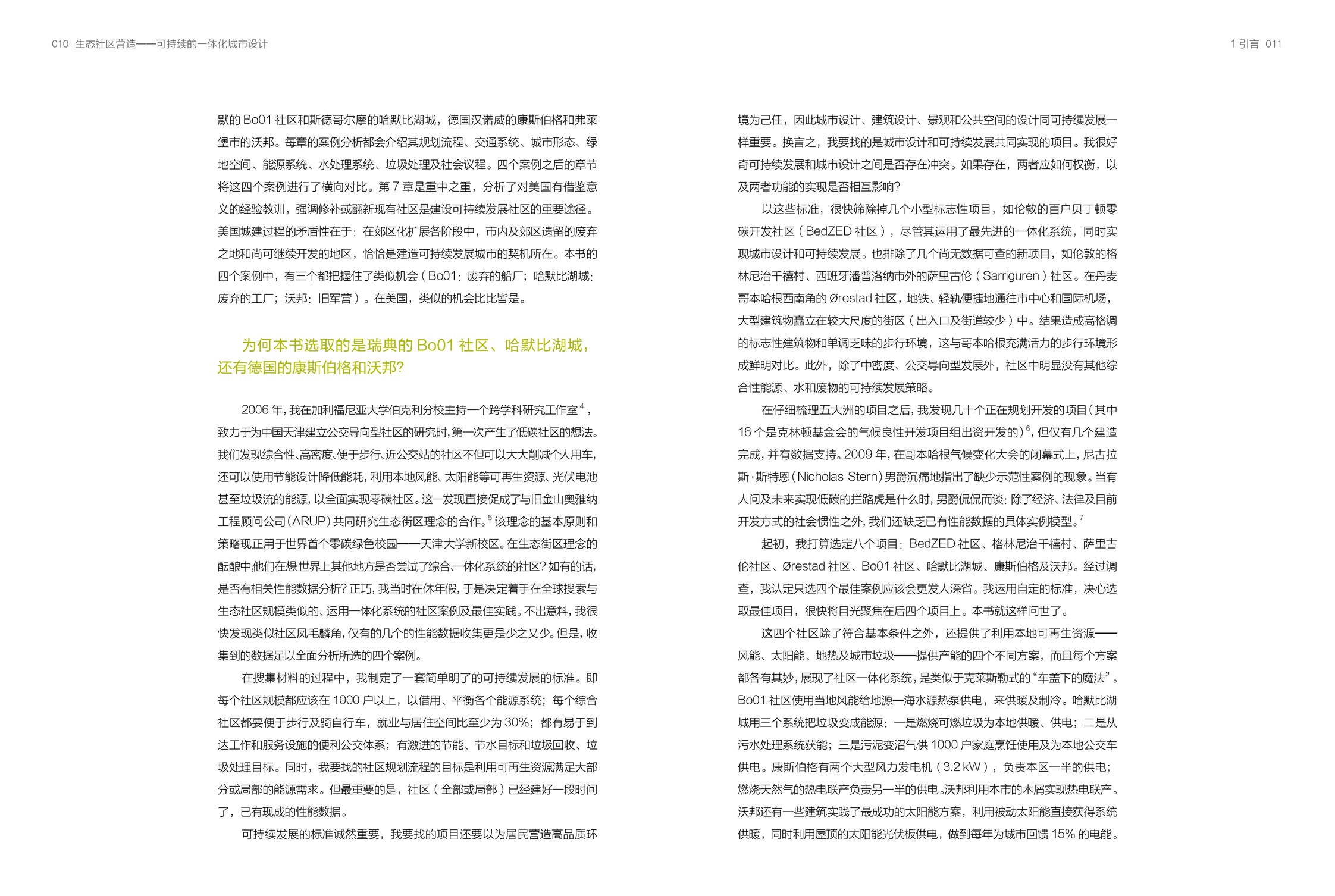 本書探討了第一批低碳社區(qū)的最佳實(shí)例,驗(yàn)證了社區(qū)一體化系統(tǒng)的重要性,并指出了更區(qū)域化、更抗災(zāi)的基礎(chǔ)設(shè)施的方向,也表明“人作為一個參與環(huán)節(jié)”對實(shí)現(xiàn)規(guī)劃流程目標(biāo)的決定性作用。本書選取了四個實(shí)現(xiàn)可持續(xù)發(fā)展的經(jīng)典社區(qū):瑞典馬爾默的Bo01 社區(qū)和斯德哥爾摩的哈默比湖城,德國漢諾威的康斯伯格和弗萊堡市的沃邦。每章的案例分析都會介紹其規(guī)劃流程、交通系統(tǒng)、城市形態(tài)、綠地空間、能源系統(tǒng)、水處理系統(tǒng)、垃圾處理及社會議程。四個案例之后的章節(jié)將這四個案例進(jìn)行了橫向?qū)Ρ?。? 章分析了對美國有借鑒意義的經(jīng)驗(yàn)教訓(xùn),強(qiáng)調(diào)修補(bǔ)或翻新現(xiàn)有社區(qū)是建設(shè)可持續(xù)發(fā)展社區(qū)的重要途徑。美國城建過程的矛盾性在于:在郊區(qū)化擴(kuò)展各階段中,市內(nèi)及郊區(qū)遺留的廢棄之地和尚可繼續(xù)開發(fā)的地區(qū),恰恰是建造可持續(xù)發(fā)展城市的契機(jī)所在。本書的四個案例中,有三個都把握住了類似機(jī)會(Bo01:廢棄的船廠;哈默比湖城:廢棄的工廠;沃邦:舊軍營)。這些實(shí)例和分析,對于我們現(xiàn)在的城市建設(shè),舊城更新和可持續(xù)社區(qū)的一體化設(shè)計(jì)十分具有參考價值。