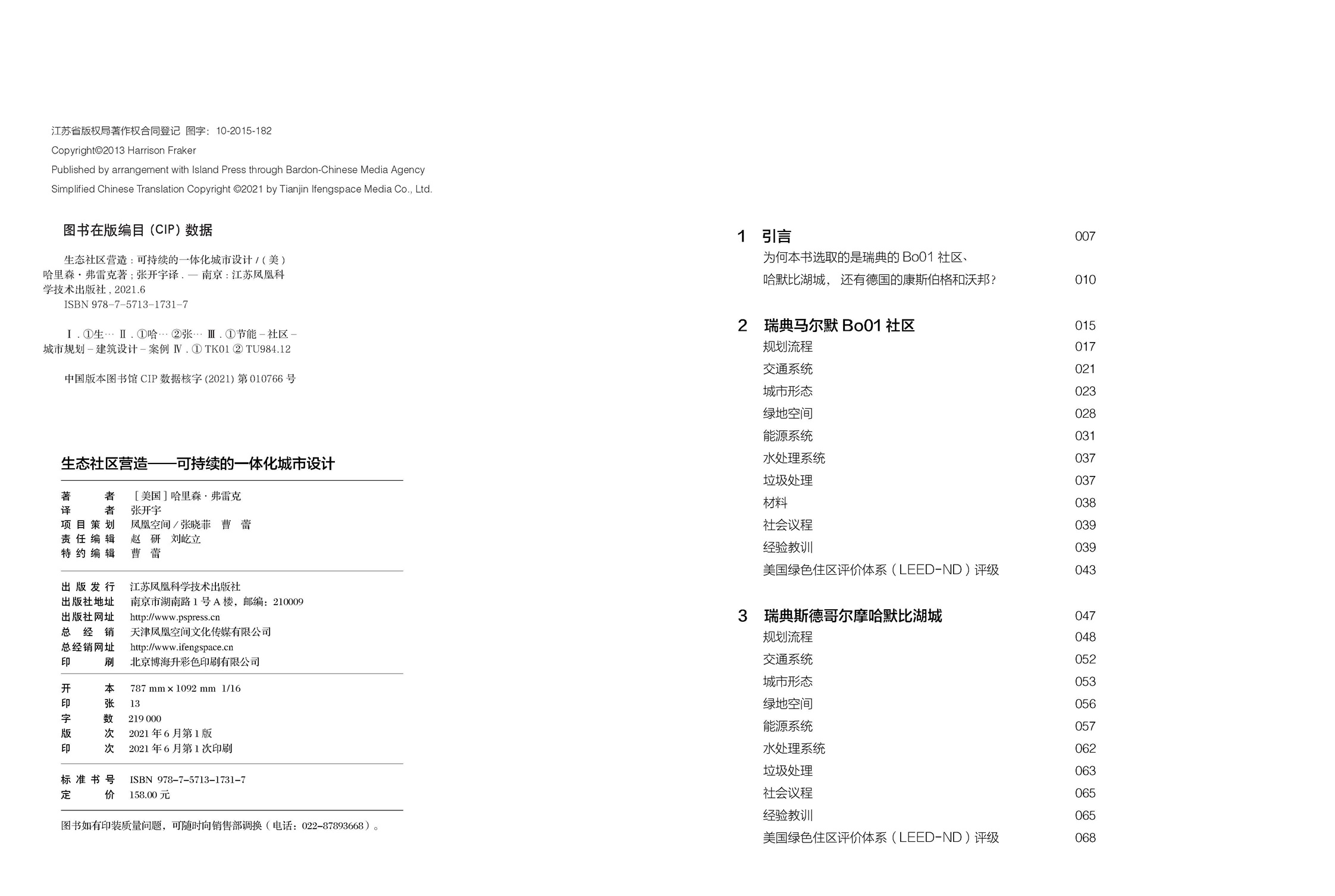 本書通過對歐洲第一代生態(tài)低碳社區(qū)案例清晰并深度的解析,為讀者解答了抽象理論的困惑,并提供了生態(tài)社區(qū)最佳實(shí)踐方法的整體模型。全書分為8個章節(jié),前五章對四個經(jīng)典案例,從規(guī)劃流程、交通系統(tǒng)、城市形態(tài)、綠地空間、水處理系統(tǒng)等幾個方面詳細(xì)地分析了每一個案例的發(fā)展過程及目標(biāo),并對每一個案例進(jìn)行總體評估、總結(jié)優(yōu)勢與不足。6-8章,將所有案例進(jìn)行橫向?qū)Ρ确治?,總結(jié)經(jīng)驗(yàn)和可借鑒之處,進(jìn)行了總結(jié)和提煉升華,對現(xiàn)有的城市社區(qū)提出實(shí)際可行的整改意見。對于生態(tài)社區(qū)的規(guī)劃和建設(shè)具有較強(qiáng)的參考價值。