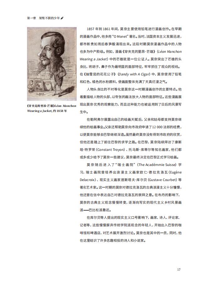 本書揭秘了印象派泰斗人物——莫奈的精彩人生。從一個桀驁不馴的少年到意氣風發(fā)的天才畫家,再到溫和的鄉(xiāng)村風景畫家、專注變化的追光者,最后成為后花園的園丁,圖書從小到老講述了莫奈的一生,并結(jié)合120副代表畫作、莫奈的自述、人生旅跡地圖、年代重要紀事及其朋友圈的評論等方面深入解析這位藝術大家的生活與繪畫創(chuàng)作的背后故事。