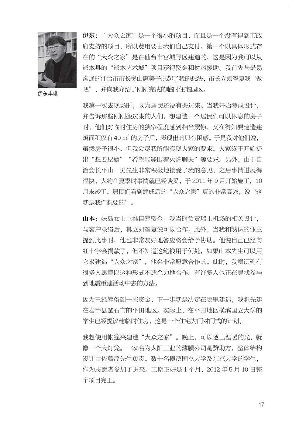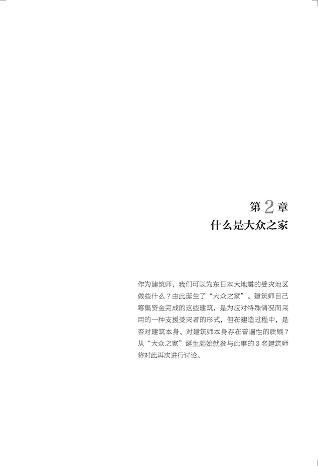本書是伊東豐雄在3?11東日本大地震之后關(guān)于建筑設(shè)計(jì)所行所思的深刻回顧,他聯(lián)合山本理顯、妹島合世、平田晃久、大西麻貴、曾我部昌史等日本知名建筑師發(fā)起災(zāi)后重建項(xiàng)目“大眾之家”,旨在鼓舞受災(zāi)民眾,讓他們?cè)诰葹?zāi)應(yīng)急建筑中也能感到舒服、得到安慰。書中詳細(xì)記錄項(xiàng)目實(shí)施過程并收集了項(xiàng)目平面圖、剖面圖及手繪圖。全書分為五章:走向大眾之家、什么是大眾之家、大眾之家,從東北開始、大眾之家,在熊本、大眾之家與熊本藝術(shù)城。
