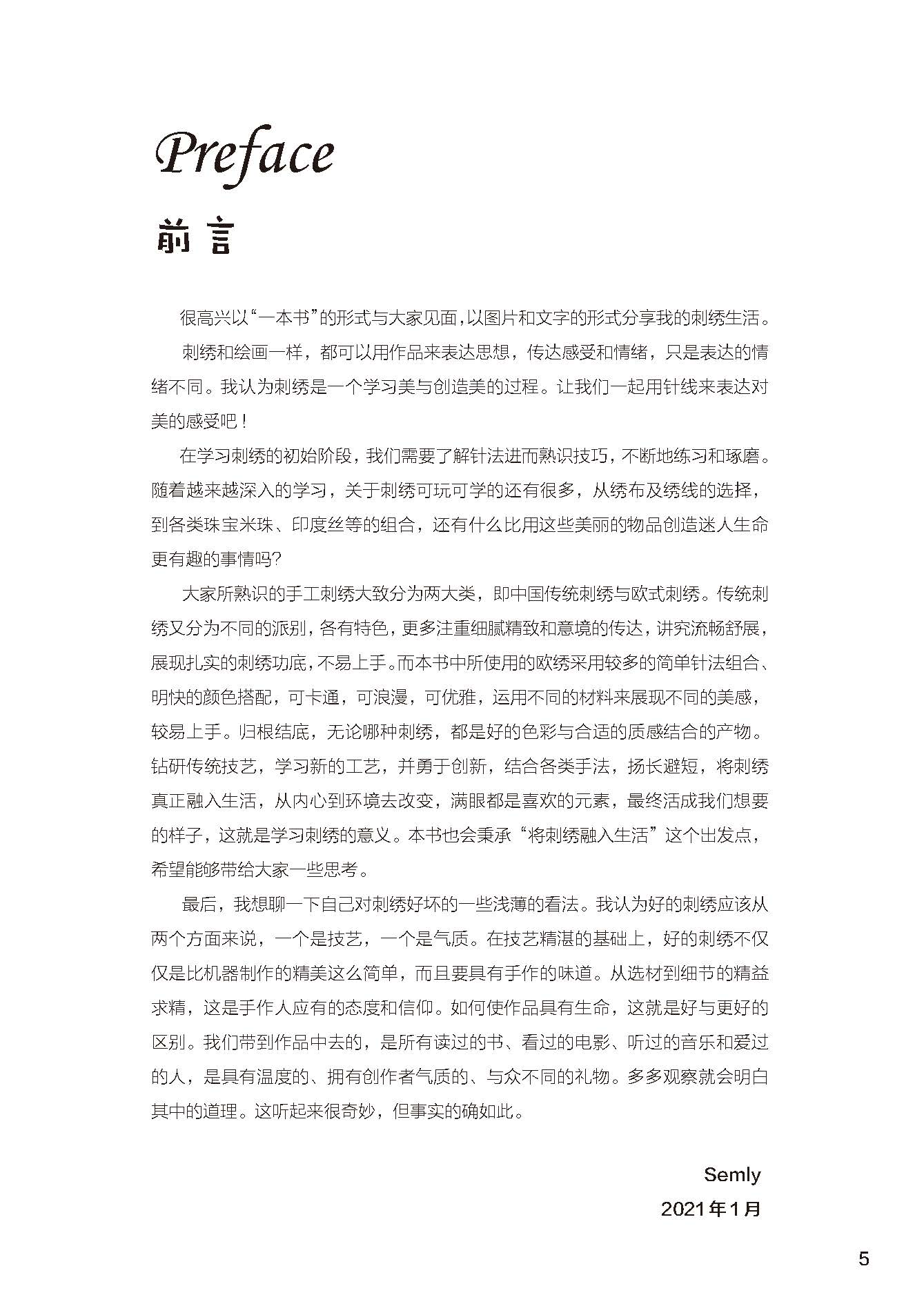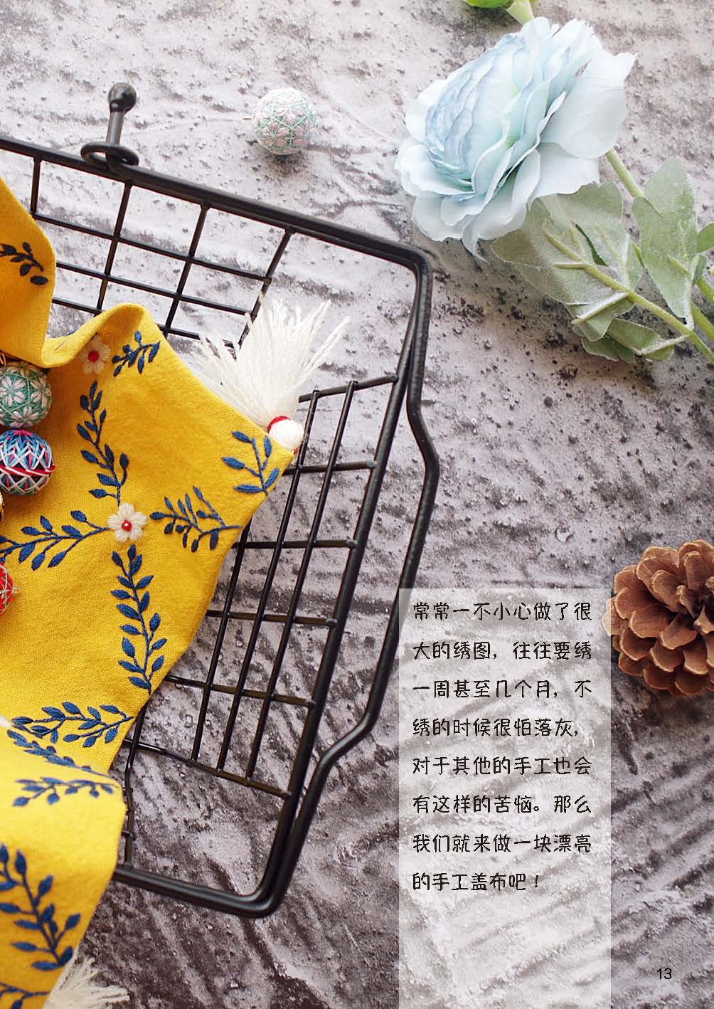 本書中所使用的歐繡采用較多的簡單針法組合、明快的顏色搭配,可卡通,可浪漫,可優(yōu)雅,運(yùn)用不同的材料來展現(xiàn)不同的美感,較易上手。歸根結(jié)底,無論哪種刺繡,都是好的色彩與合適的質(zhì)感結(jié)合的產(chǎn)物。鉆研傳統(tǒng)技藝,學(xué)習(xí)新的工藝,并勇于創(chuàng)新,結(jié)合各類手法,揚(yáng)長避短,將刺繡真正融入生活,從內(nèi)心到環(huán)境去改變,滿眼都是喜歡的元素,最終活成我們想要的樣子,這就是學(xué)習(xí)刺繡的意義。本書也會秉承“將刺繡融入生活”這個(gè)出發(fā)點(diǎn),希望能夠帶給大家一些思考。