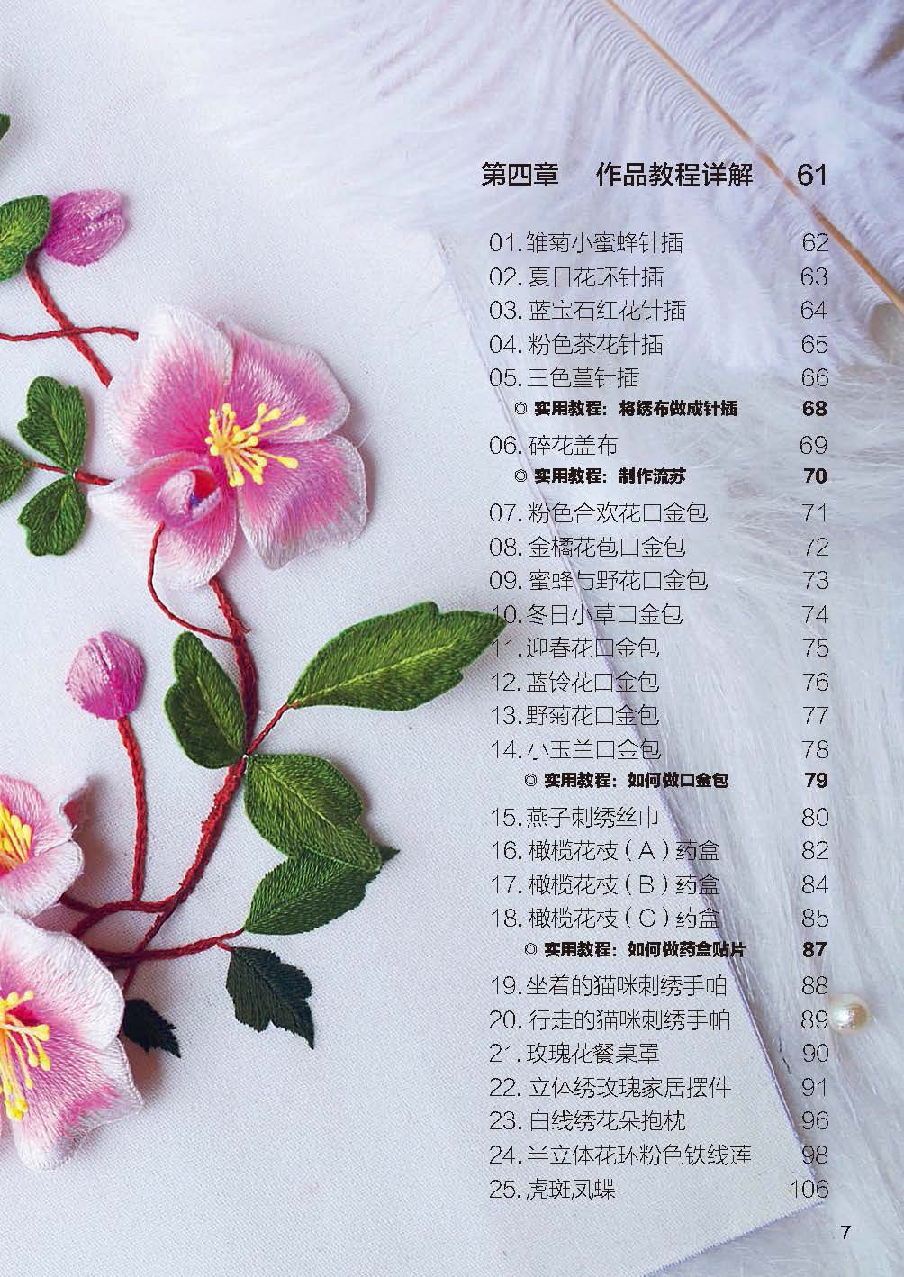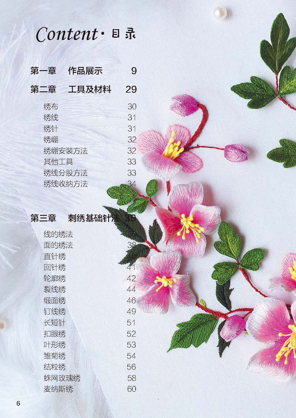 《刺繡入門 森系立體實(shí)用刺繡小物輕松做》本書一共分為四個(gè)章節(jié)的內(nèi)容,第一章刺繡成品展示,第二章 工具及材料 ,第三章 刺繡基礎(chǔ)針法,第四章 作品教程詳解。玫瑰花餐桌罩、 立體繡玫瑰家居擺件、 白線繡花朵抱枕、半立體花環(huán)粉色鐵線蓮、虎斑鳳蝶。刺繡和繪畫一樣,都可以用作品來表達(dá)思想,傳達(dá)感受和情緒,只是表達(dá)的情緒不同。刺繡是一個(gè)學(xué)習(xí)美與創(chuàng)造美的過程。讓我們一起用針線來表達(dá)對美的感受吧 !在技藝精湛的基礎(chǔ)上,好的刺繡不僅僅是比機(jī)器制作的精美這么簡單,而且要具有手作的味道。從選材到細(xì)節(jié)的精益求精,這是手作人應(yīng)有的態(tài)度和信仰。如何使作品具有生命,這就是好與更好的區(qū)別。我們帶到作品中去的,是所有讀過的書、看過的電影、聽過的音樂和愛過的人,是具有溫度的、擁有創(chuàng)作者氣質(zhì)的、與眾不同的禮物。多多觀察就會明白其中的道理。這聽起來很奇妙,但事實(shí)的確如此。
