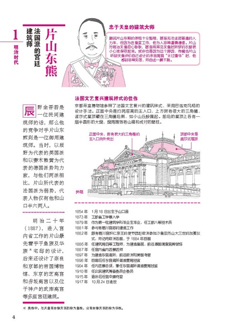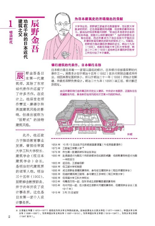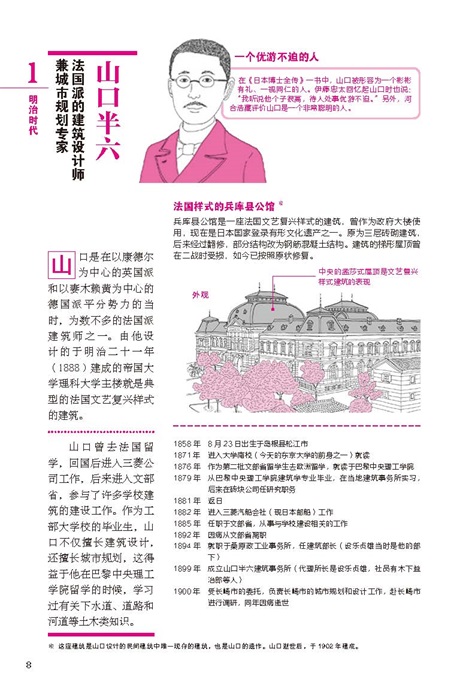 本書以建筑專業(yè)人士的視角,帶領讀者領略日本近代建筑之美,分享建筑師的故事。日本建筑學研究者二村悟,通過自己大學時期學習建筑的歷程為讀者精選了自日本明治時代到昭和時代結束的121年間的63位日本建筑師。較為系統(tǒng)的為讀者講解了日本近代建筑的發(fā)展。全書憑借精美的建筑手繪插畫與樸實生動的語言為讀者生動再現了那一特定歷史時期日本建筑師們的學習與成長歷程,以及其建筑杰作的設計流派和理念。力求以通俗易懂、生動有趣的語言帶領讀者們去探尋日本建筑師和他們作品背后的故事。