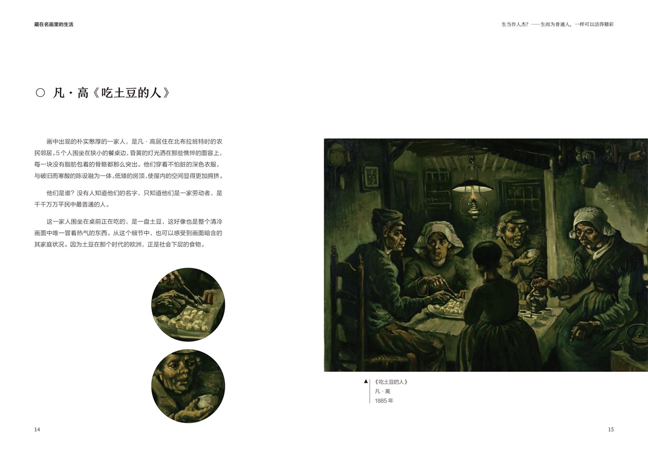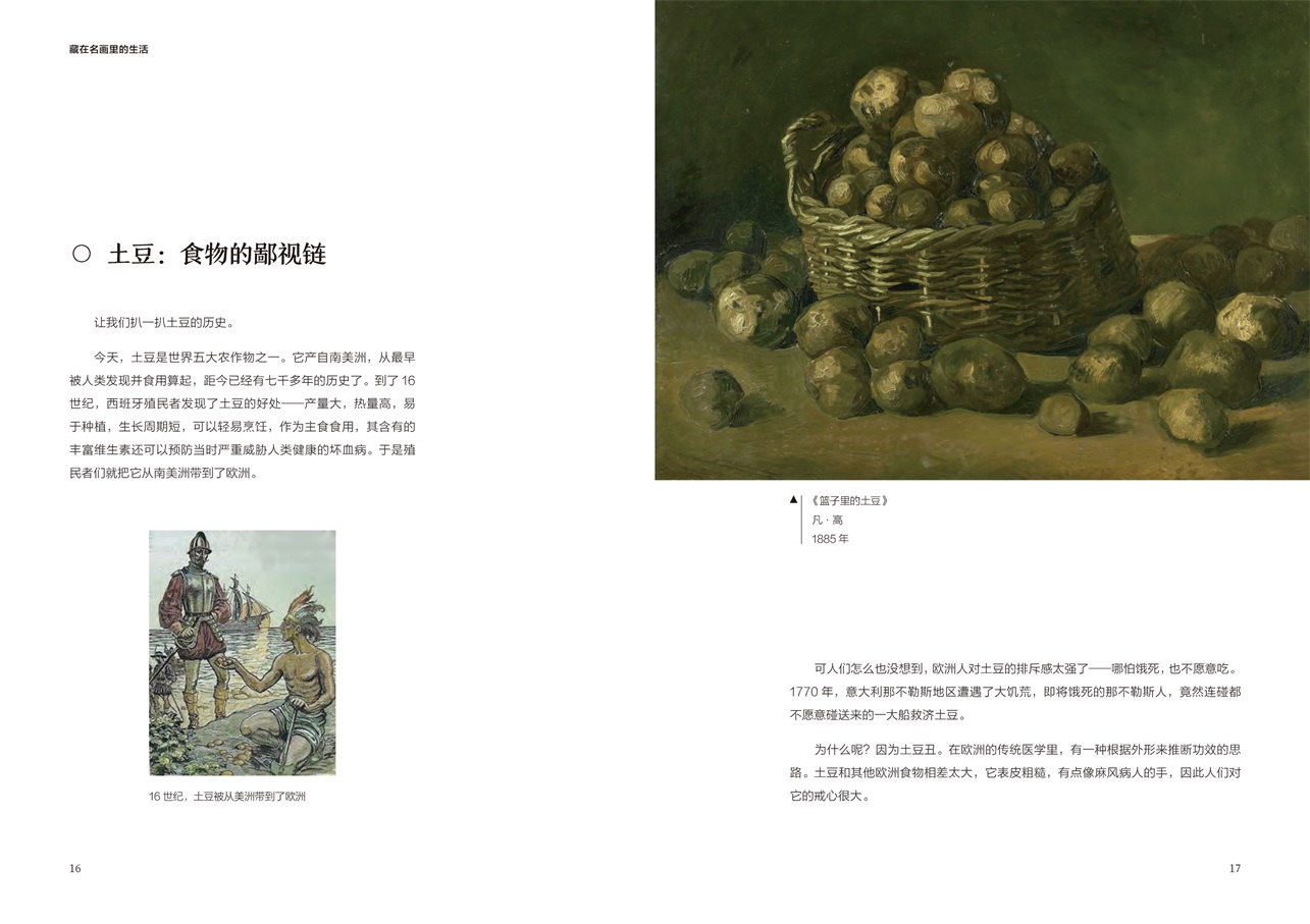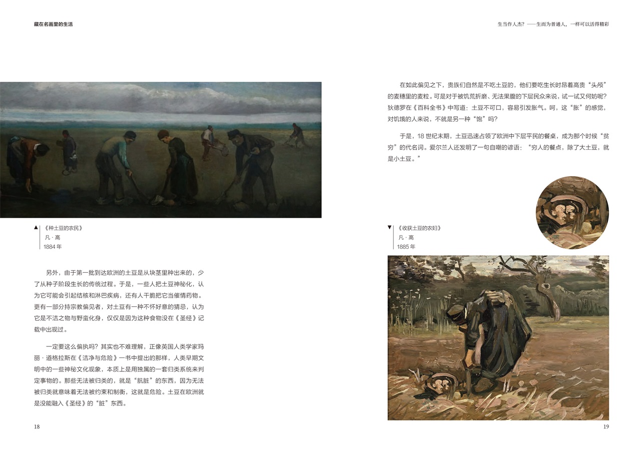 金燦燦、黃澄澄、藝術氣息滿滿的《向日葵》是出現在各類藝術場合的??停聦嵣?,梵高筆下那土黃土黃、又土又黃,一看就接地氣的土豆,也有著深刻的意義——這位大畫家把目光聚焦在餐桌上,用他的畫筆反映了當時歐洲普通人的生活。同樣的,一代長卷、絕世佳作《清明上河圖》也是北宋時期中國普通人生活的縮影,里面不但有外賣小哥出沒于飯店取餐,還能看到當時流行的瓦舍演出,能從中感受到人們生活的樂趣。事實上,每幅畫作都有自己的時代背景,都或多或少反映了當時人們的生活細節(jié)。我們這本書就通過這樣的解讀,讓讀者從“人生”“物語”“習俗”三個維度了解不同時期中西方人們的生活。正如作者所說,“從具象的畫面中觀察每個人的生活,甚至想象他們的對話和心理。于是,那些過去的人就都動起來了,那些凝固的生活畫面也都活過來了”。希望這本書能夠帶給你更多有意思的體驗。