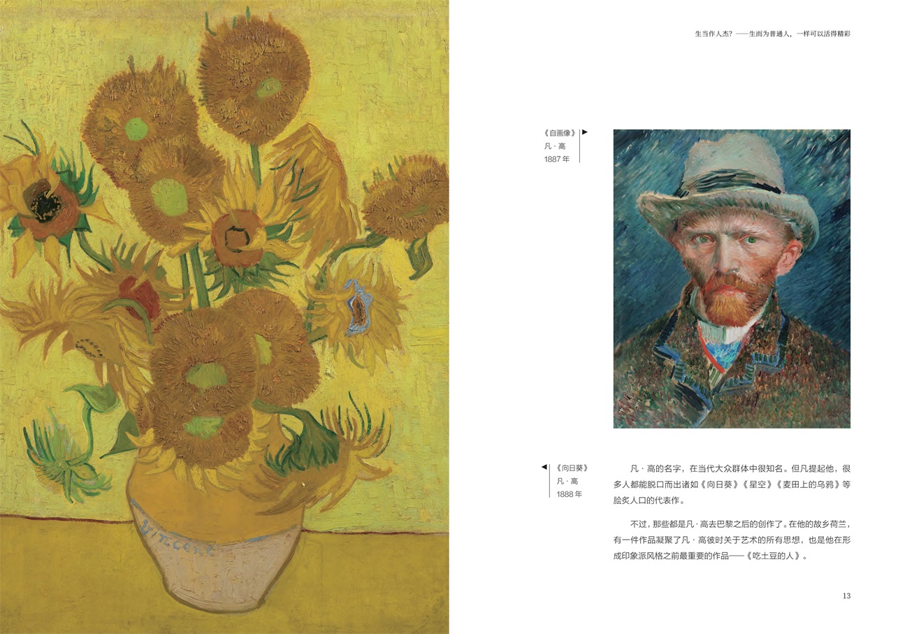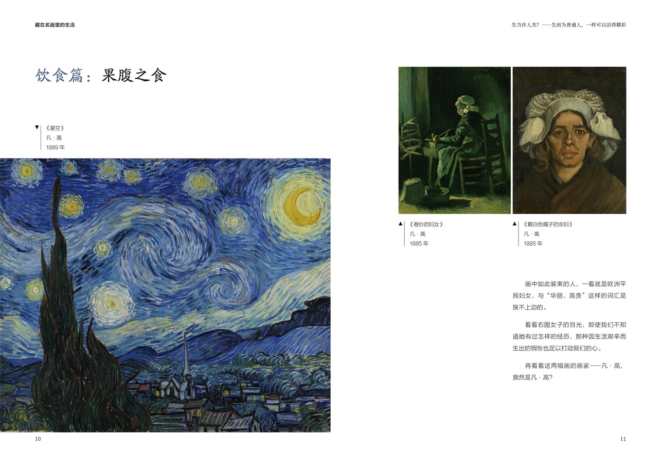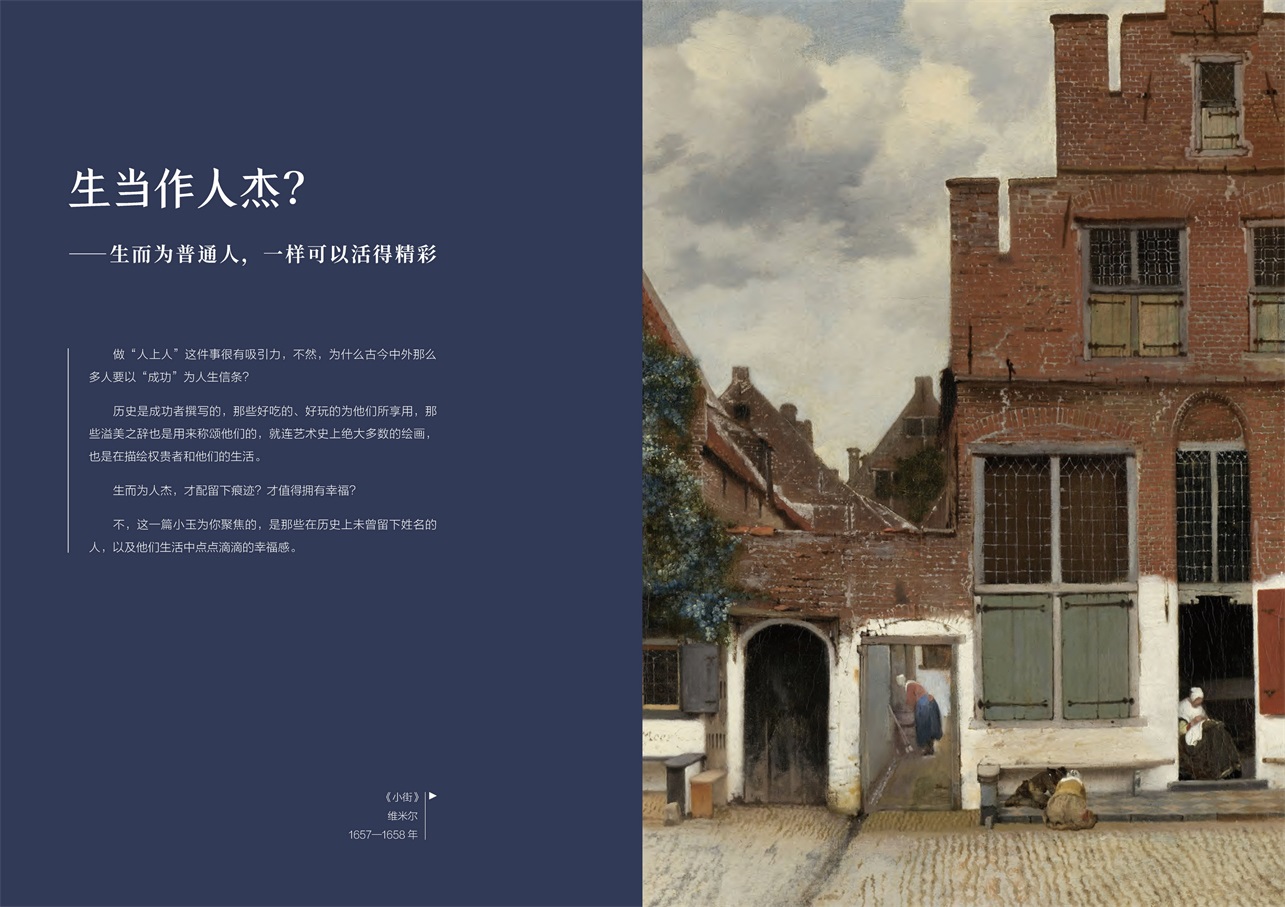 金燦燦、黃澄澄、藝術氣息滿滿的《向日葵》是出現在各類藝術場合的??停聦嵣?,梵高筆下那土黃土黃、又土又黃,一看就接地氣的土豆,也有著深刻的意義——這位大畫家把目光聚焦在餐桌上,用他的畫筆反映了當時歐洲普通人的生活。同樣的,一代長卷、絕世佳作《清明上河圖》也是北宋時期中國普通人生活的縮影,里面不但有外賣小哥出沒于飯店取餐,還能看到當時流行的瓦舍演出,能從中感受到人們生活的樂趣。事實上,每幅畫作都有自己的時代背景,都或多或少反映了當時人們的生活細節(jié)。我們這本書就通過這樣的解讀,讓讀者從“人生”“物語”“習俗”三個維度了解不同時期中西方人們的生活。正如作者所說,“從具象的畫面中觀察每個人的生活,甚至想象他們的對話和心理。于是,那些過去的人就都動起來了,那些凝固的生活畫面也都活過來了”。希望這本書能夠帶給你更多有意思的體驗。