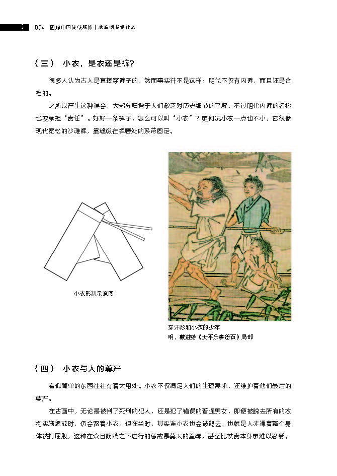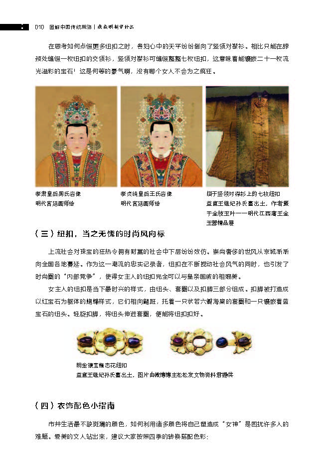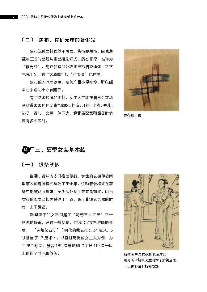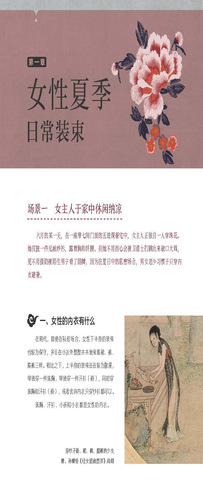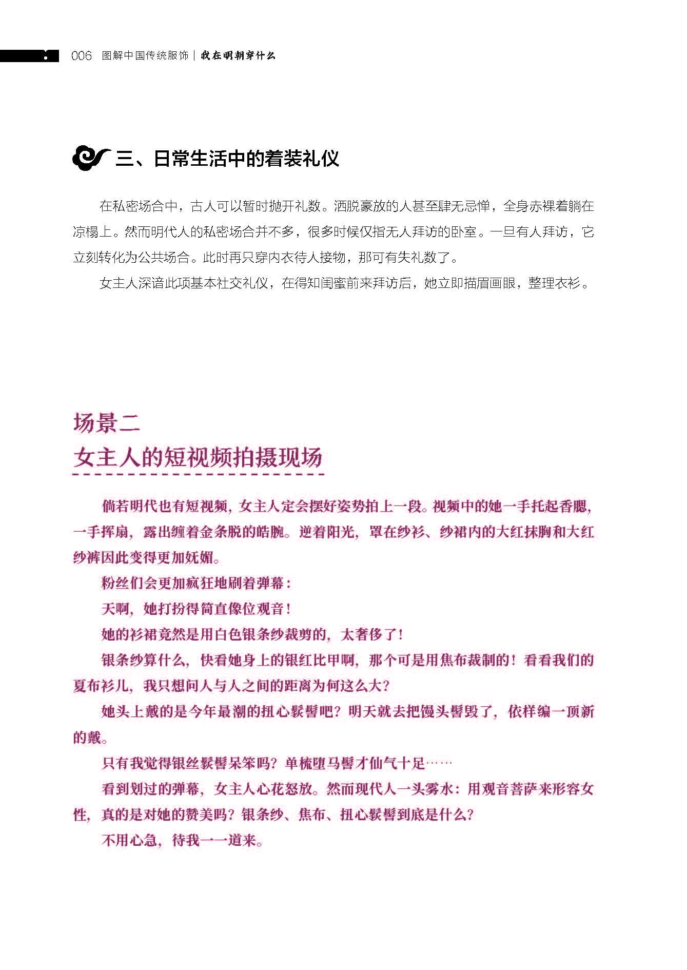 本書以有趣的場景代入式寫法,向讀者栩栩如生地展示了明代人的著裝與飾品。全書通過12章30個(gè)場景300多幅手繪圖及古畫中的服飾介紹了明代女性夏季著裝、男性著裝禮儀、不同身份人正式拜訪時(shí)應(yīng)穿的禮衣、出席不同規(guī)格宴會(huì)時(shí)的裝束、婚喪嫁娶時(shí)人們的著裝、節(jié)日慶典時(shí)的應(yīng)景服飾、朝服的組成和穿著順序、時(shí)尚流行服飾的傳播、戶外運(yùn)動(dòng)裝、旅游休閑裝等。通過對服飾解剖式的介紹不僅可以更好地了解古人的智慧與審美,還能為現(xiàn)代漢服的設(shè)計(jì)與穿搭、傳統(tǒng)文化的溯源與發(fā)揚(yáng)起到借鑒的作用。