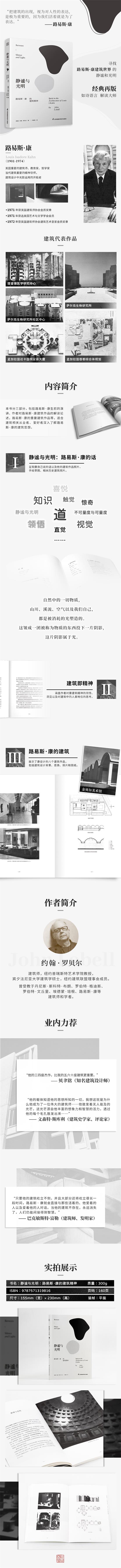《靜謐與光明:路易斯·康的建筑精神》由美國(guó)建筑師、學(xué)者約翰·羅貝爾編寫,全書以散文筆法闡述了路易斯·康的建筑精神。 本書分為三部分,“靜謐與光明:路易斯·康的話”從多個(gè)角度整理了康的演講詞,文字優(yōu)美,充滿哲學(xué)味道和詩(shī)意;“建筑即精神”為作者對(duì)康代表的建筑精神的領(lǐng)悟,從建筑內(nèi)部一一講述,并附有建筑照片和圖紙; “路易斯·康的建筑”介紹了康的八個(gè)代表作品,作為康建筑思想的體現(xiàn),簡(jiǎn)潔直觀,磅礴大氣,神秘悠遠(yuǎn)。